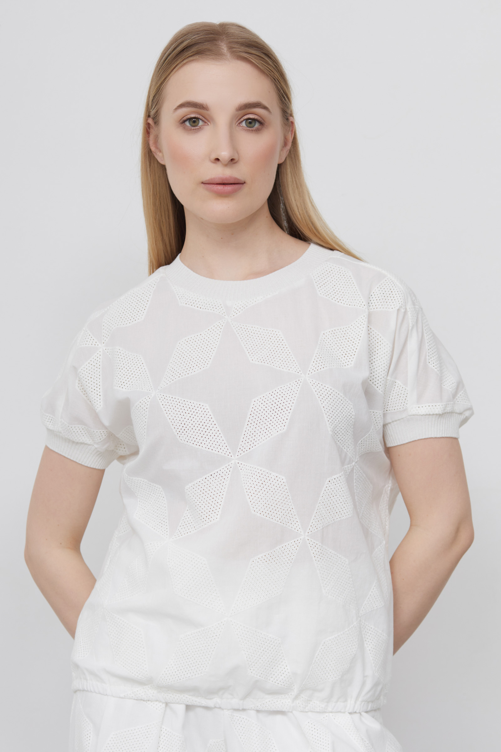 Блуза из тонкого хлопка с перфорированными вязаными вставками.