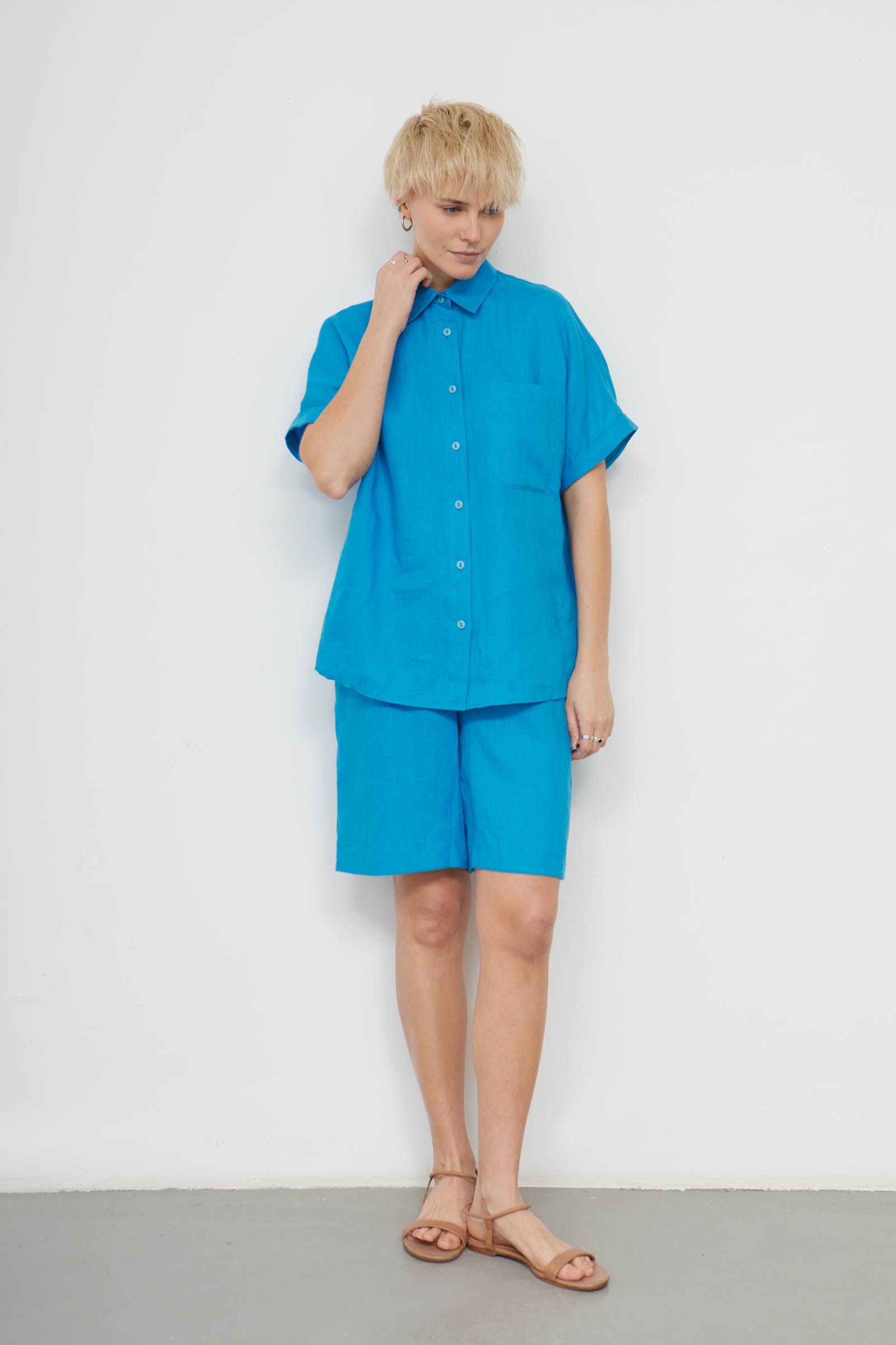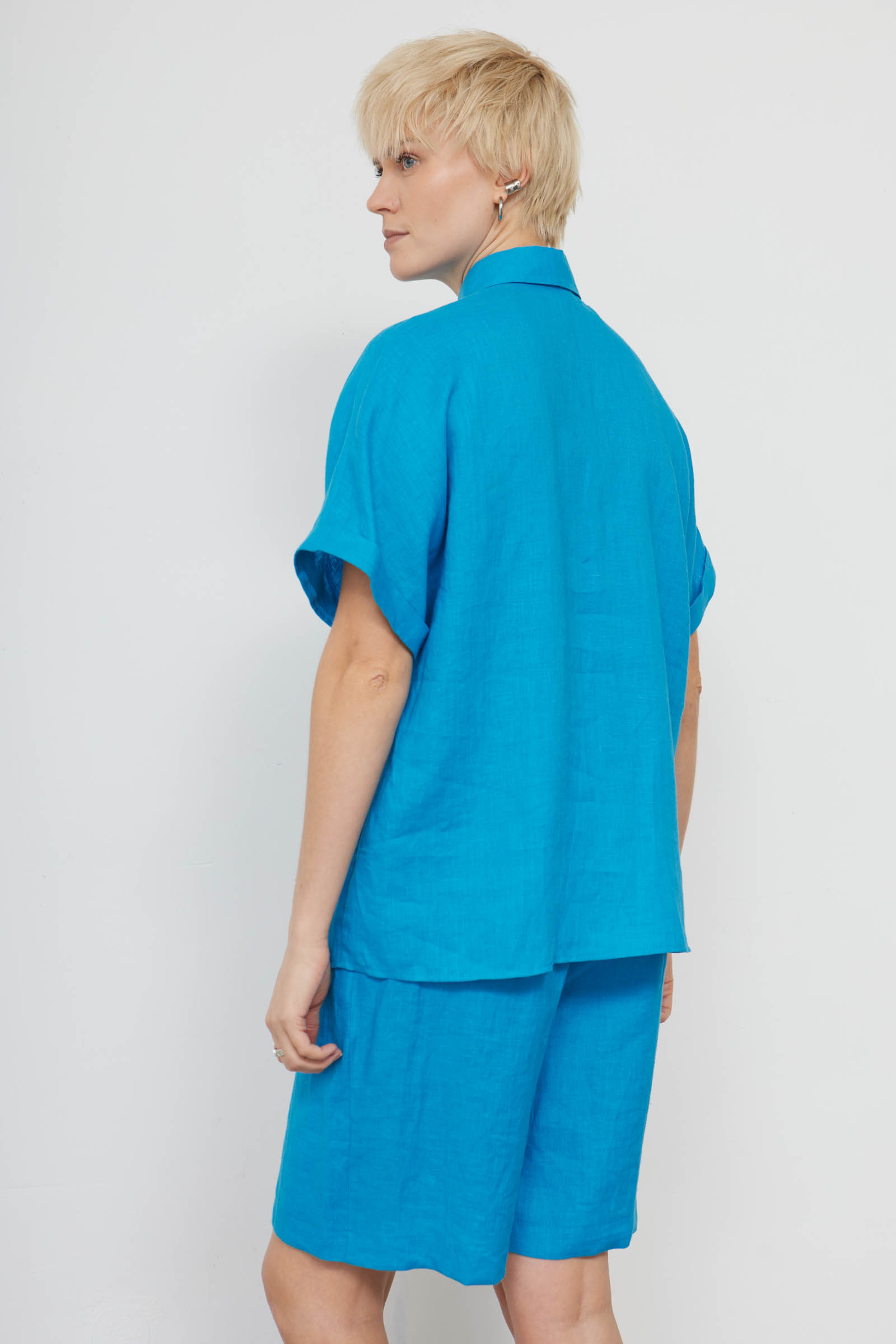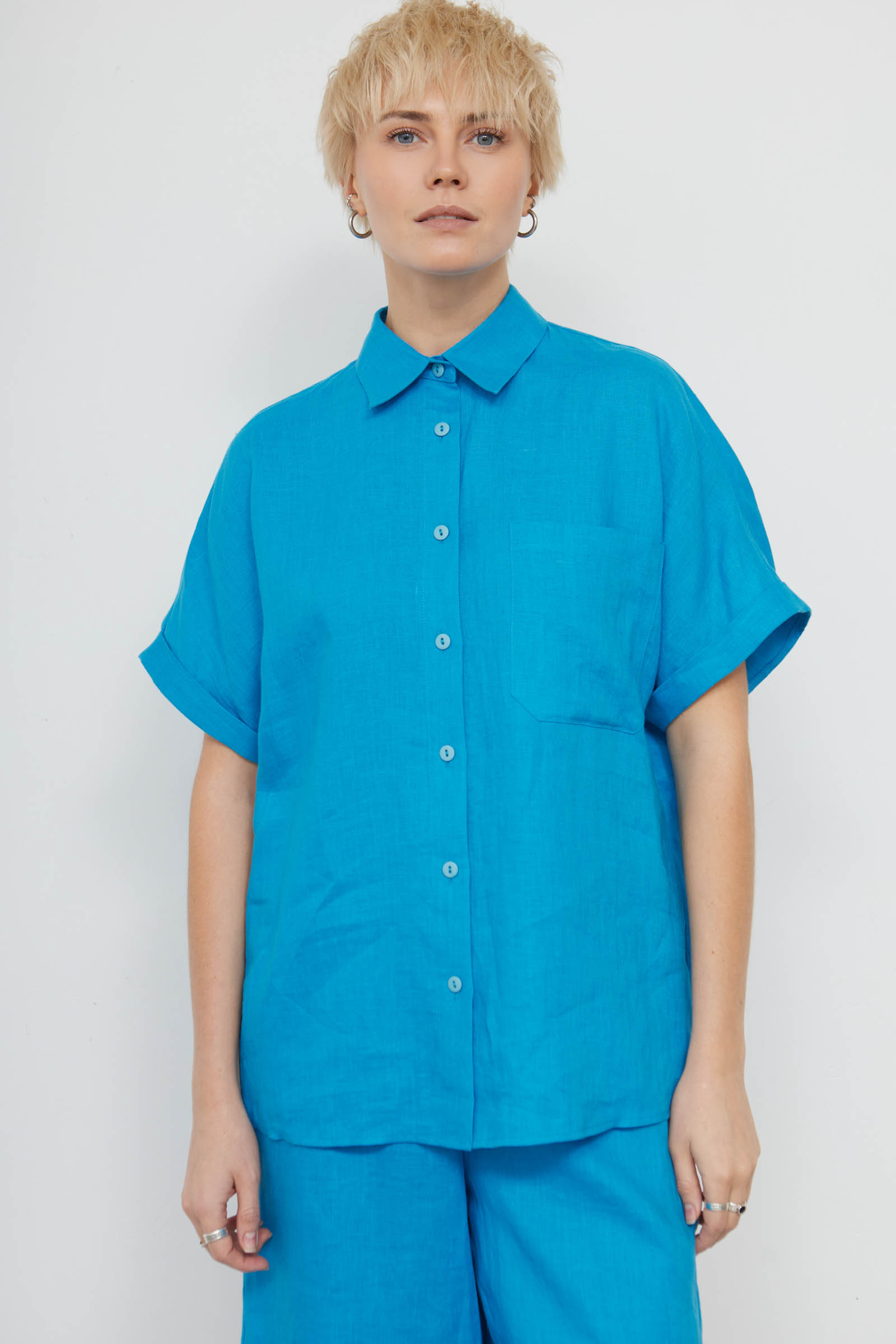 Базовая рубашка оверсайз изо льна с короткими рукавами.