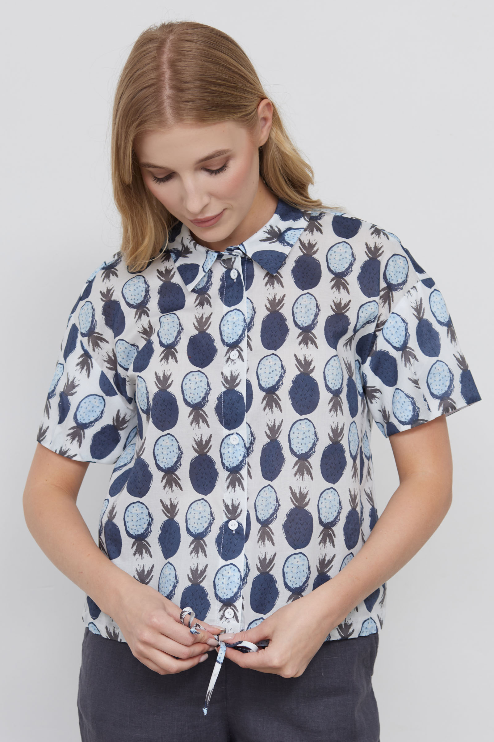Укороченная рубашка из тонкого хлопка с фантазийным принтом и короткими рукавами.