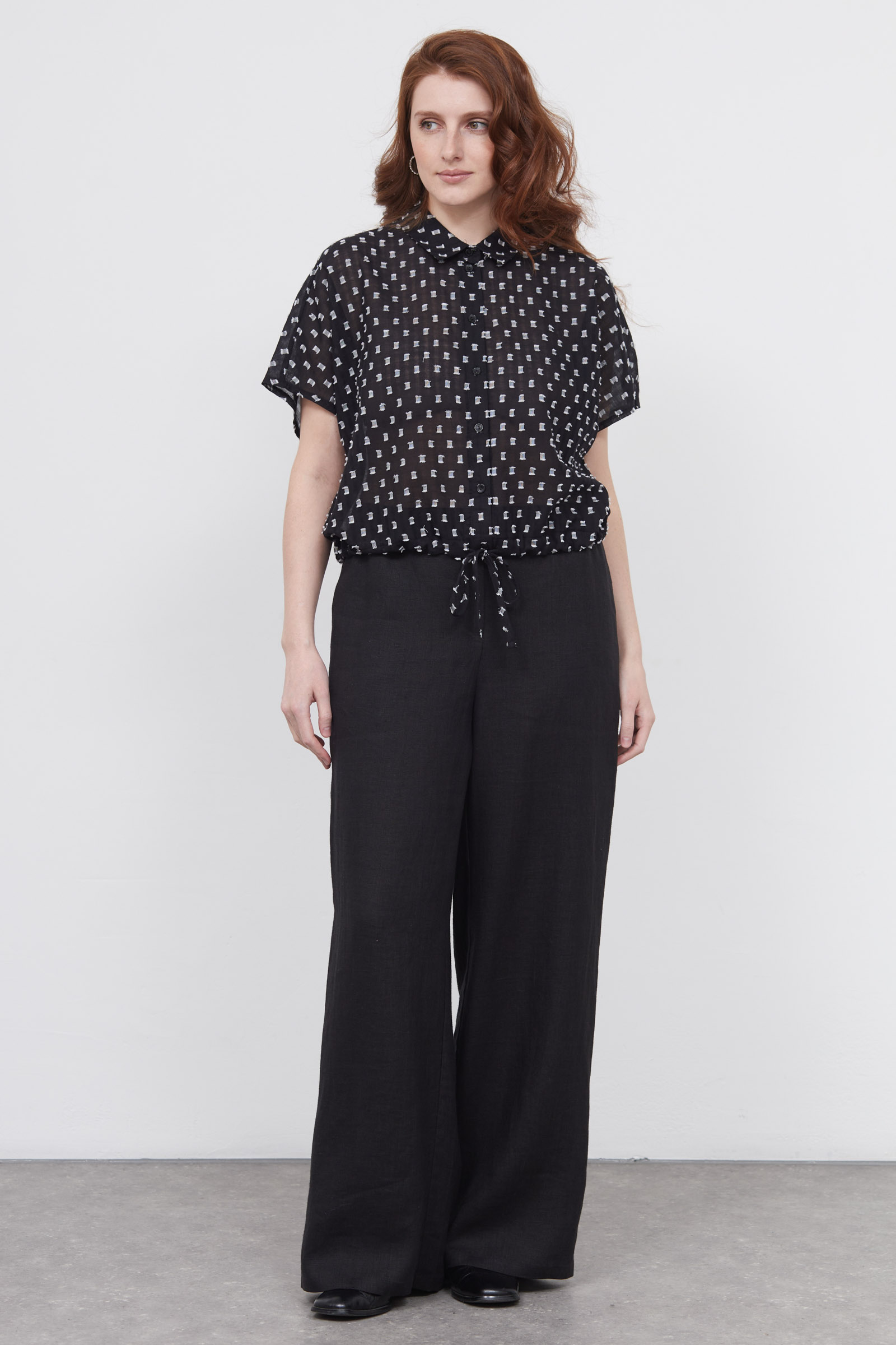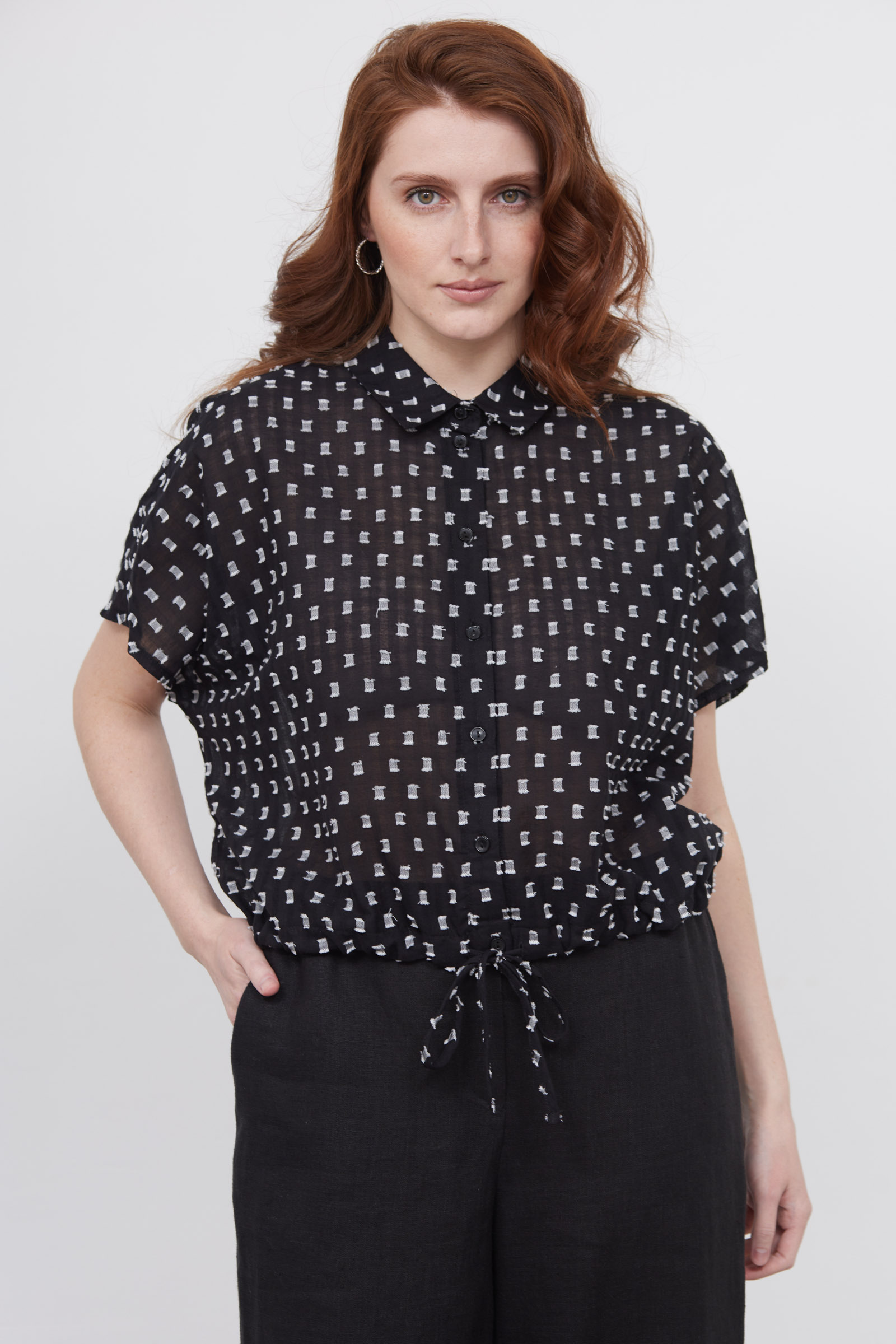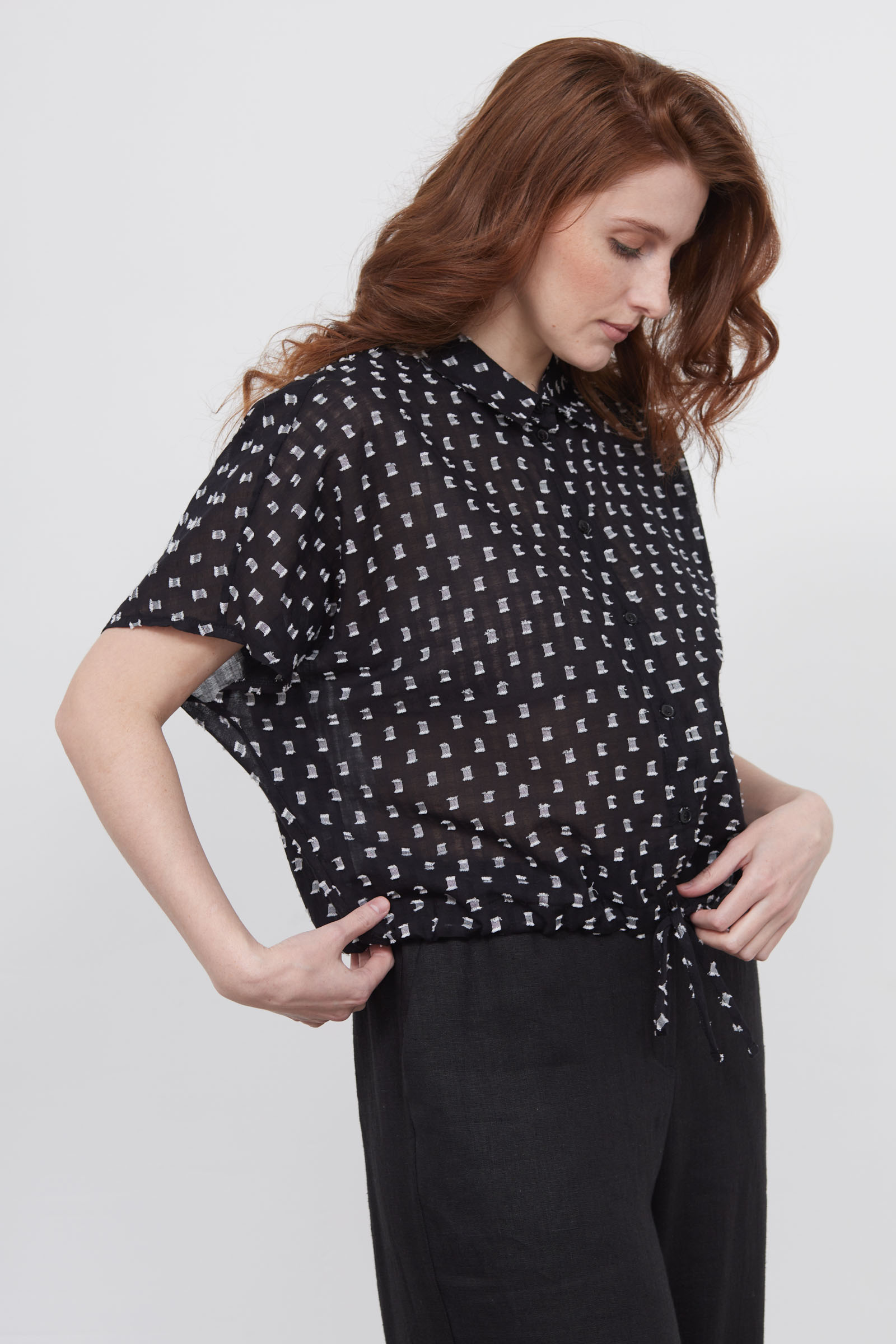 Укороченная блузка оверсайз из легкого хлопка с фактурным принтом.