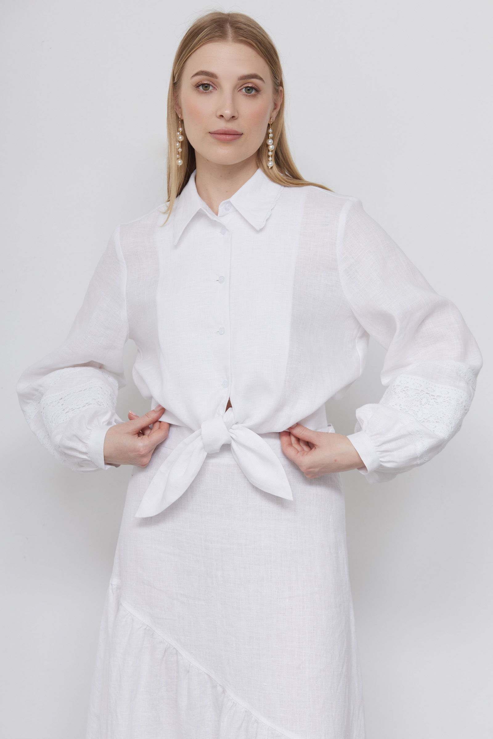 Укороченная блузка изо льна в стиле рустик с завязками и кружевом на рукавах.