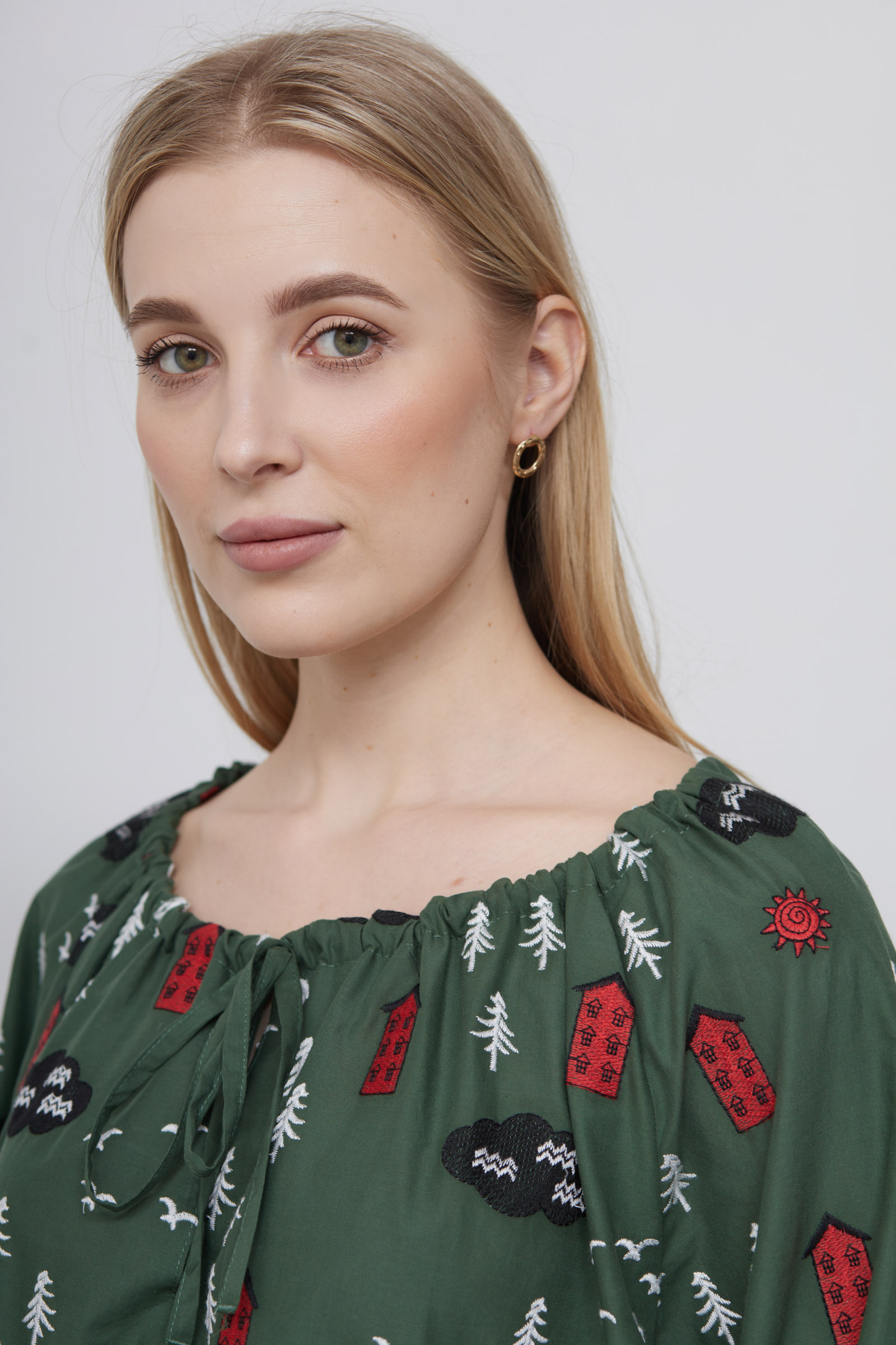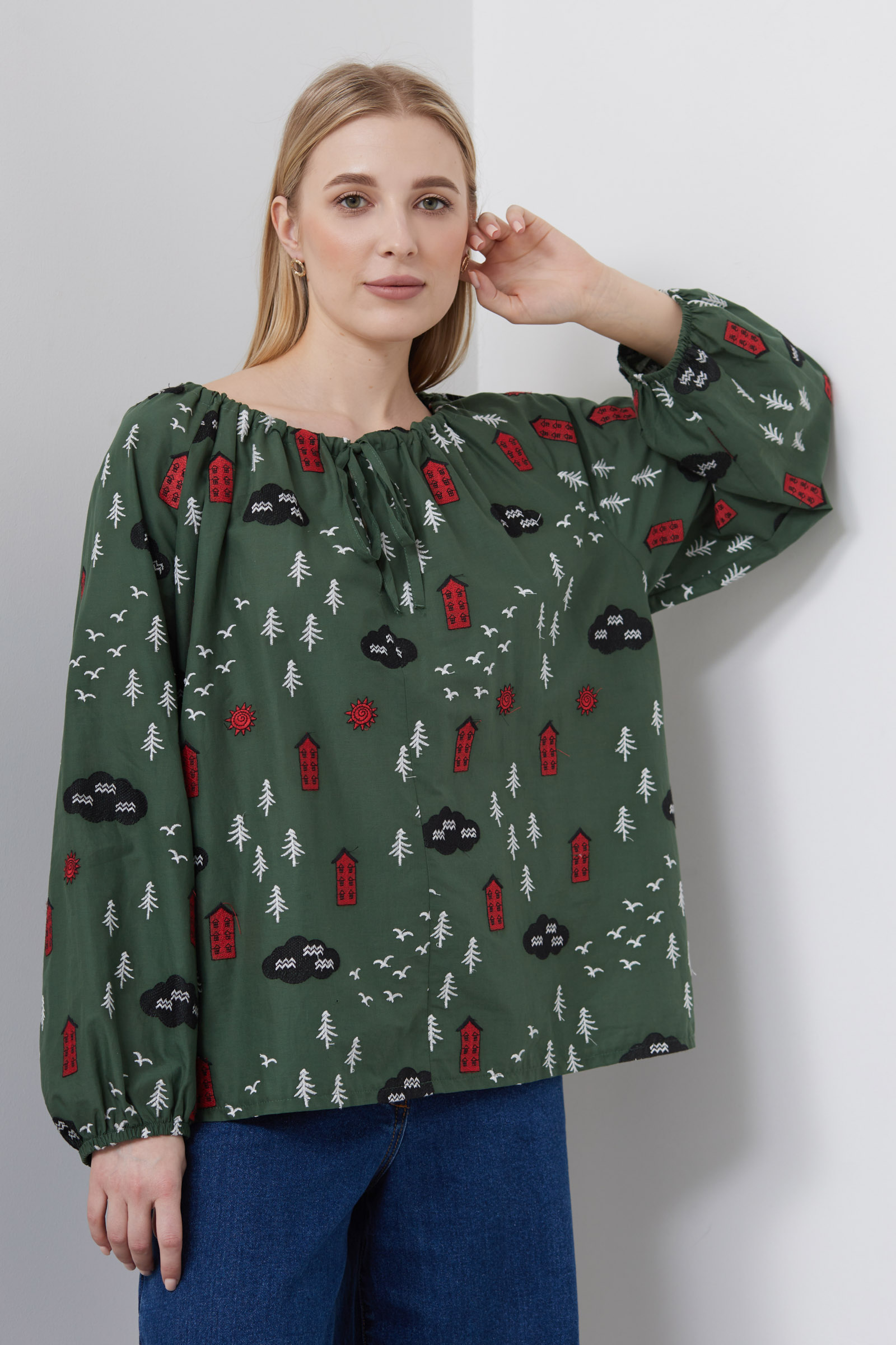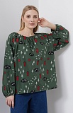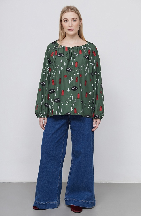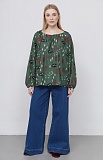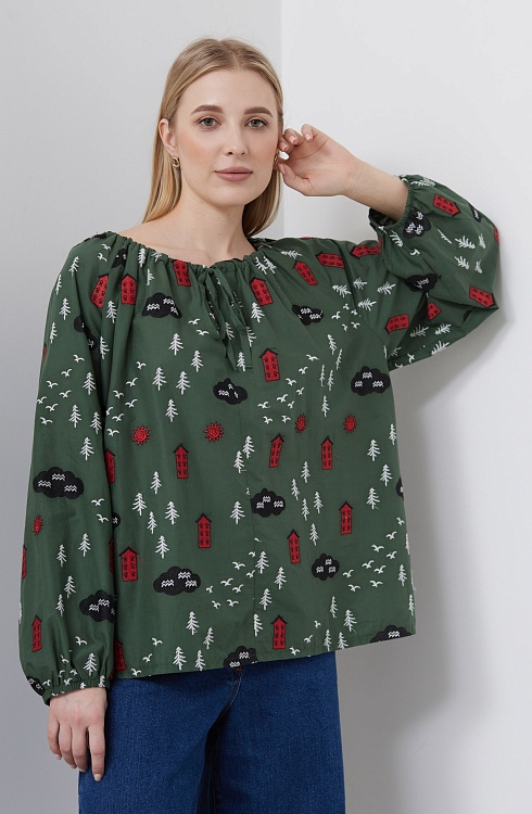 Блузка oversize из хлопка с вышивкой и сборкой на горловине.