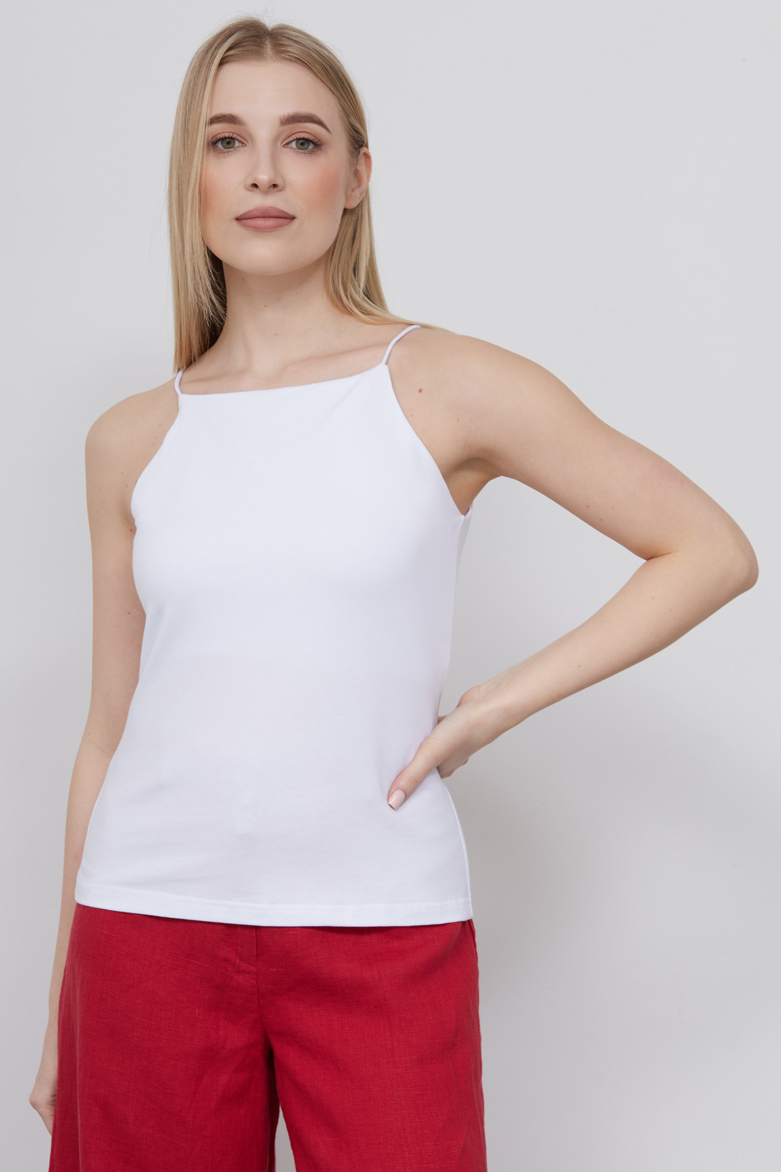Топ из мягкого хлопкового трикотажа на тонких бретелях.