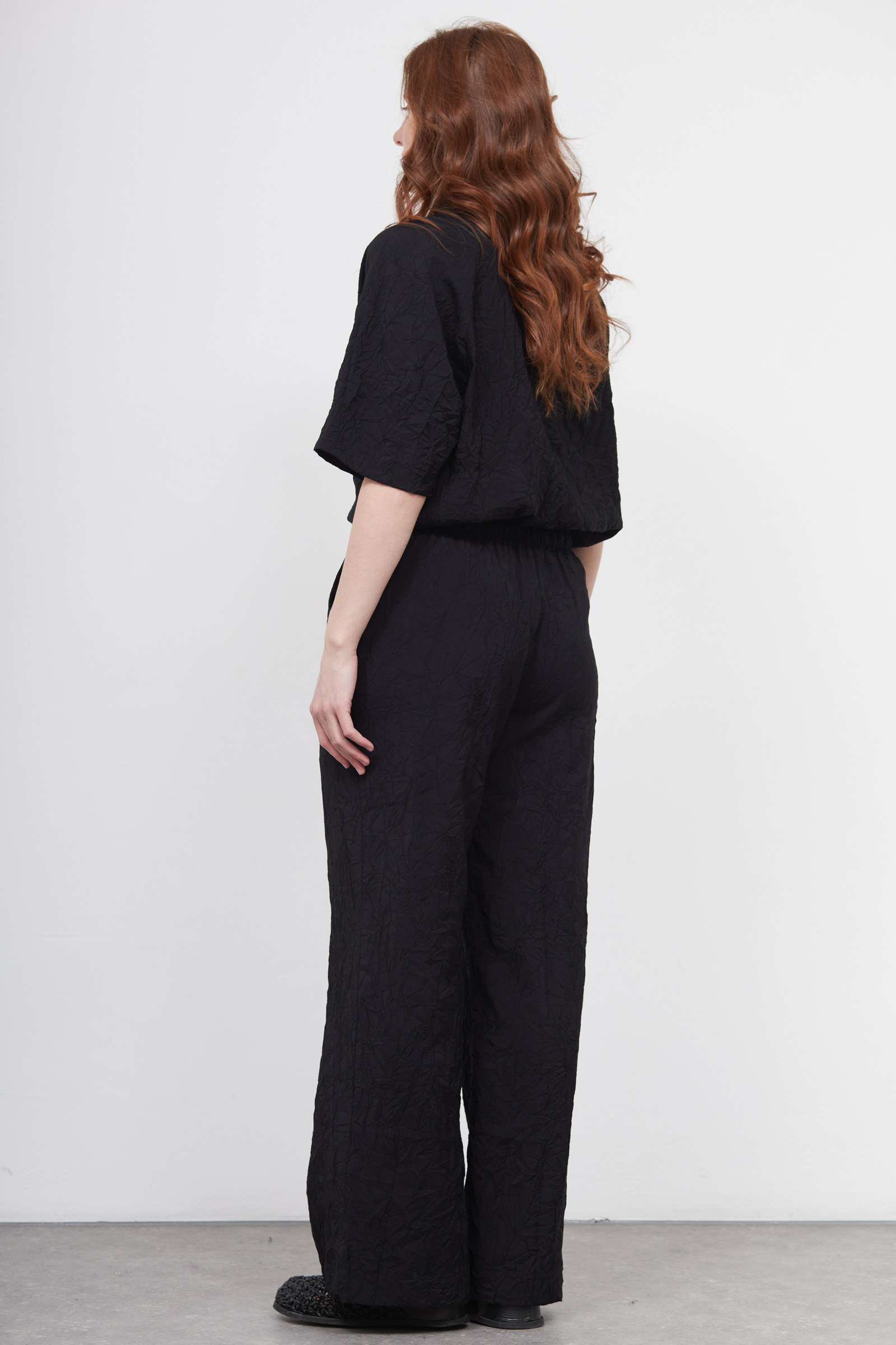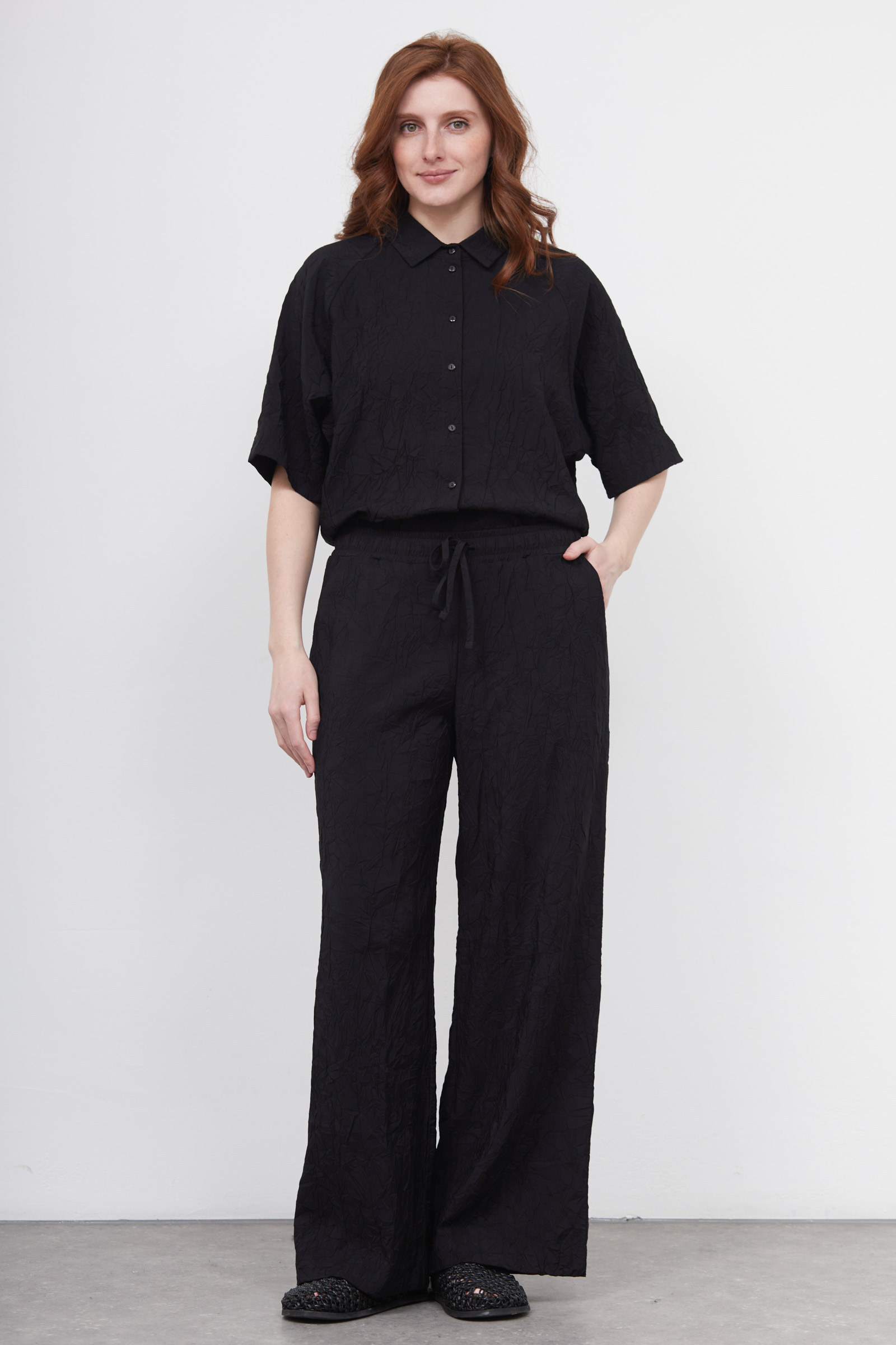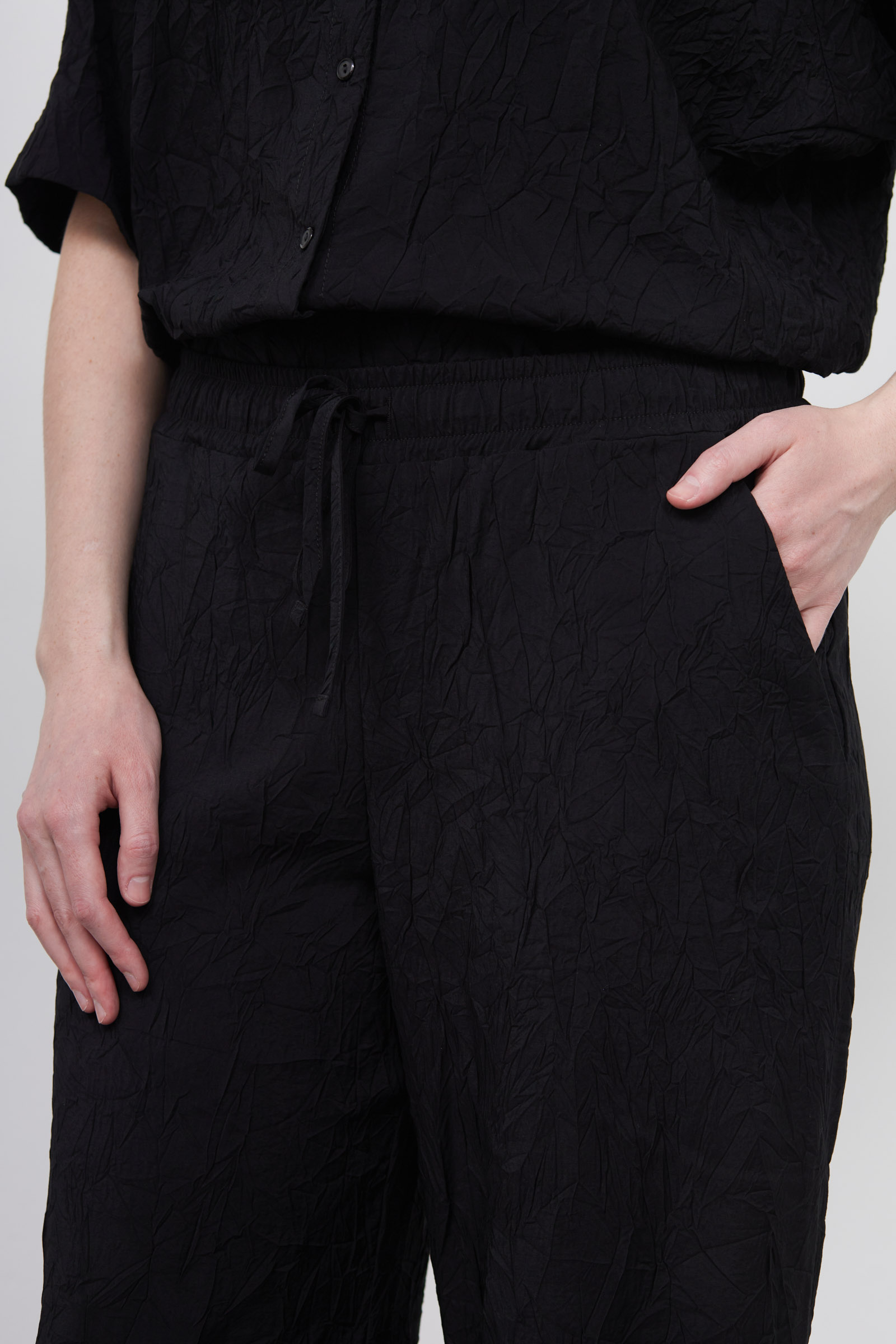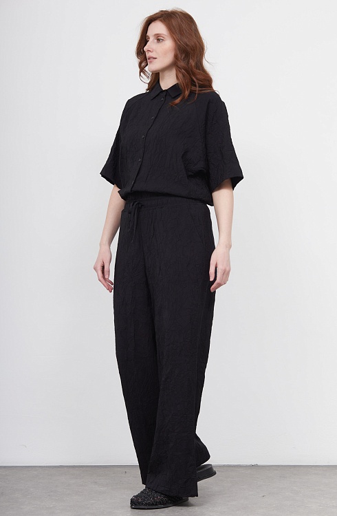 Широкие брюки из жатой вискозы на эластичном поясе с кулиской.