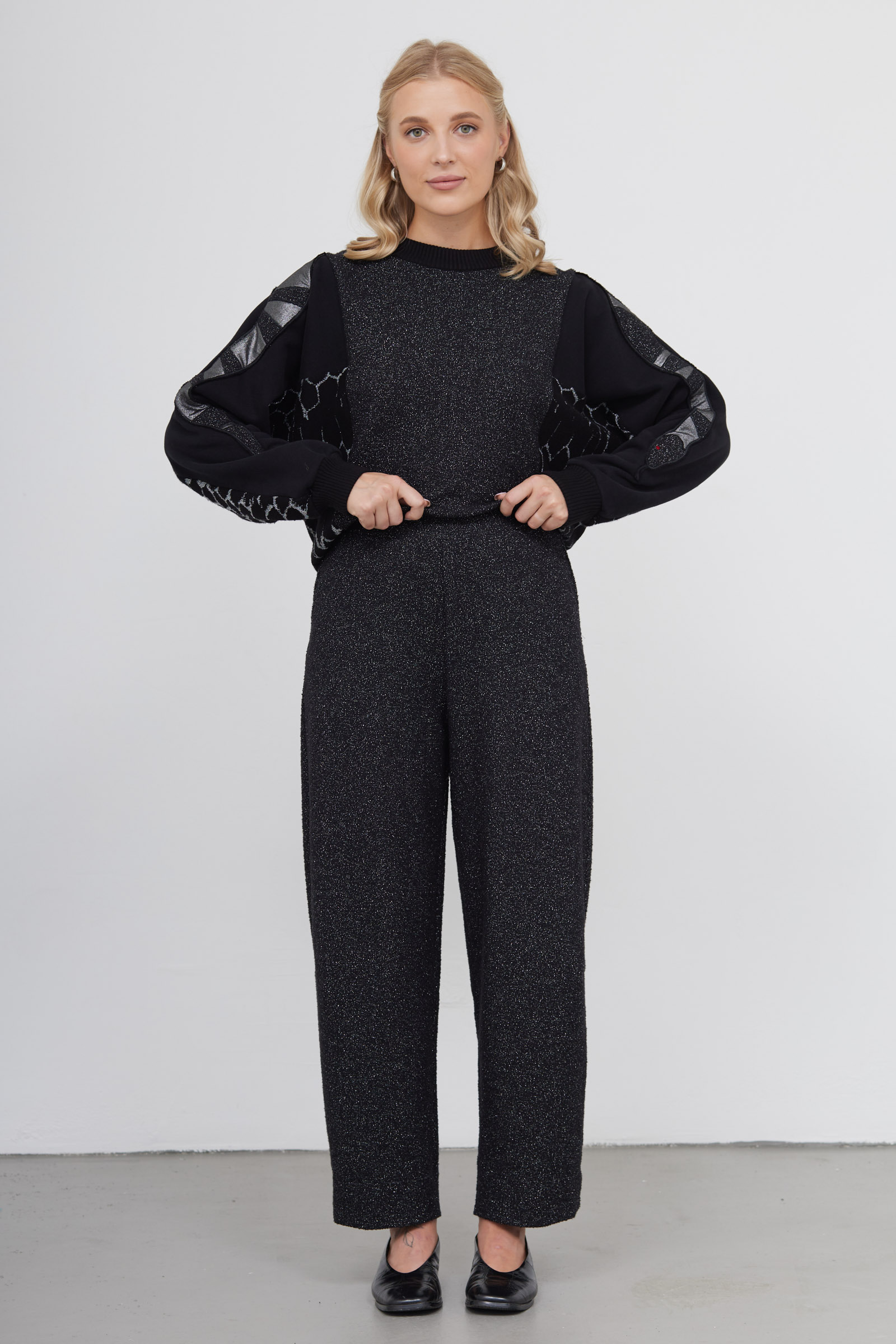 Объемные брюки из мягкого трикотажа с люрексом.
