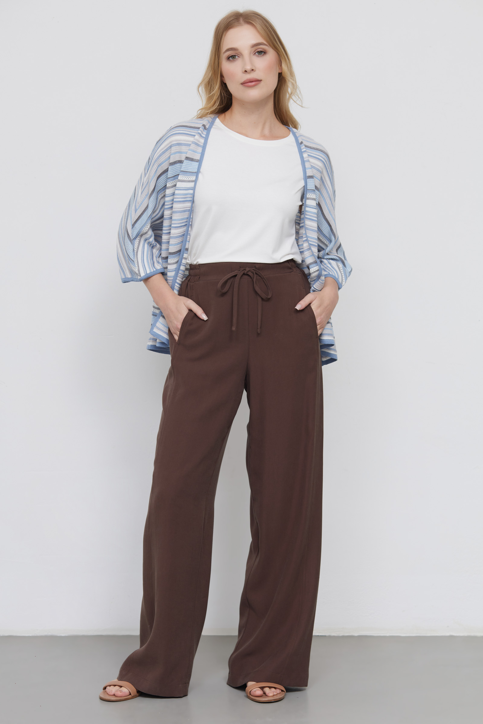 Широкие брюки из вискозы на эластичном поясе с кулиской.