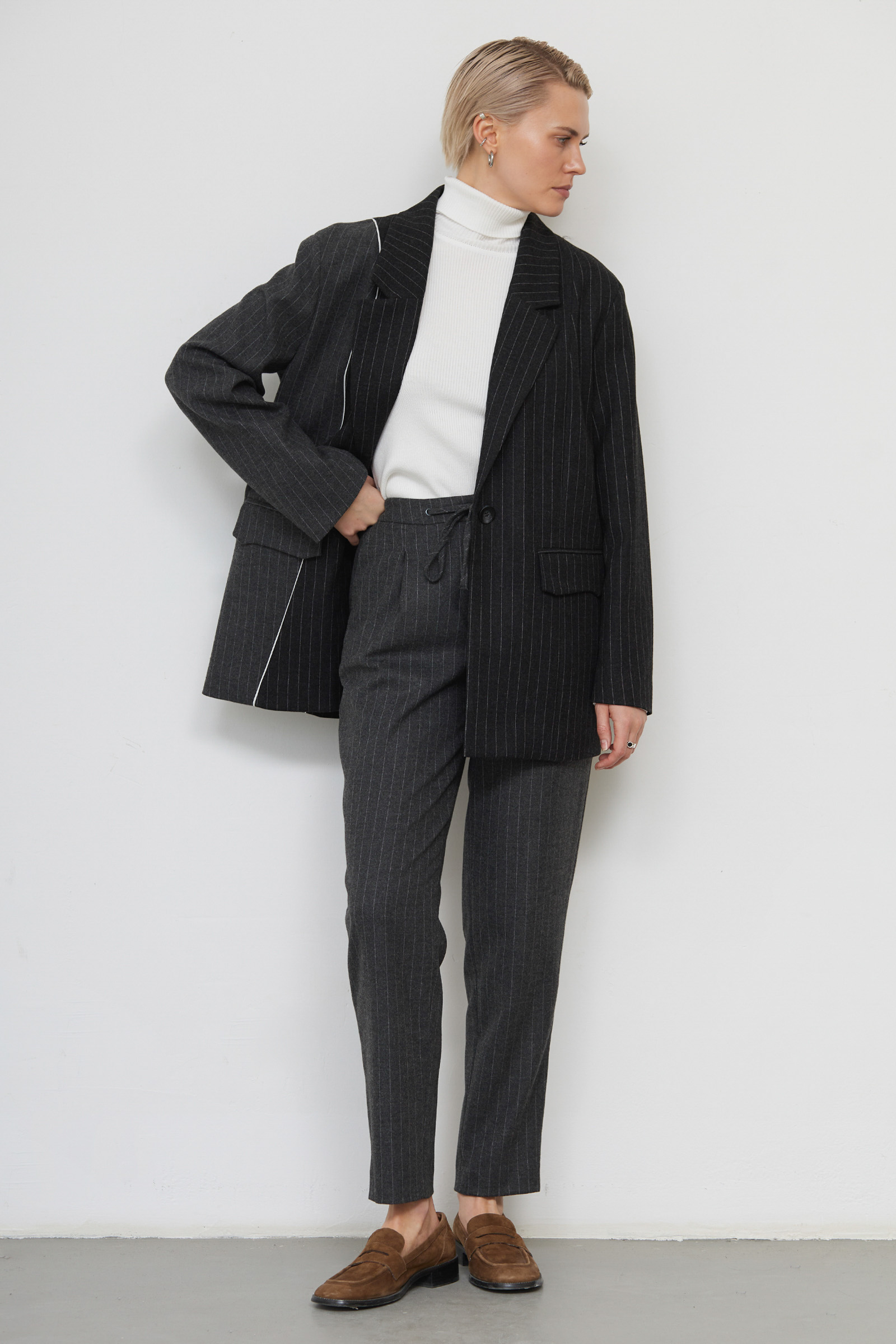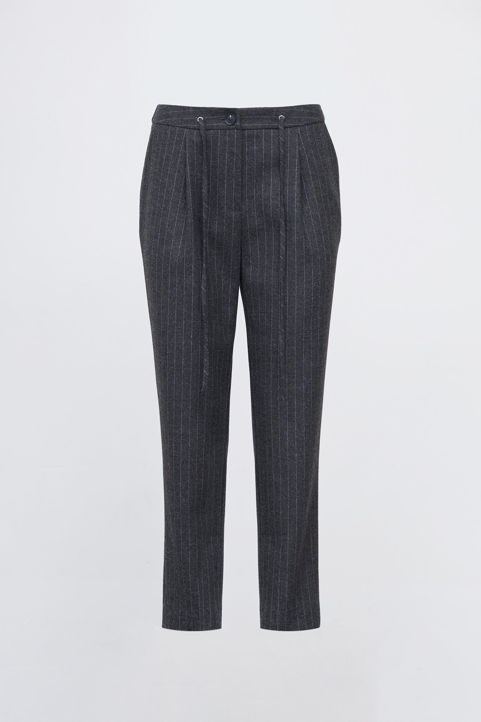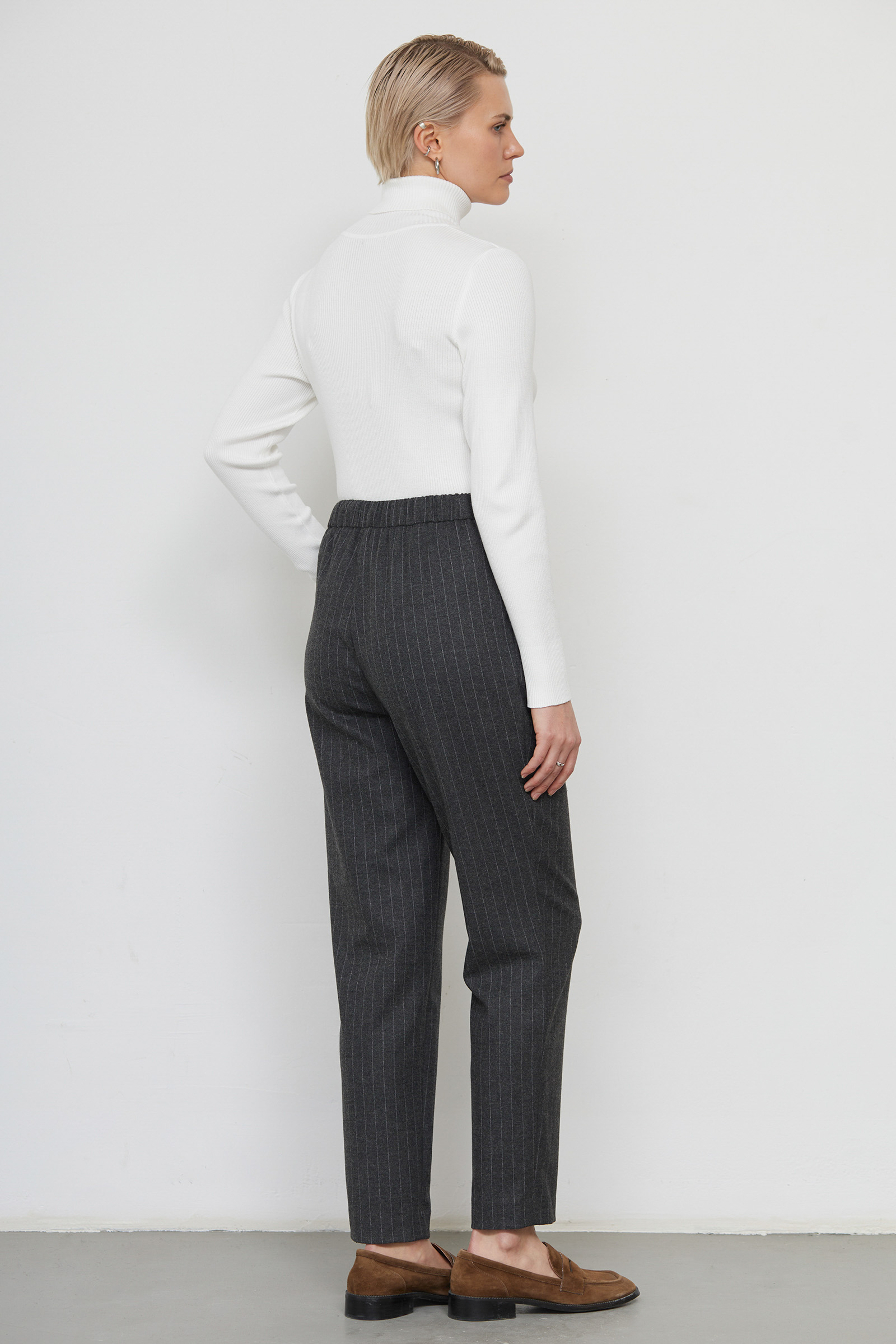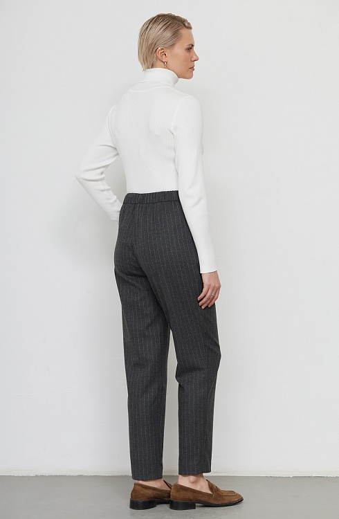 Слегка зауженные брюки в полоску из мягкой костюмной ткани с шерстью.
