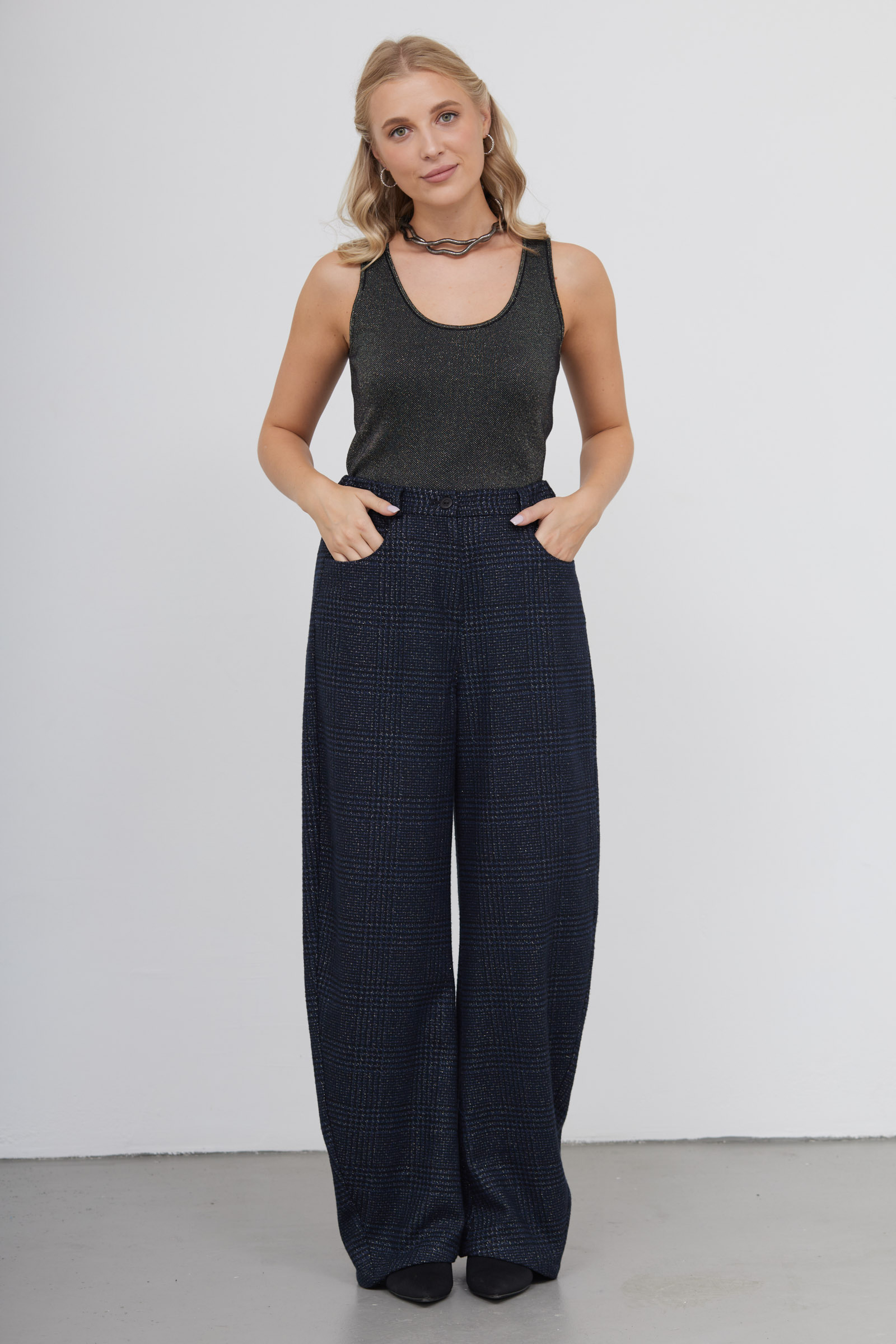 Объемные брюки из мягкой костюмной ткани в клетку с люрексом.