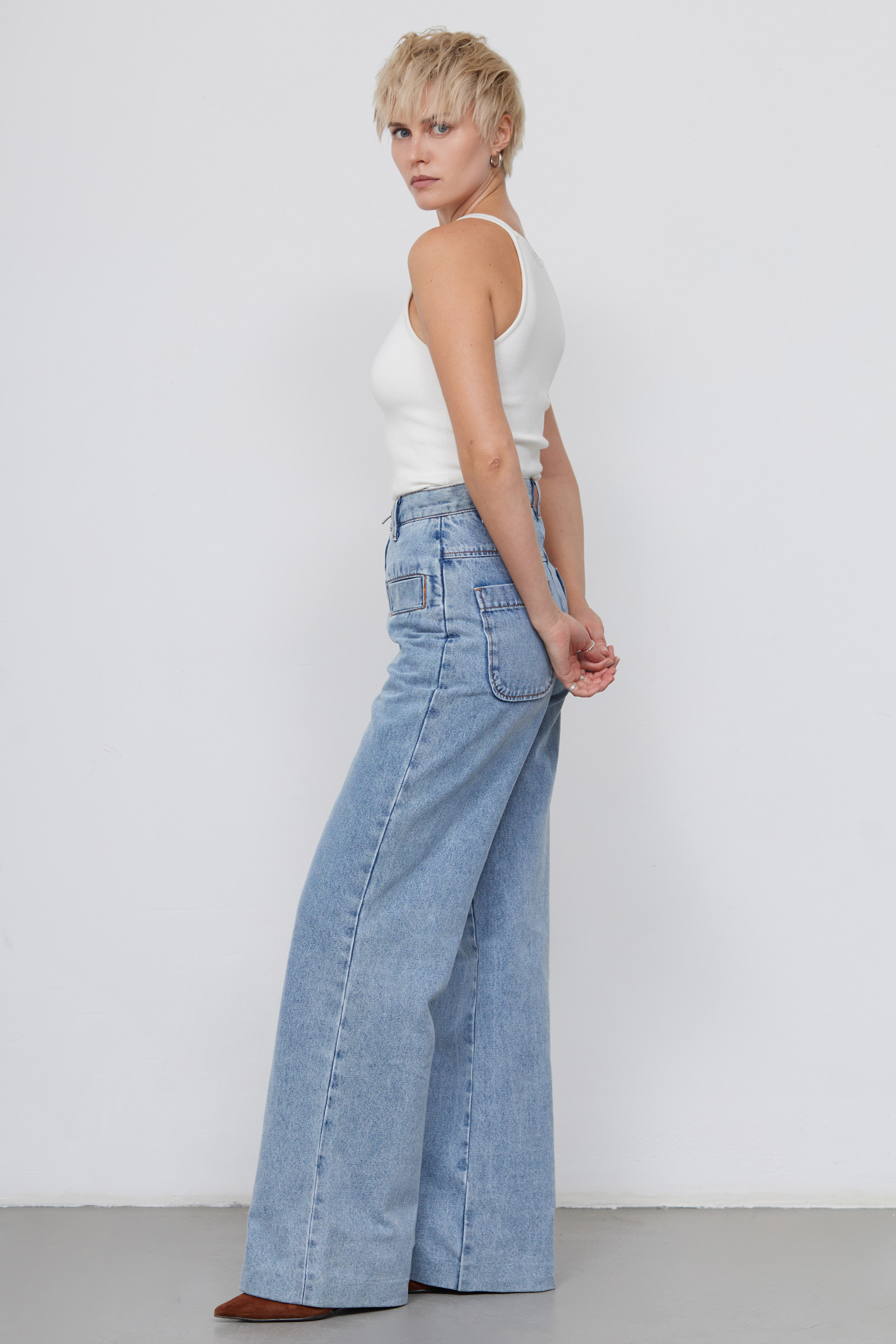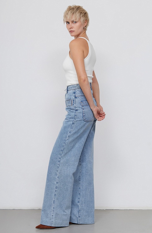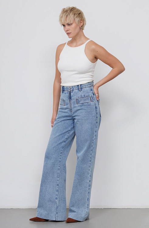 Широкие джинсы из плотного денима с акцентными карманами и открытой молнией.