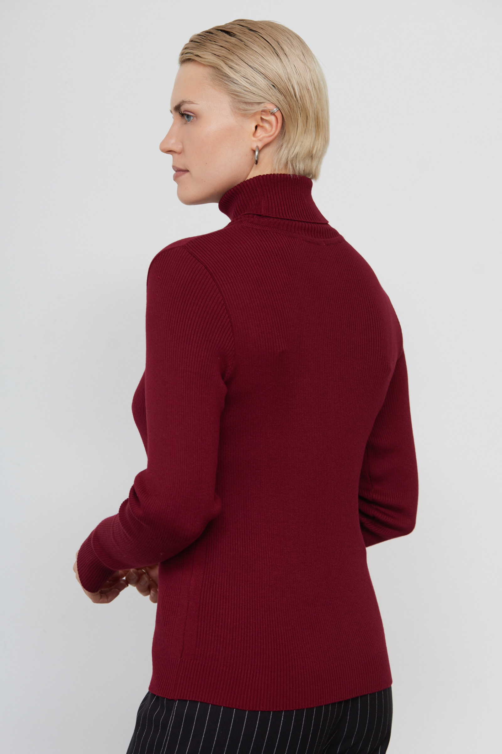 Базовая водолазка из мягкого вискозного трикотажа в рубчик.