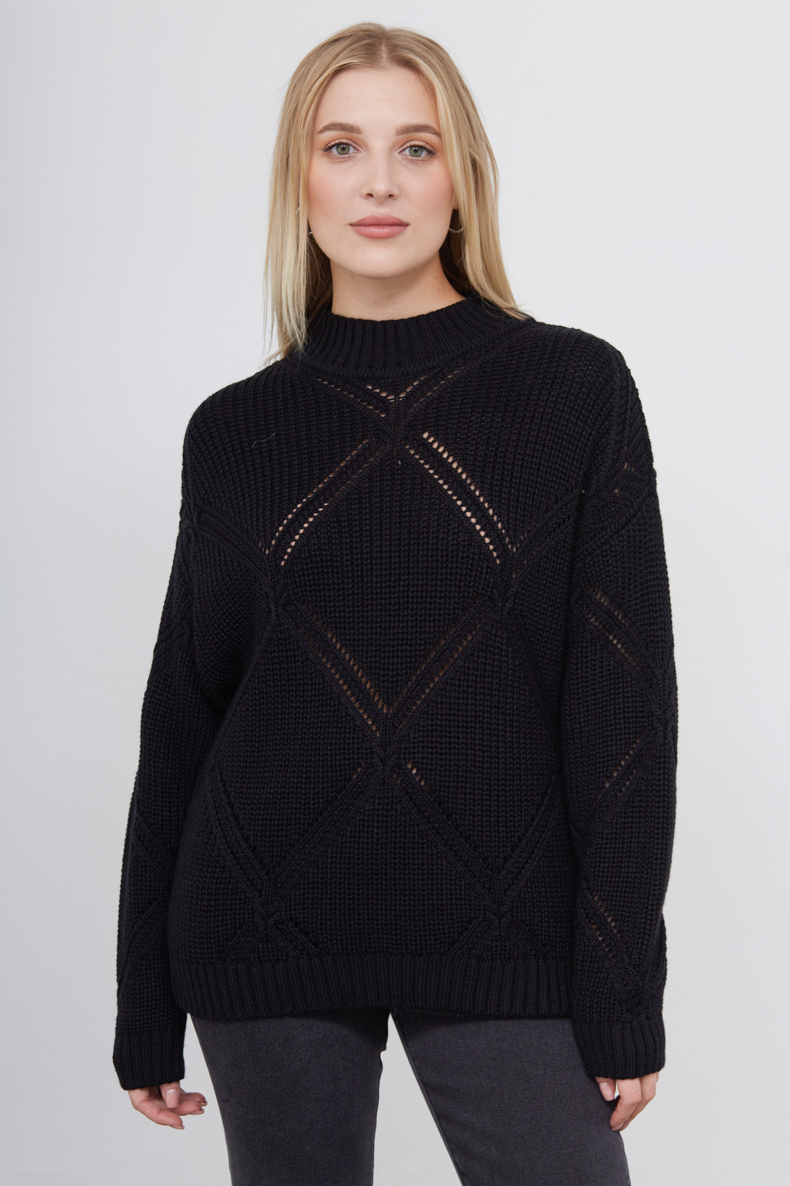 Свитер oversize ажурной вязки с высоким воротником.