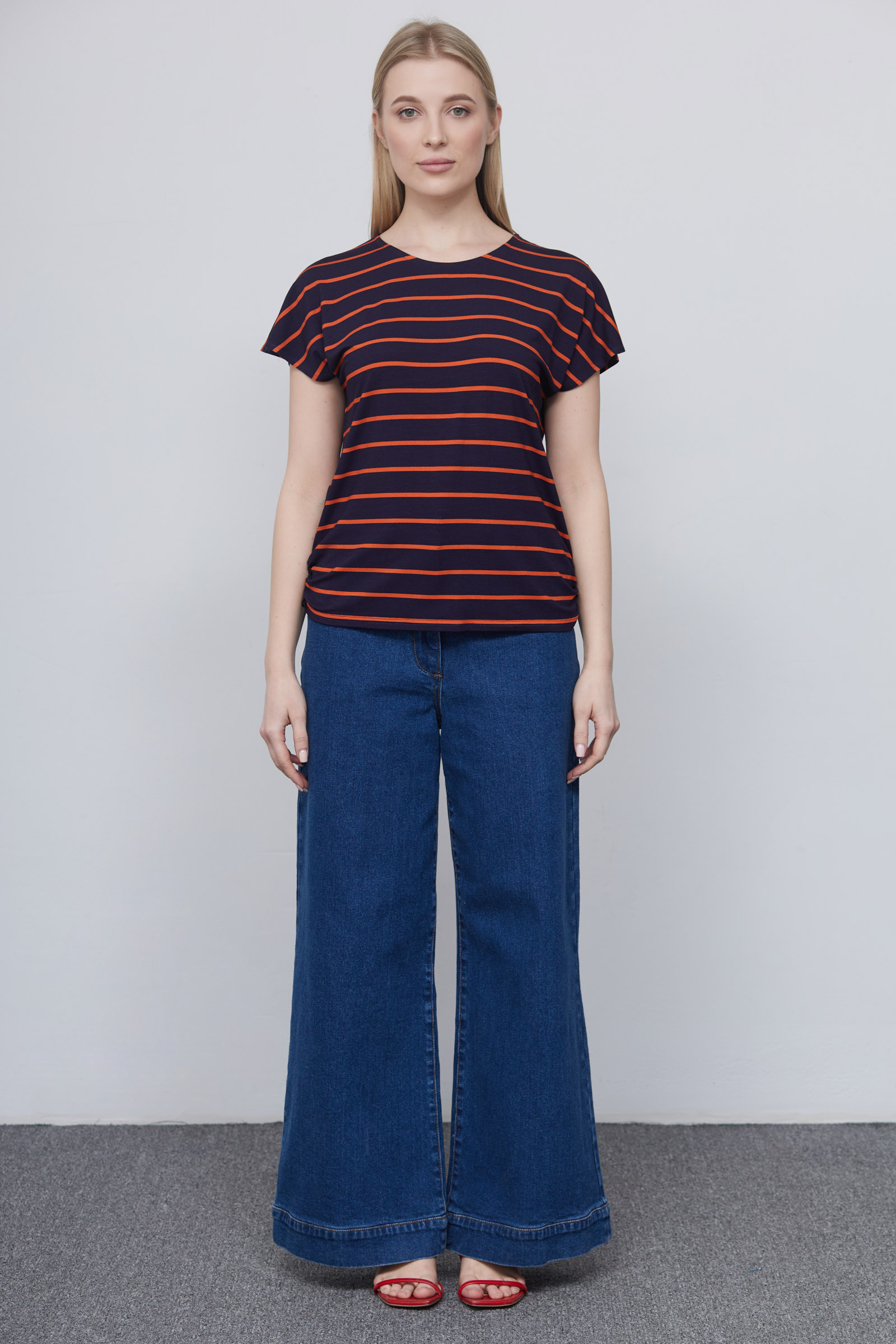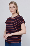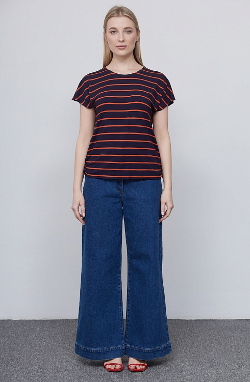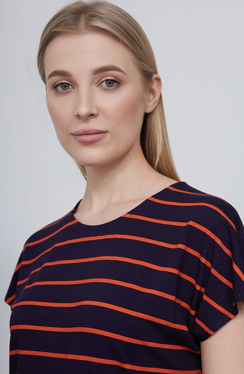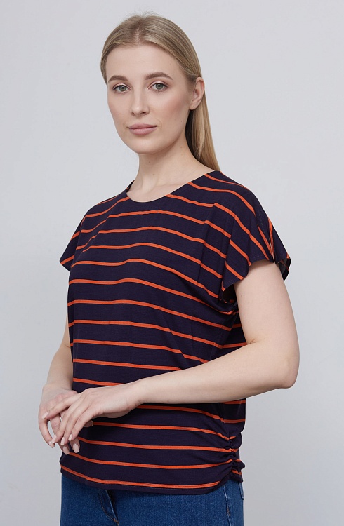 Футболка из вискозного трикотажа в контрастную полоску с разрезами на плечах и сборкой по бокам.