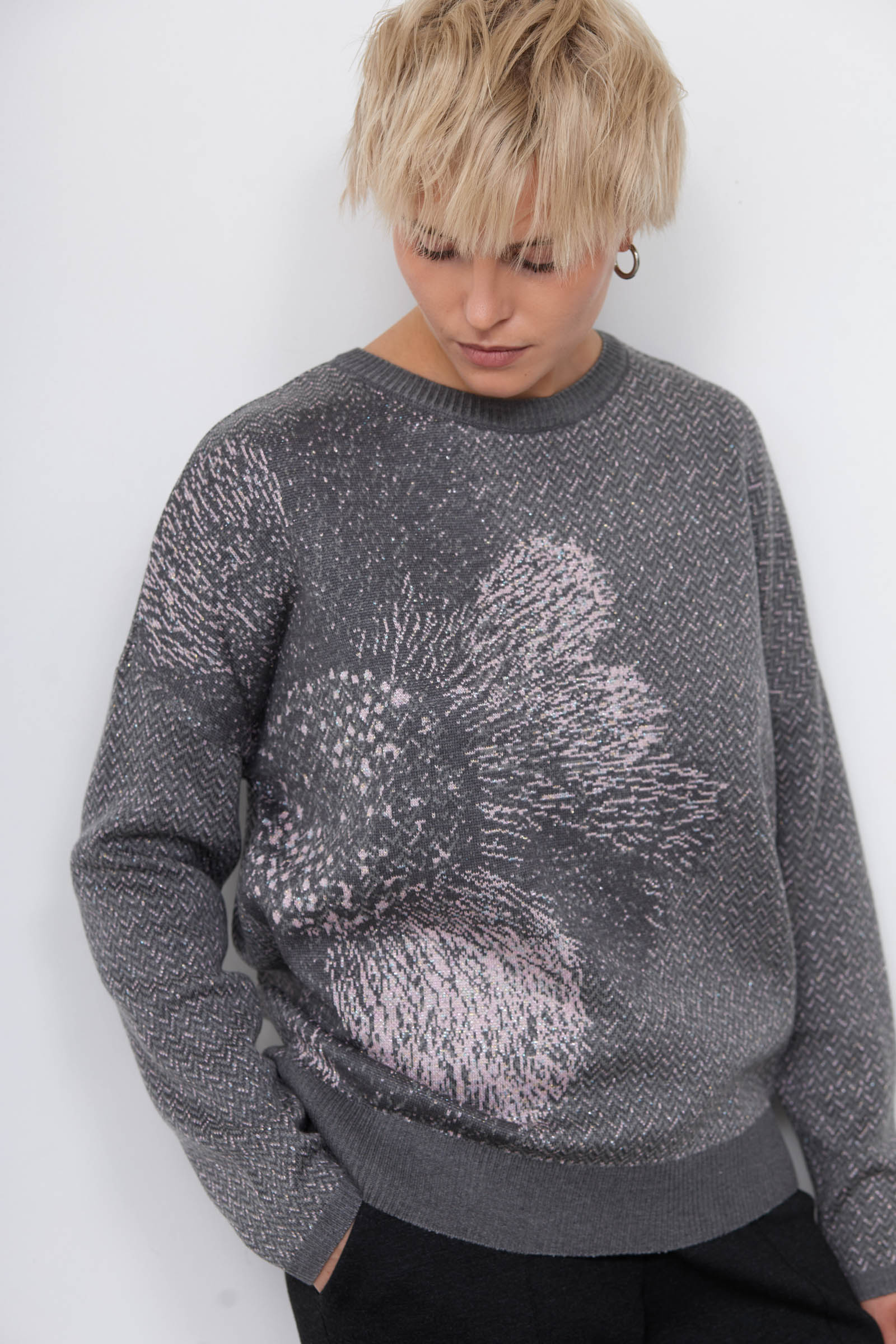 Джемпер жаккардовой вязки в елочку с рисунком в виде цветка.