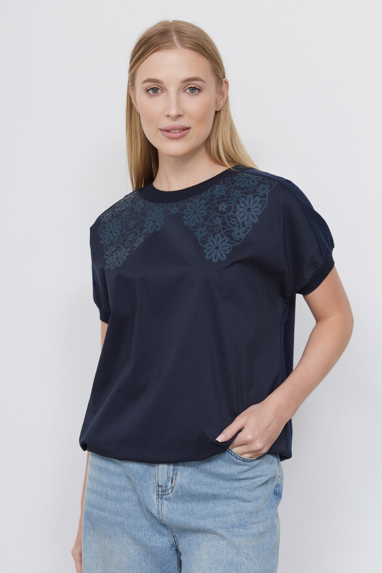 Комбинированная блуза из хлопка с принтом в виде кружевного воротника и трикотажной отделкой.