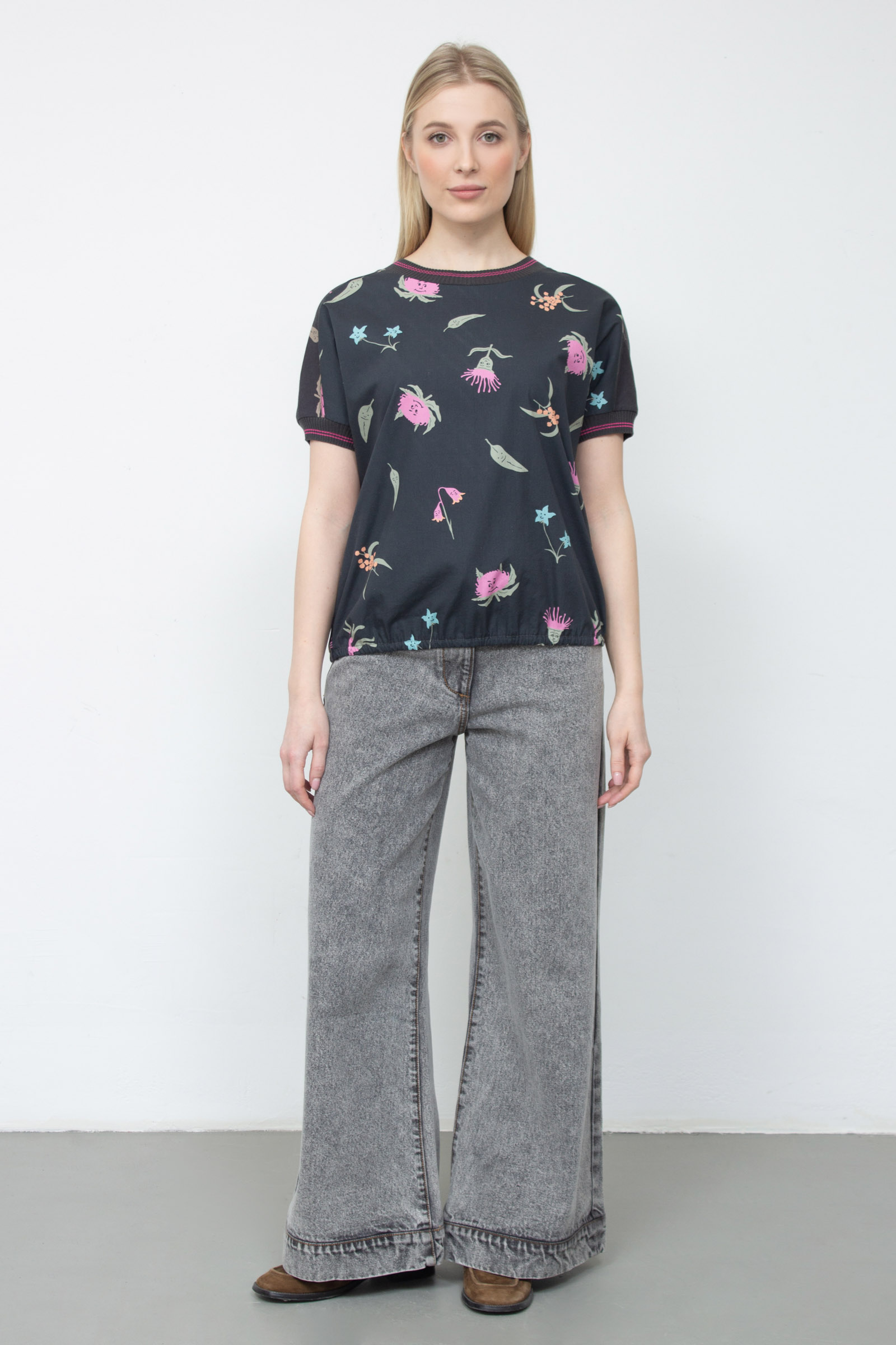 Комбинированная блуза из хлопка с фантазийным принтом и трикотажной отделкой.