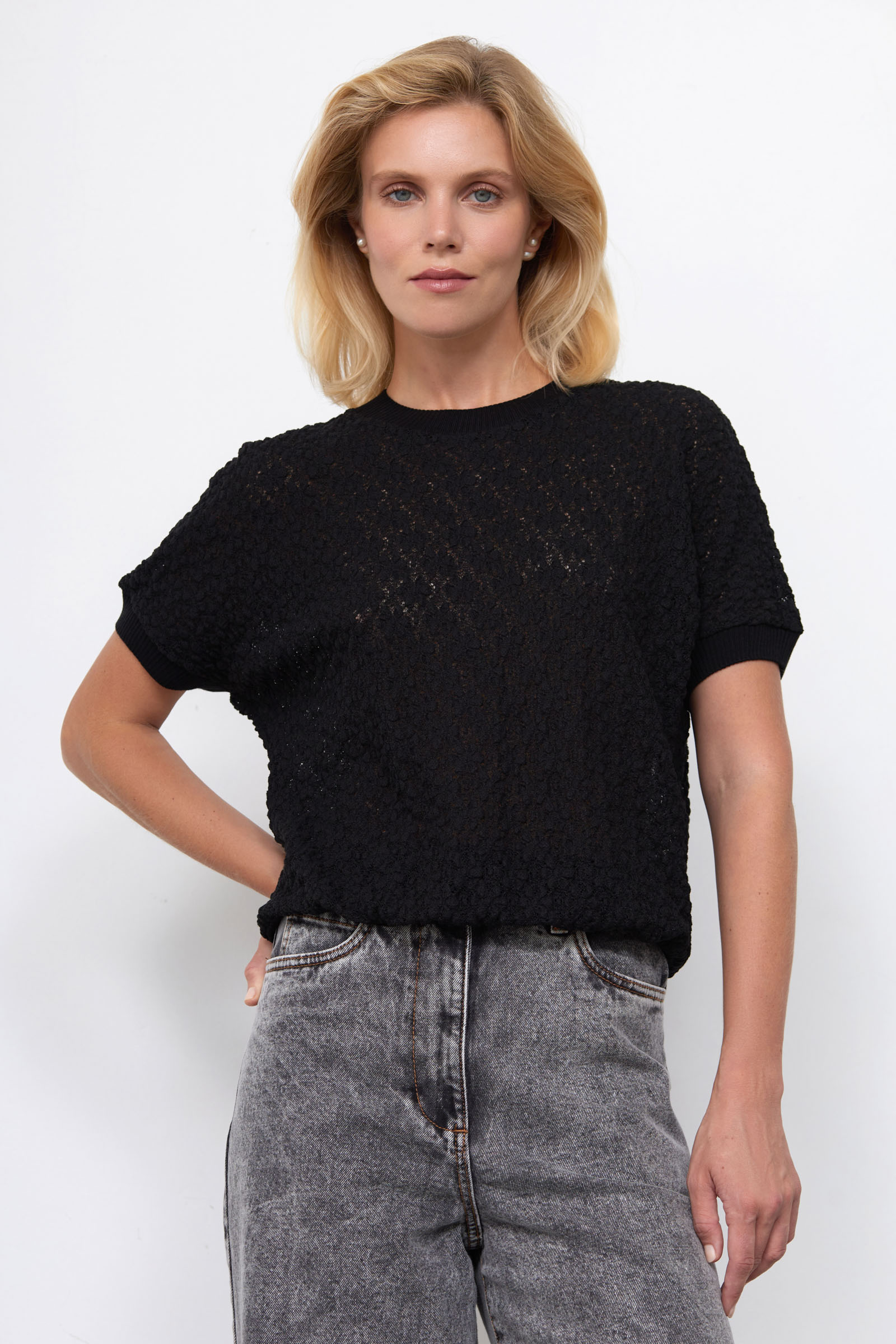 Блуза из кружевного премиум гипюра с трикотажной отделкой.