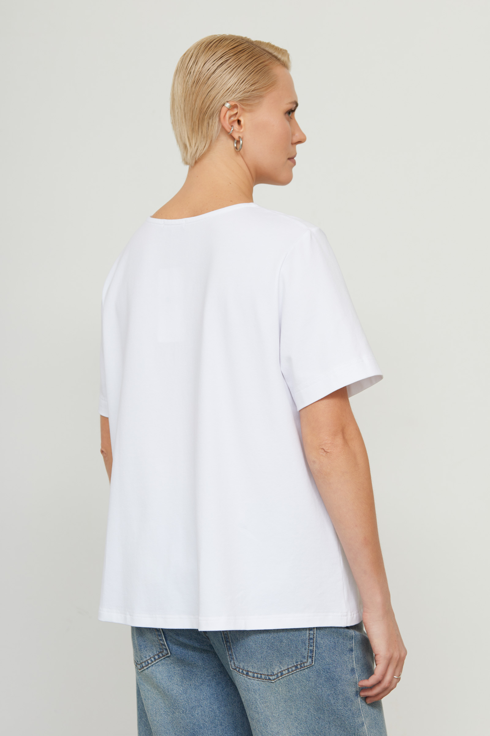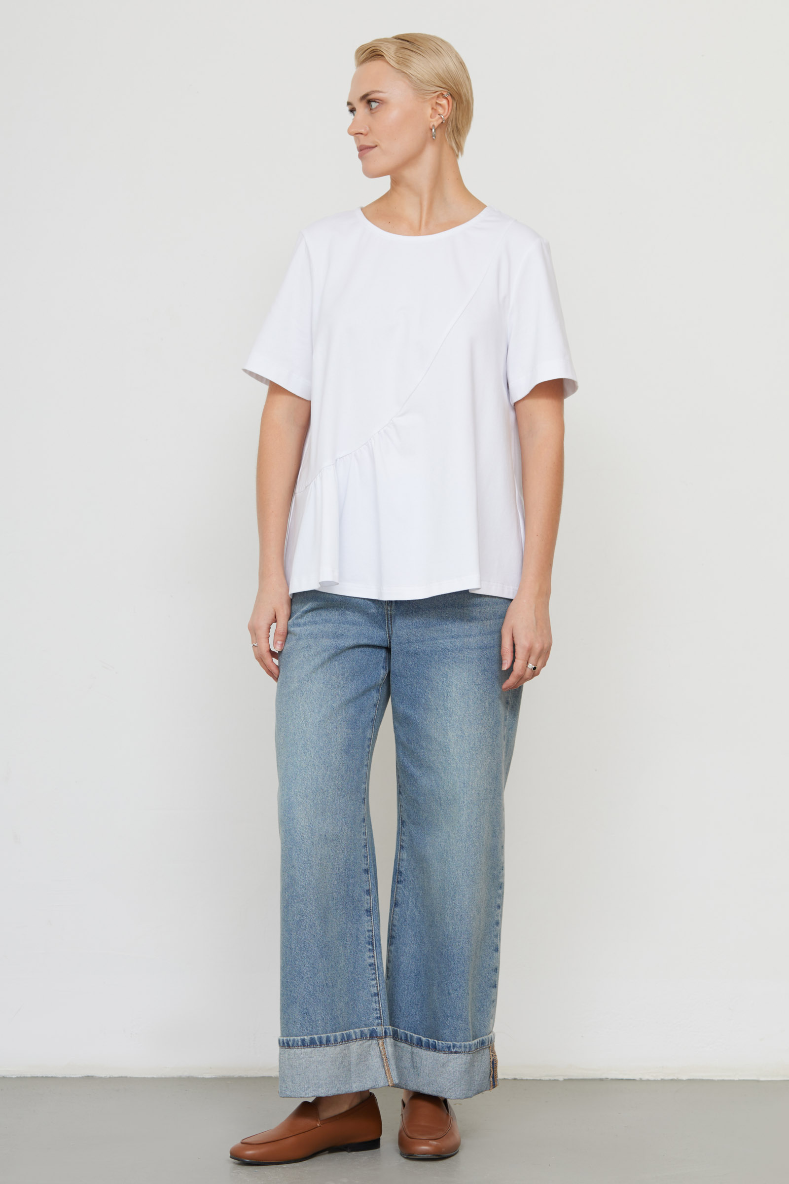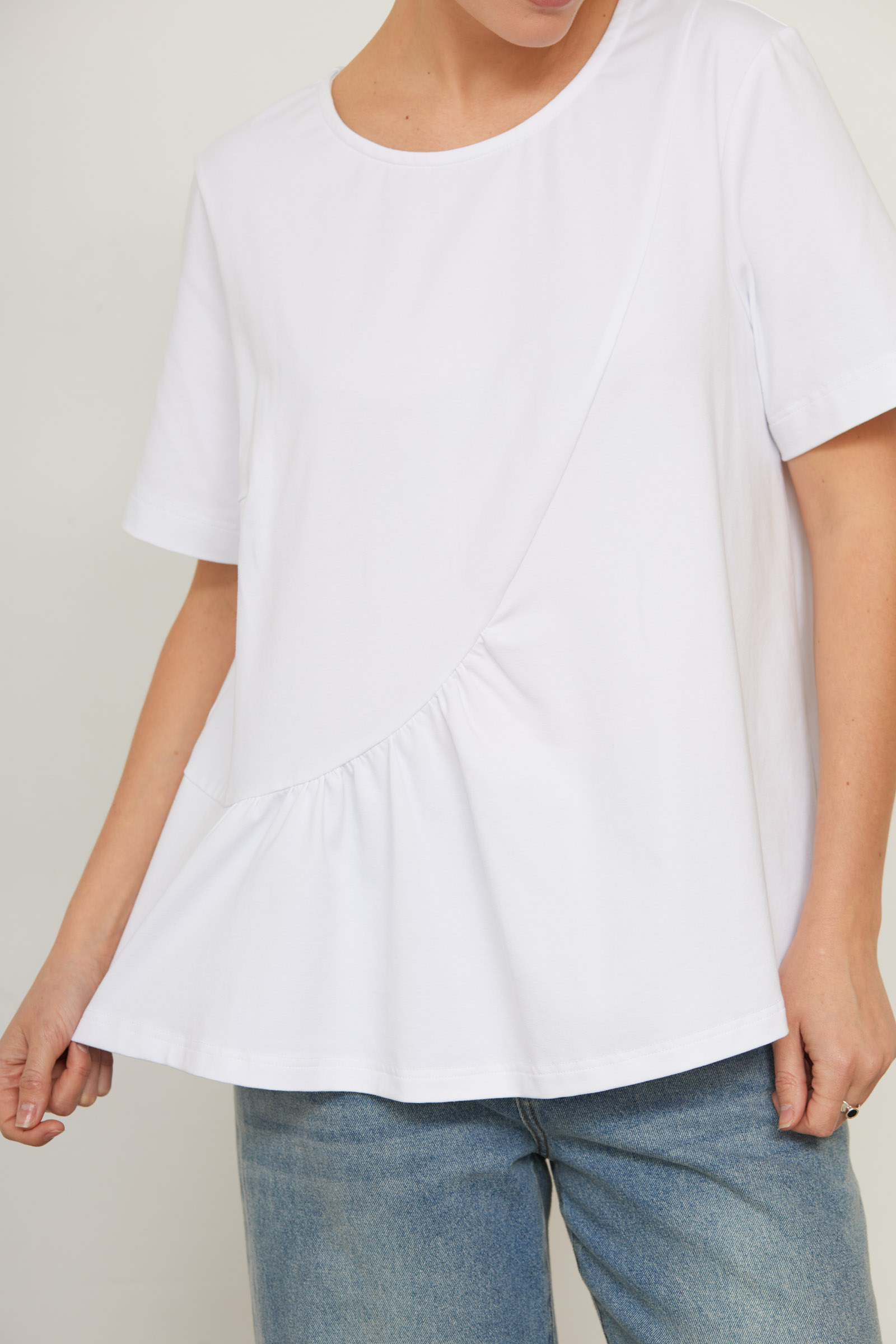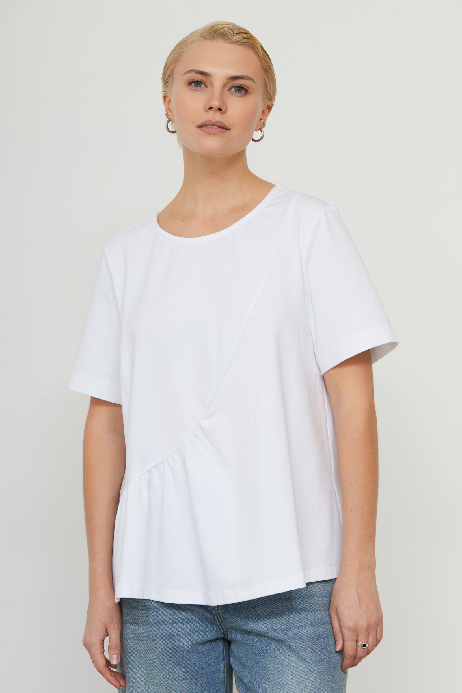 Футболка oversize с асимметричной отрезной линией и сборкой.