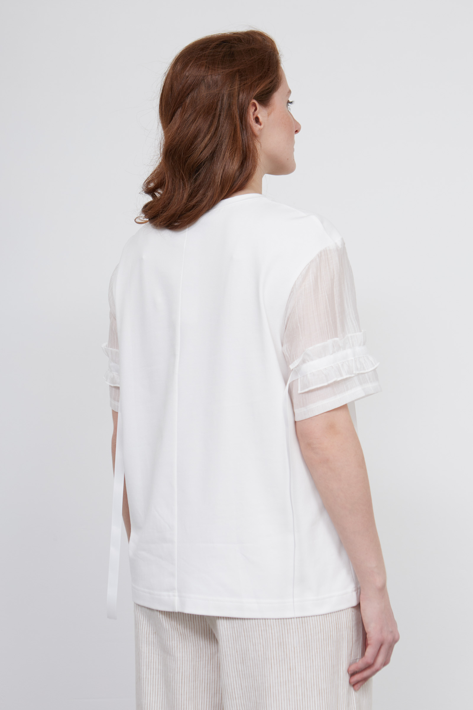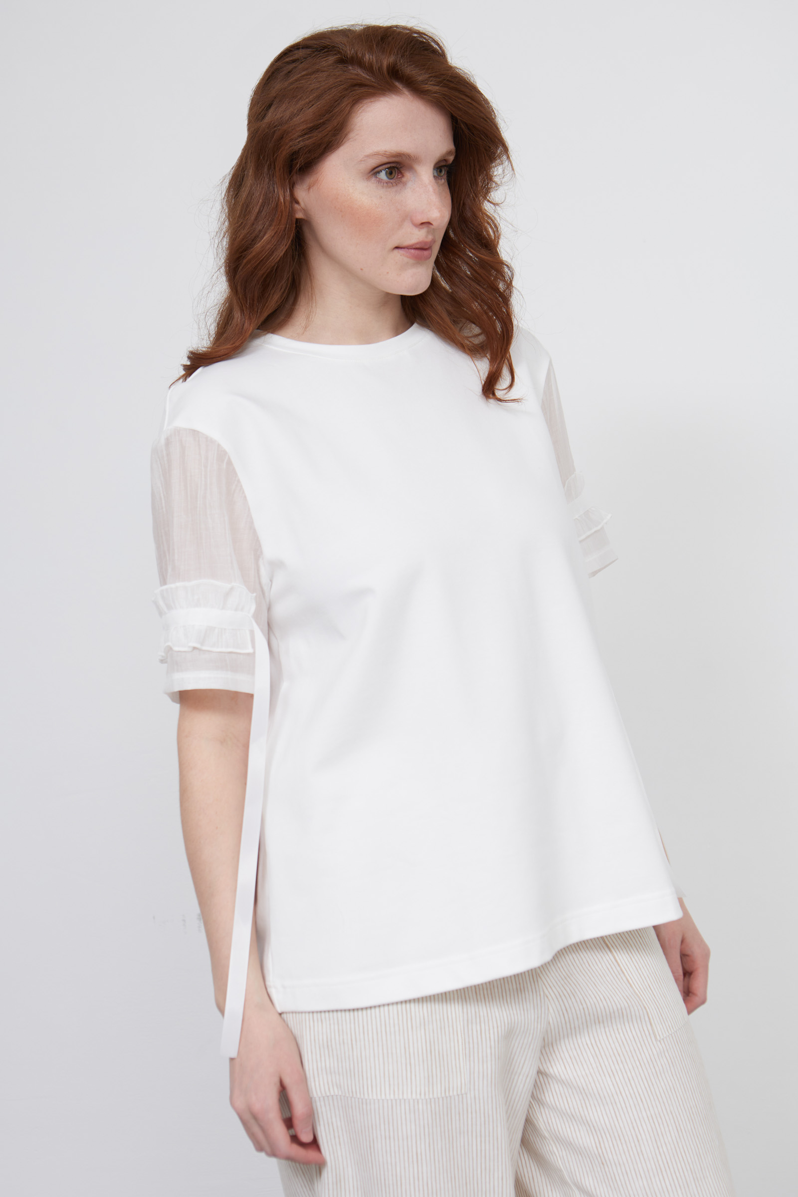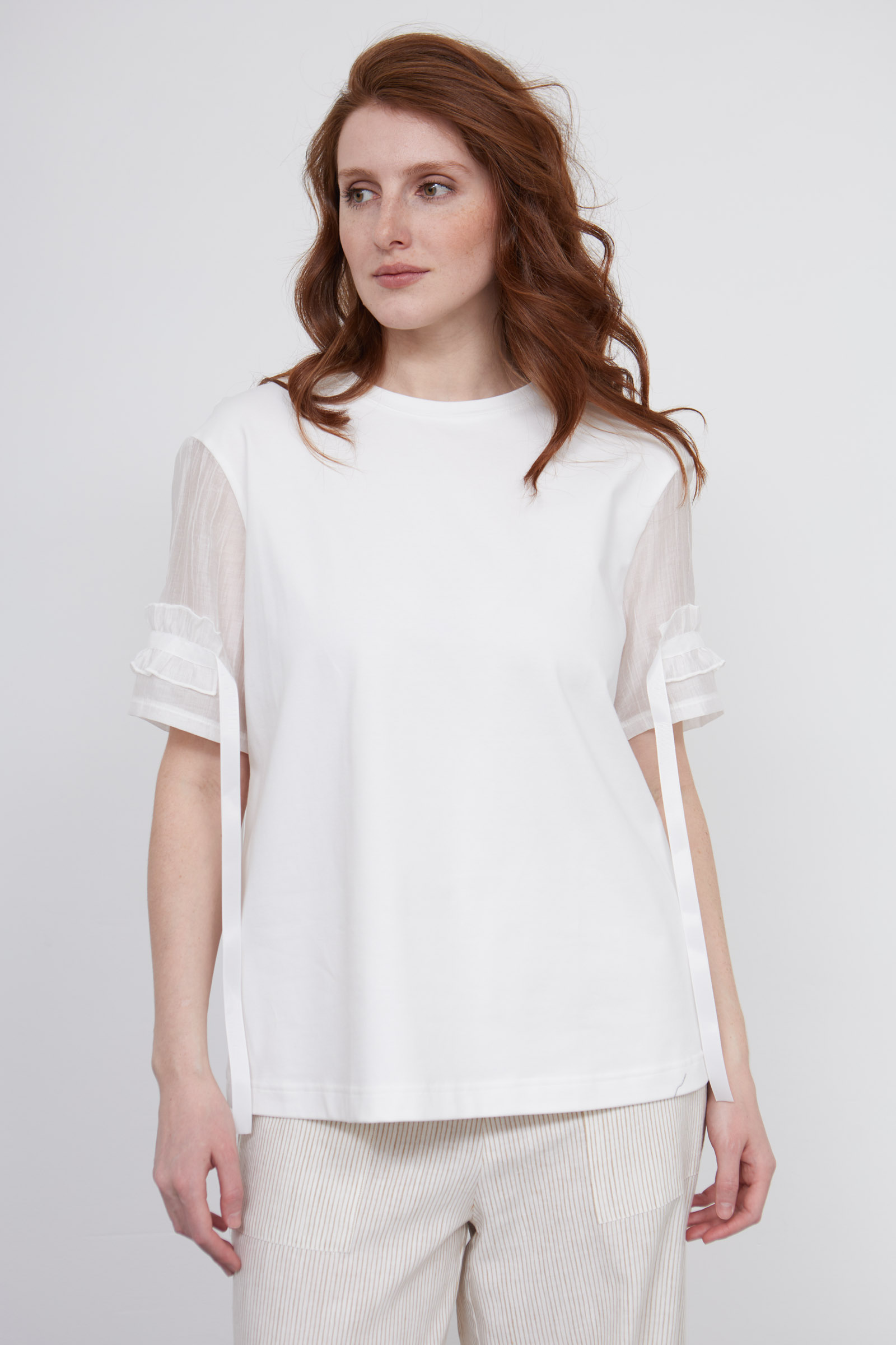 Комбинированная футболка из мягкого хлопкового трикотажа с рукавами из шифона с рюшами и лентами.