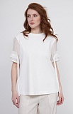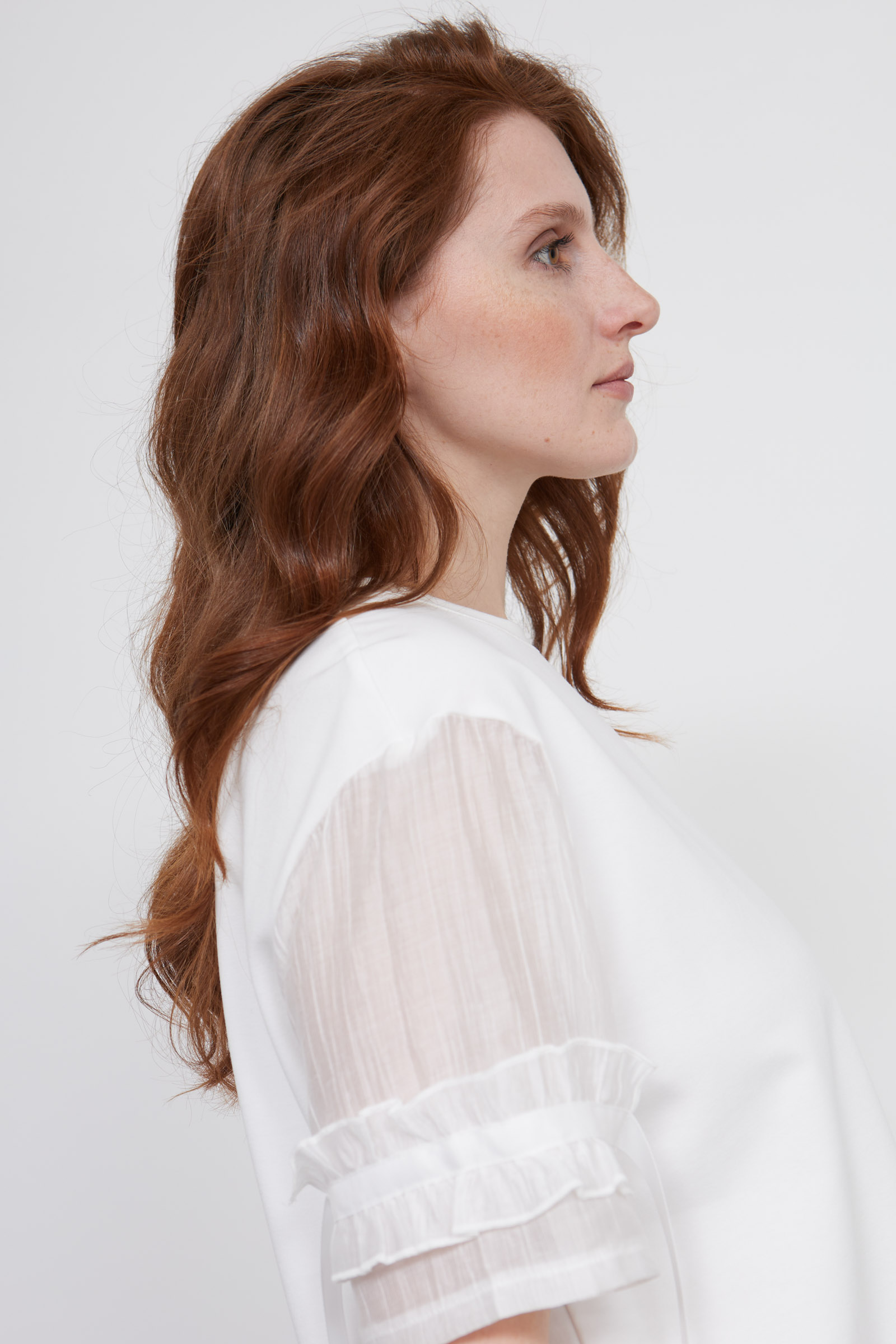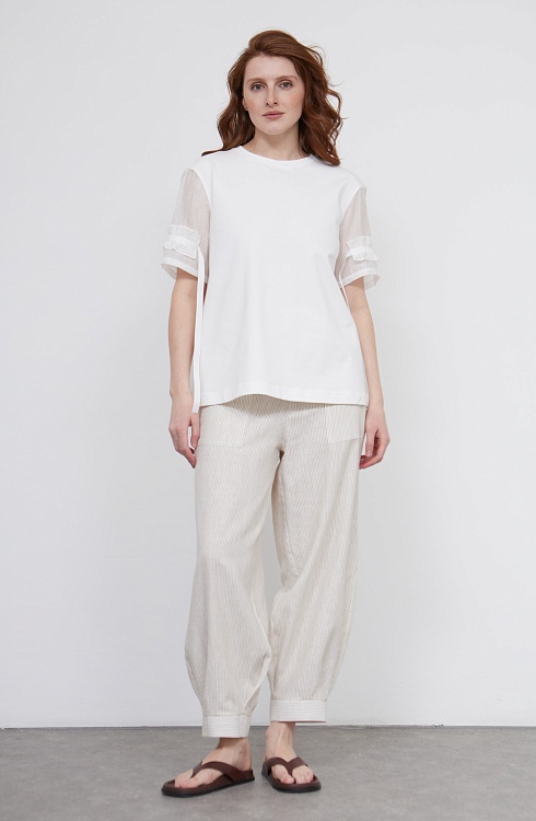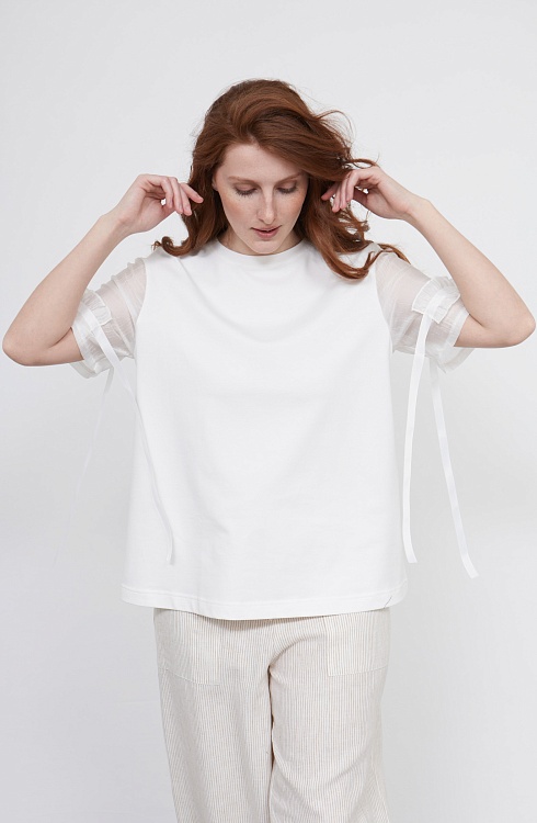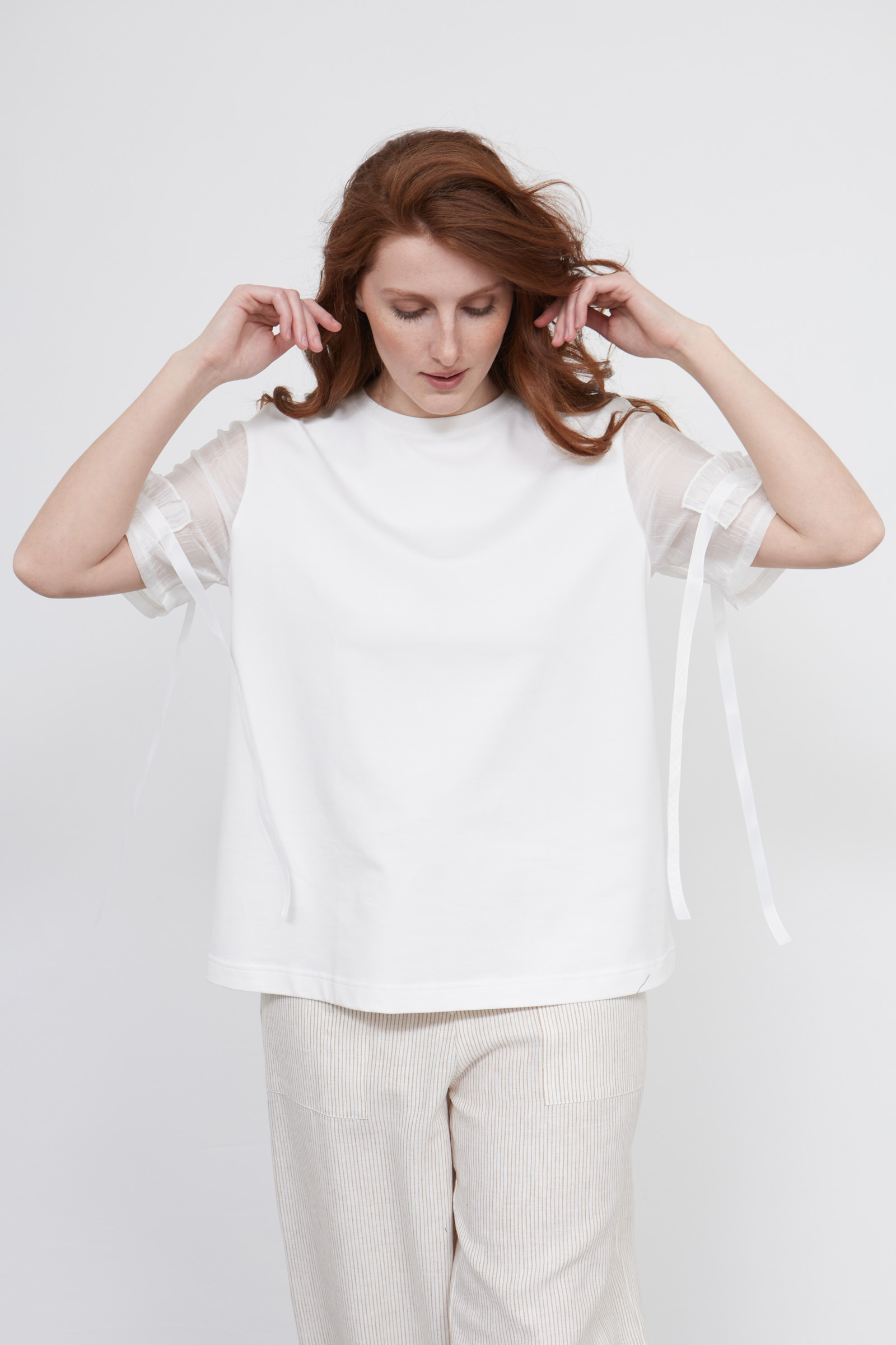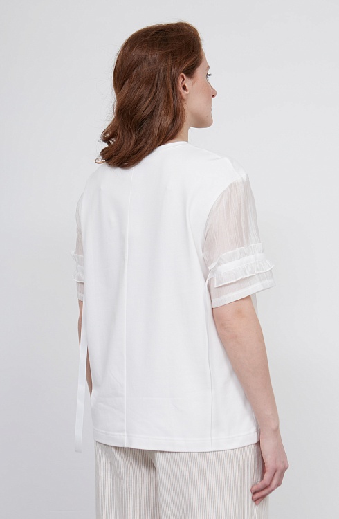 Комбинированная футболка из мягкого хлопкового трикотажа с рукавами из шифона с рюшами и лентами.