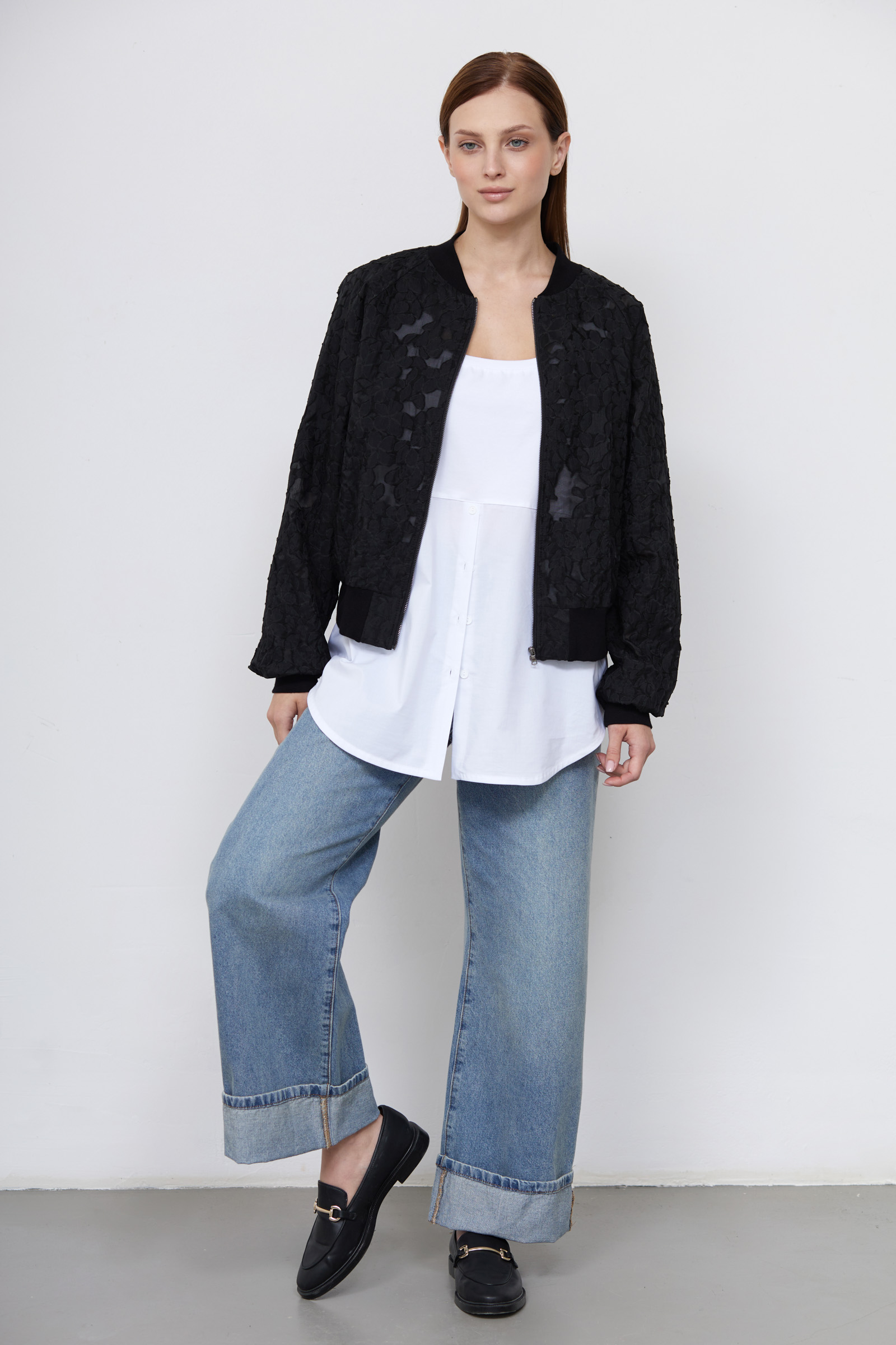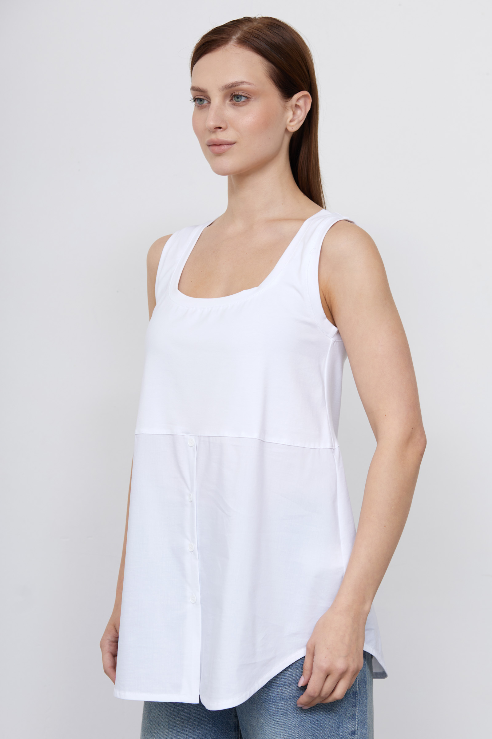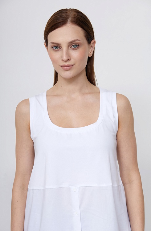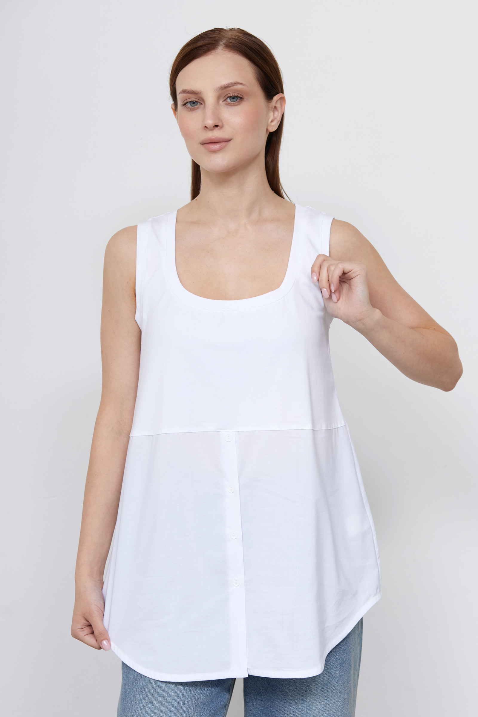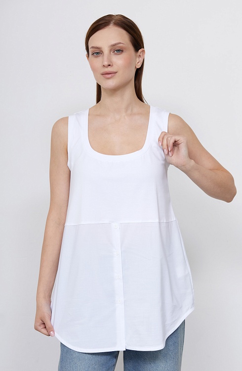 Комбинированный топ с верхней частью из хлопкового трикотажа и низом из гладкого хлопкового текстиля на пуговицах.