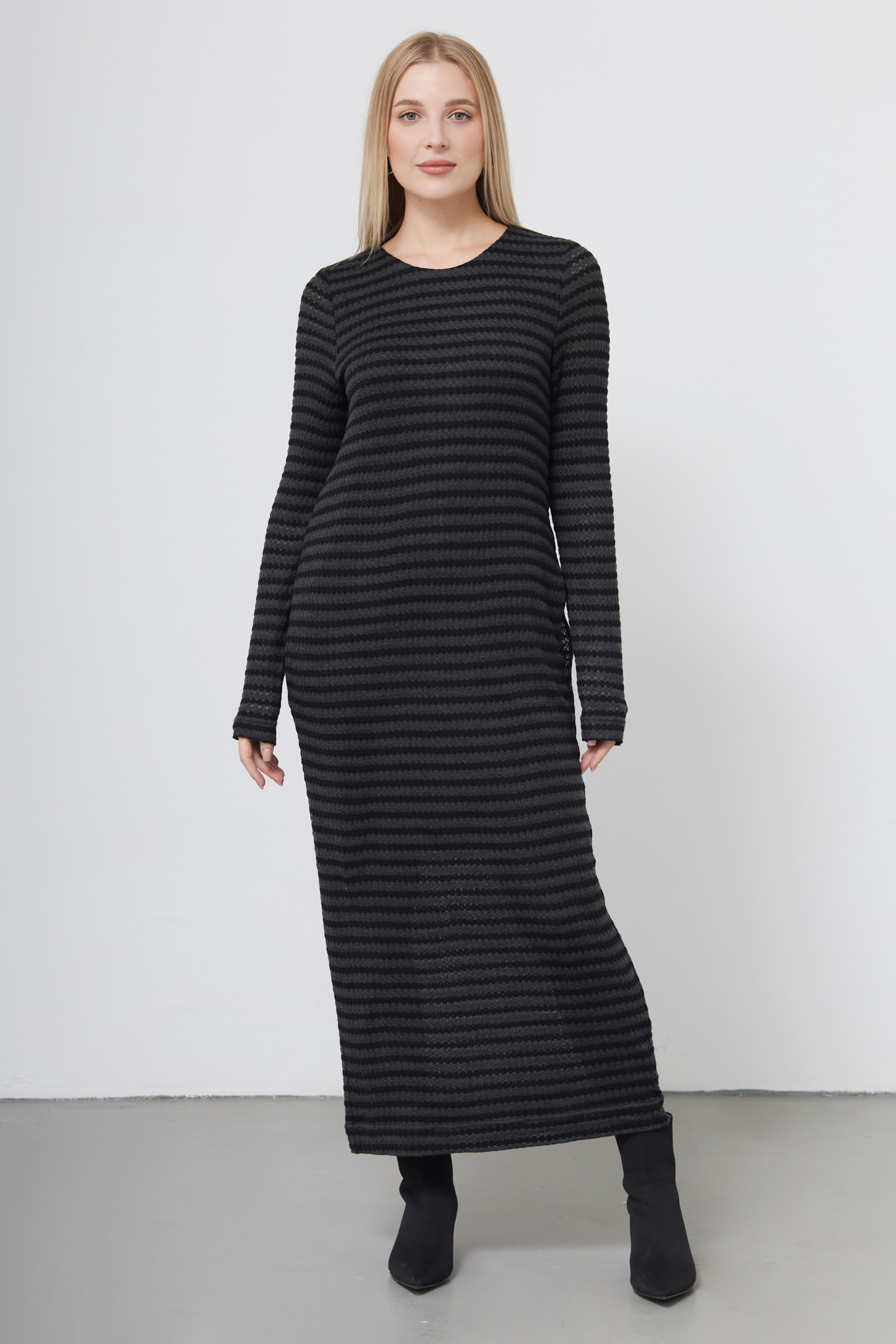 Длинное платье из тонкого ажурного трикотажа в полоску.