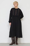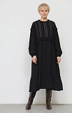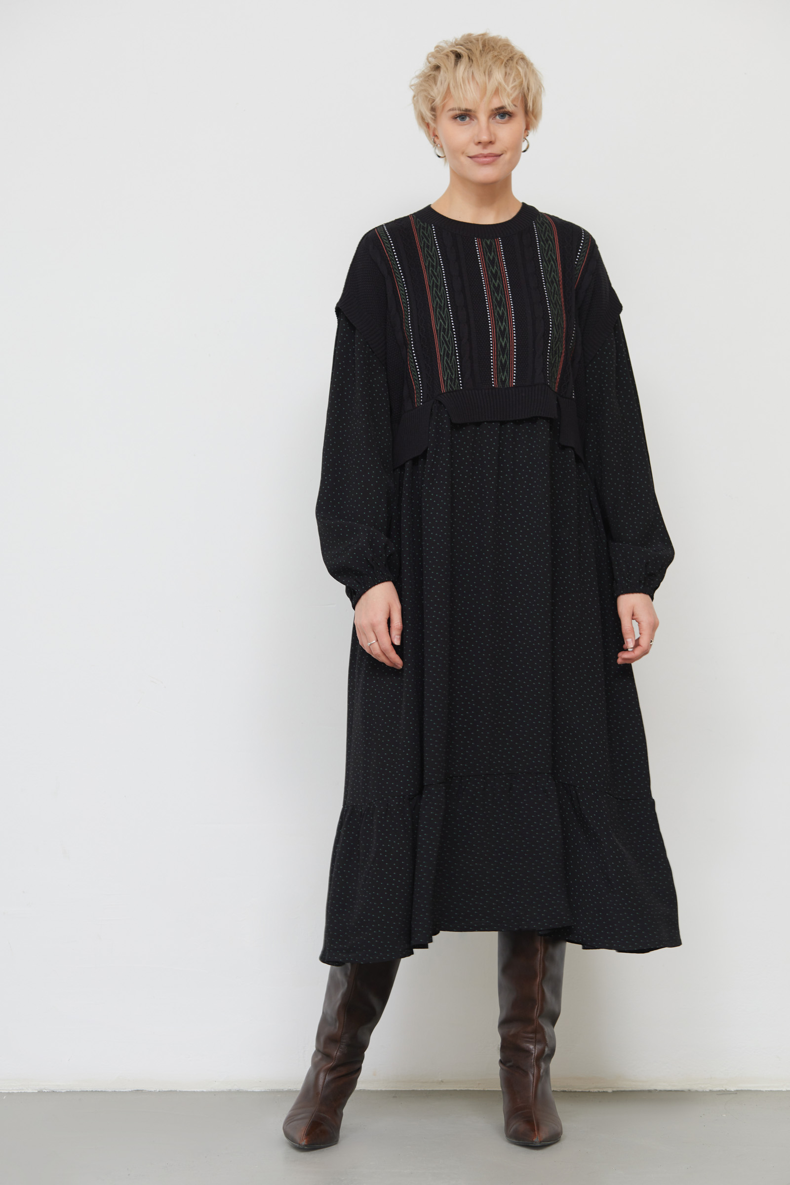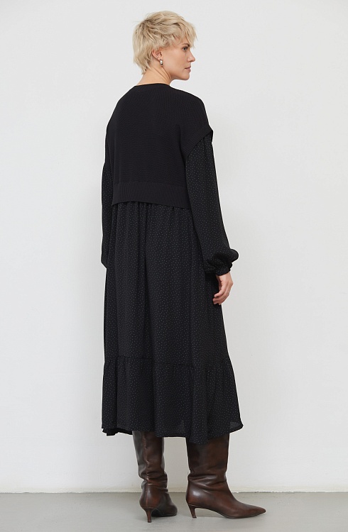 Комбинированное платье с рукавами и юбкой из струящейся вискозы в горошек, и имитацией жилета с фактурным орнаментом.