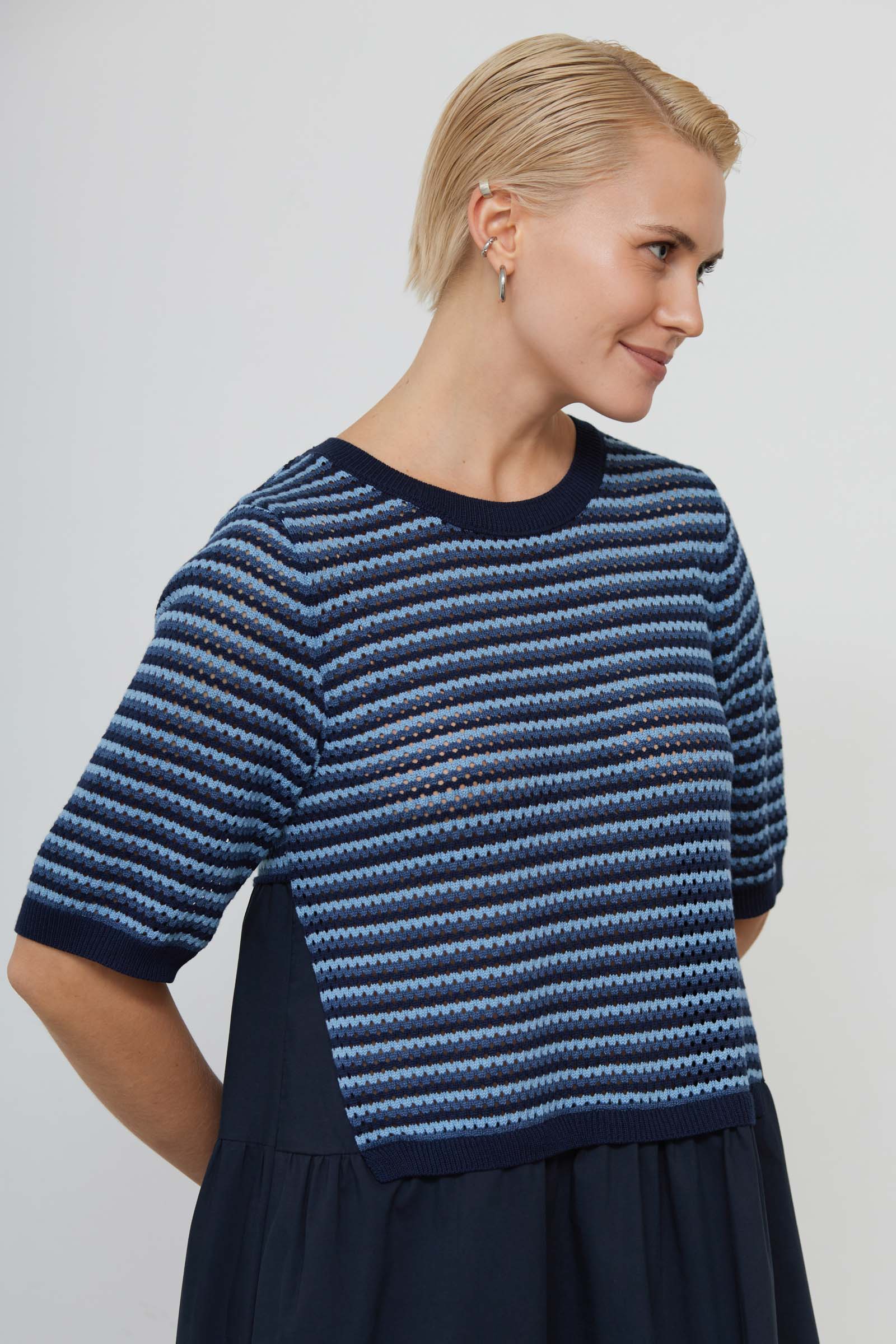 Комбинированное ярусное платье с вязаной частью сверху и текстильной юбкой.