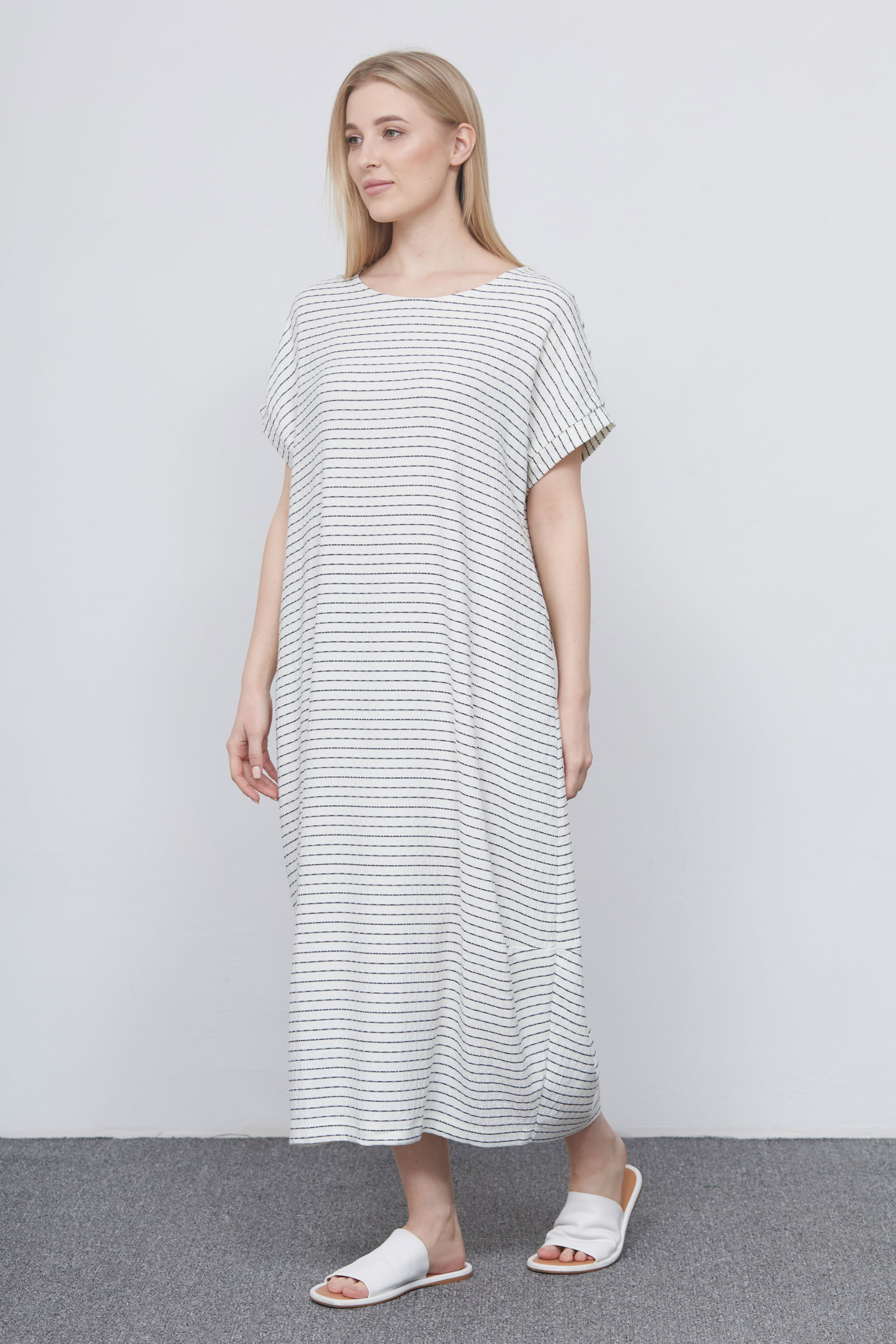Длинное платье oversize из фактурного поливизного трикотажа в полоску.