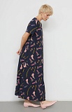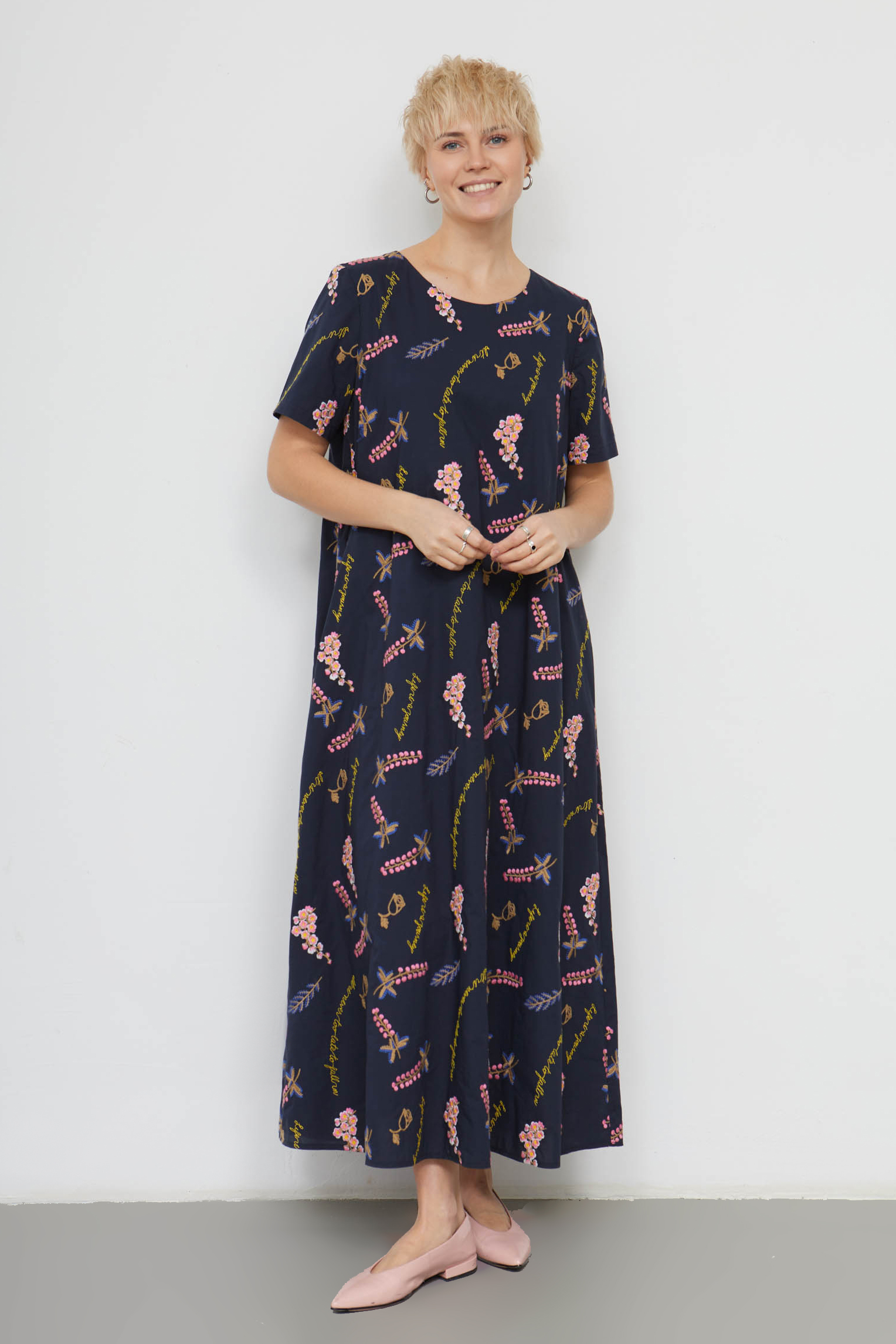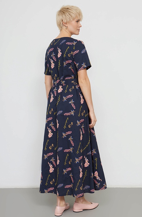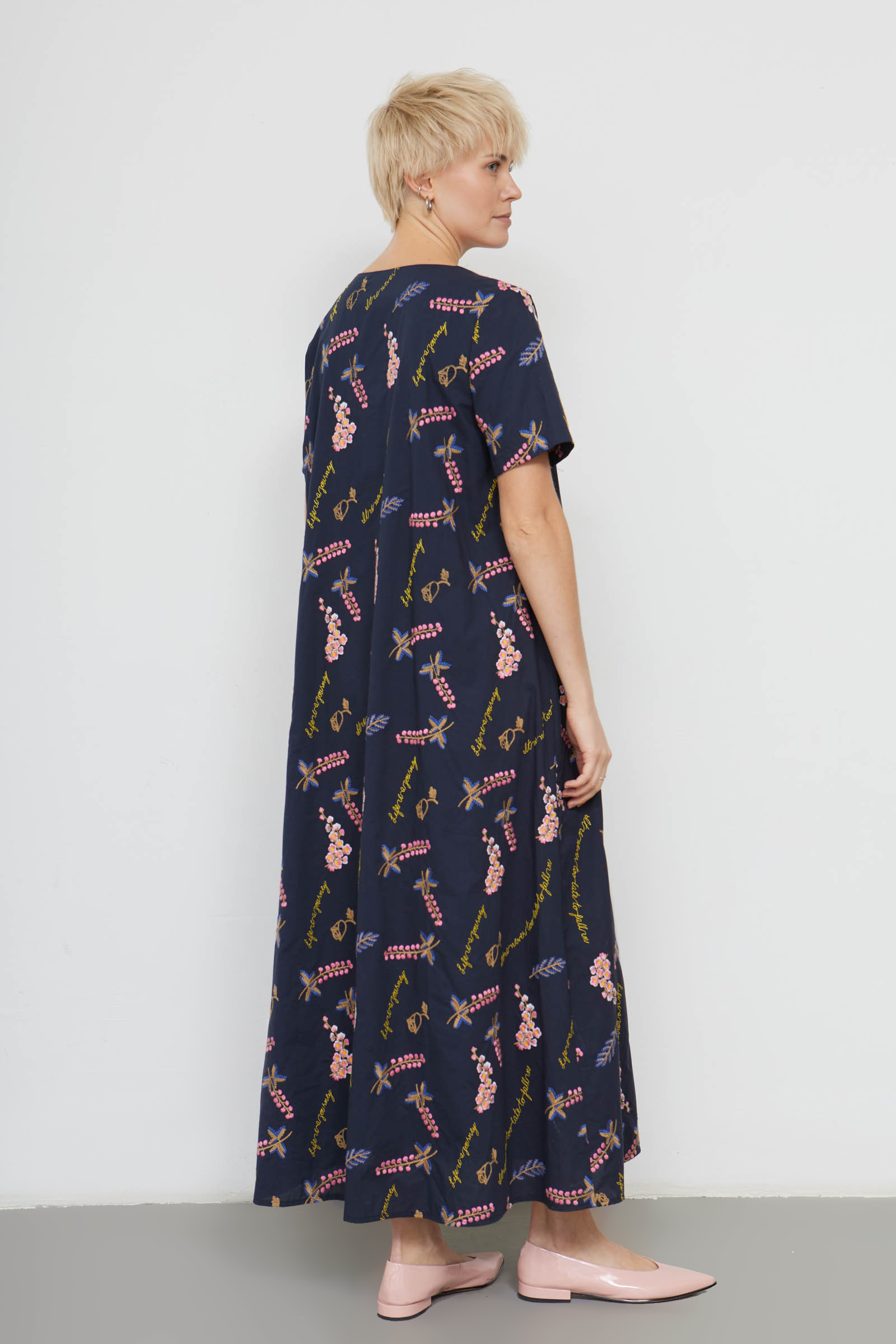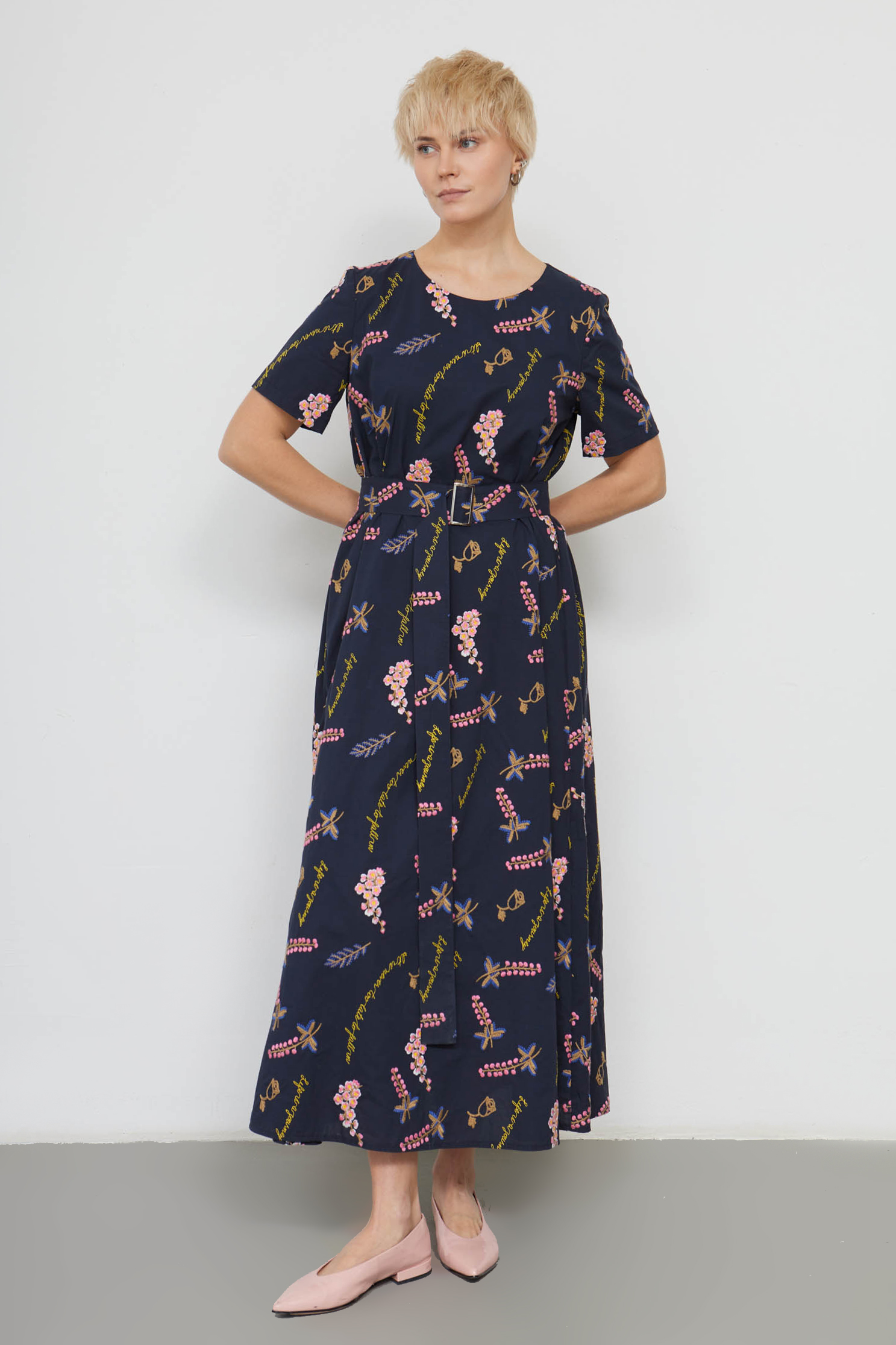 Длинное платье oversize из легкого хлопка с контрастной цветочной вышивкой и поясом.