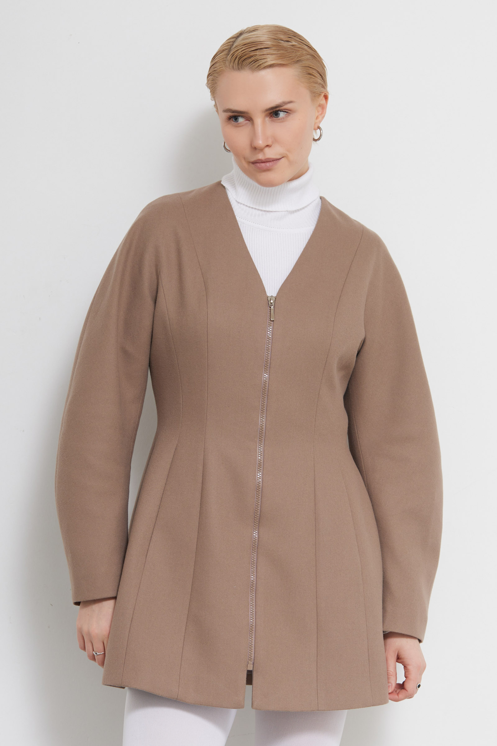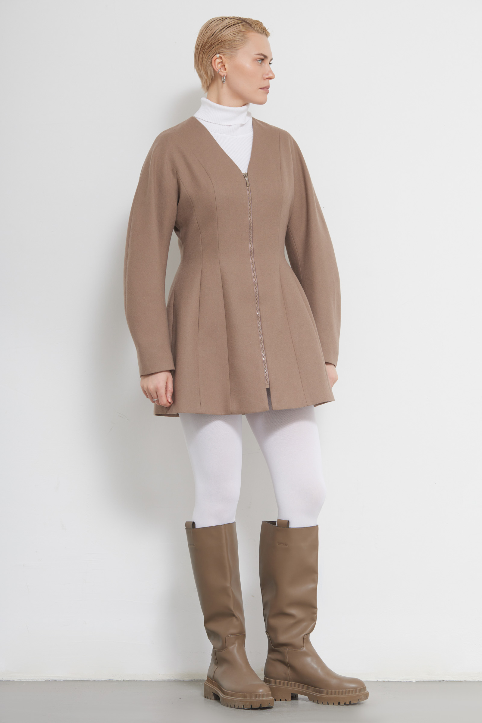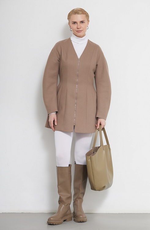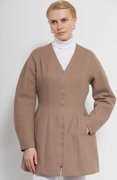 Короткое платье из мягкой фланелевой ткани на молнии с рельефными швами.