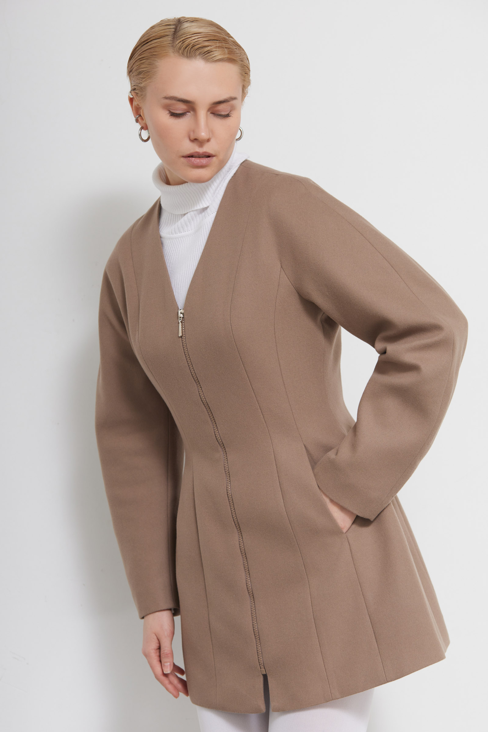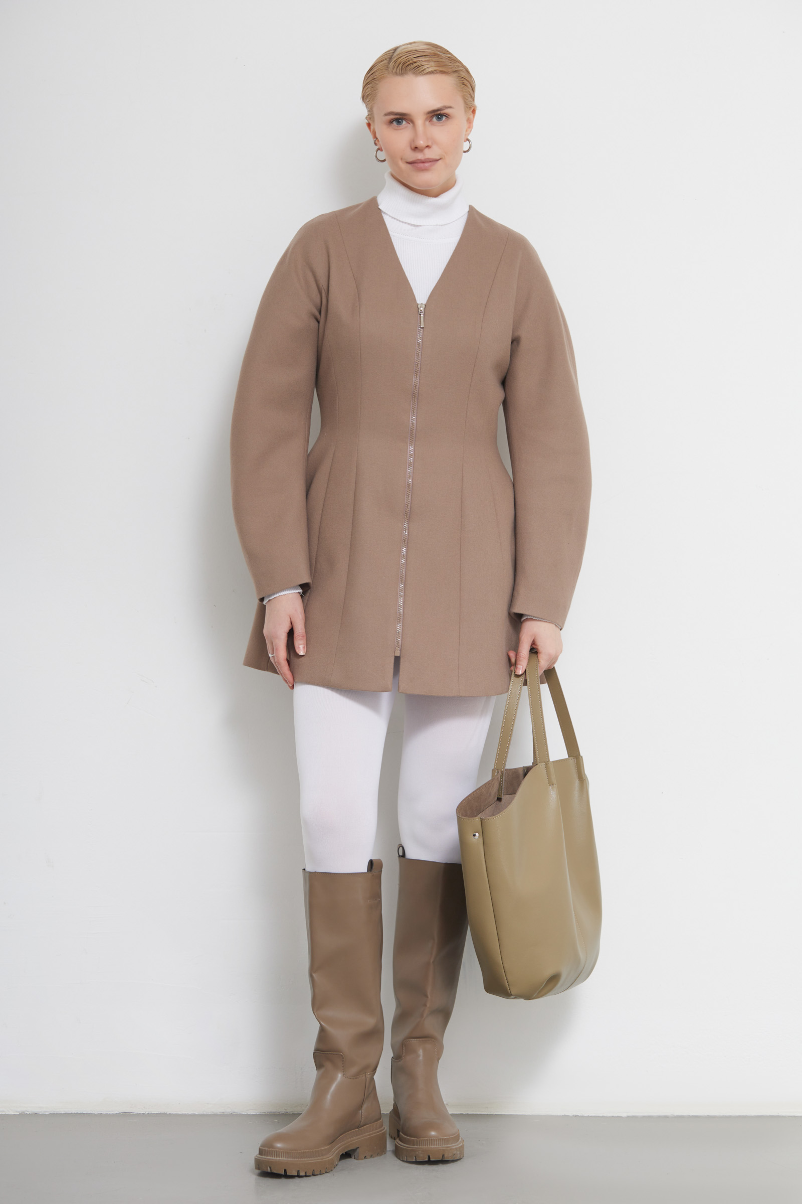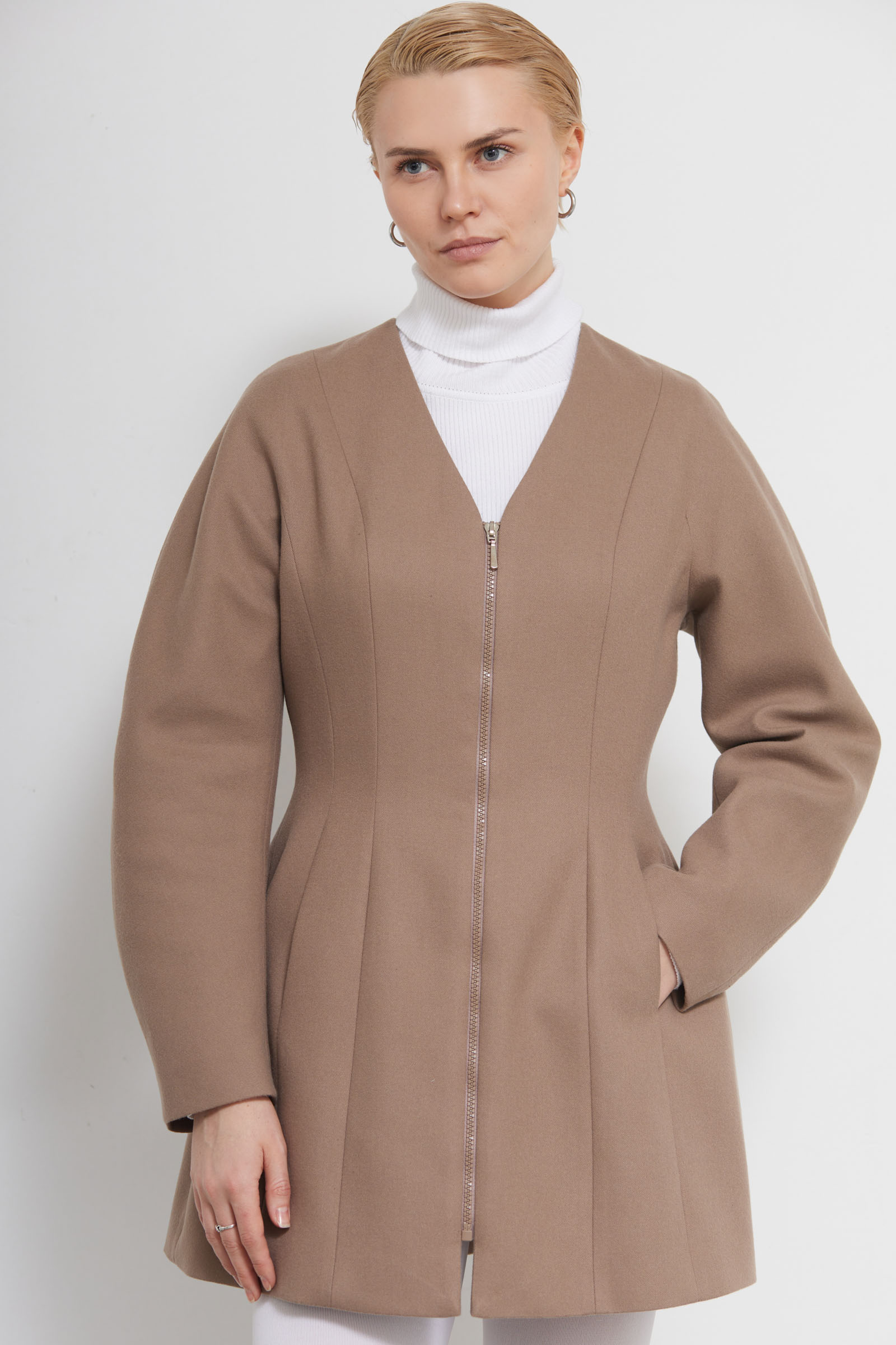 Короткое платье из мягкой фланелевой ткани на молнии с рельефными швами.