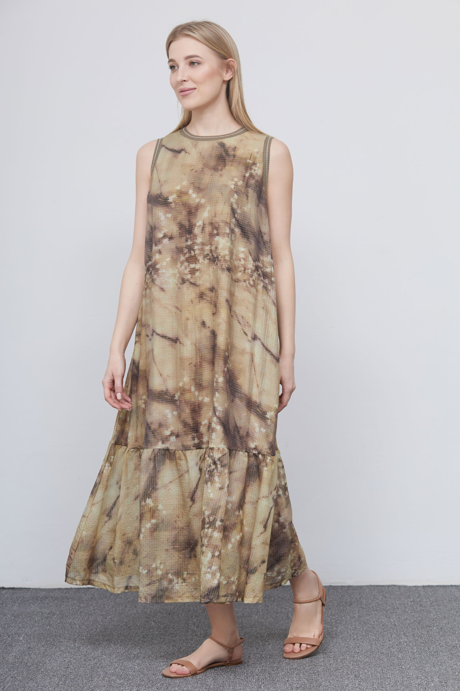 Сарафан oversize из струящейся ткани с абстрактным принтом и воланом по низу.