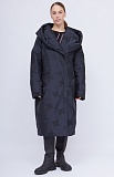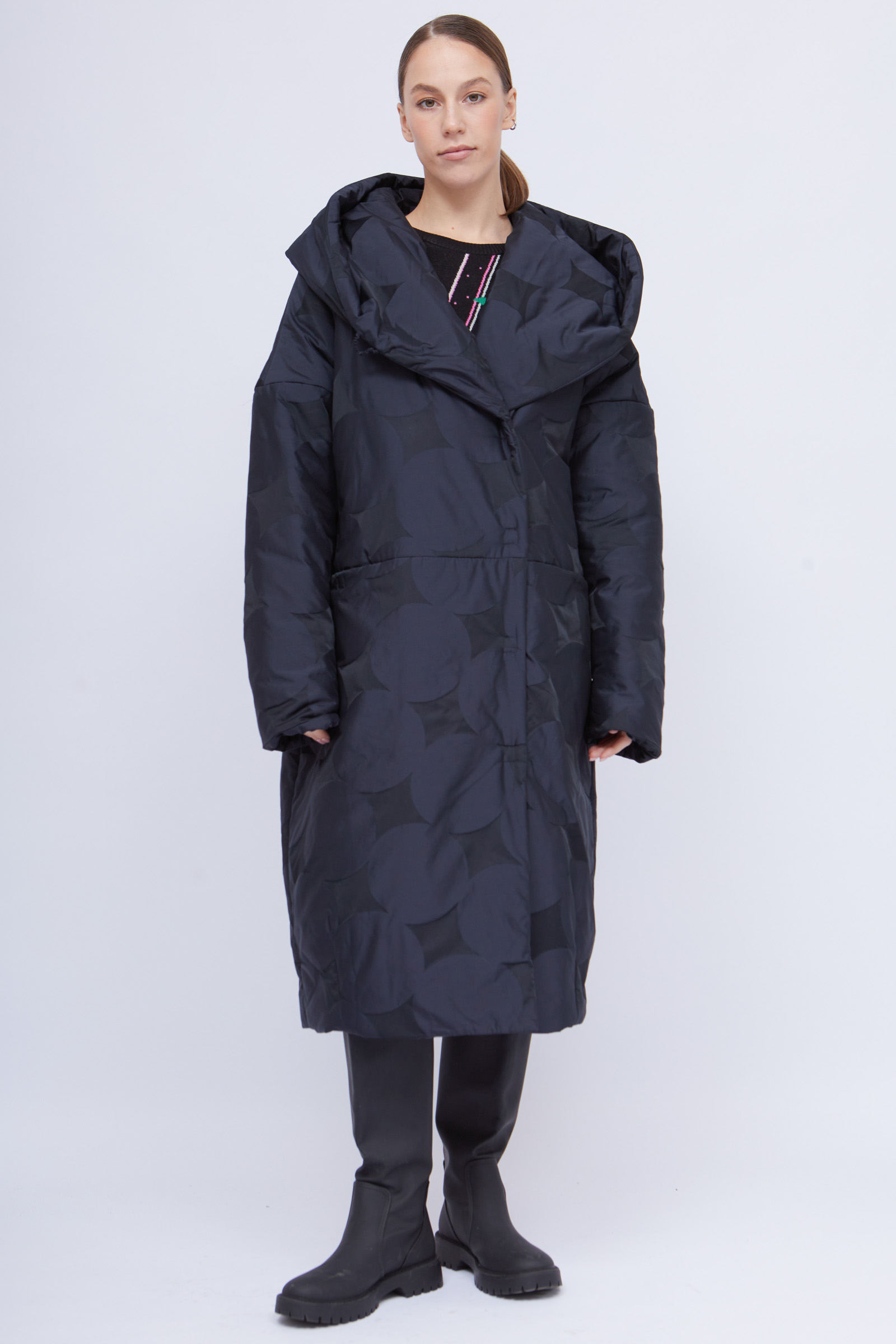 Зимнее утепленное пальто с объемным капюшоном и геометрическим рисунком.