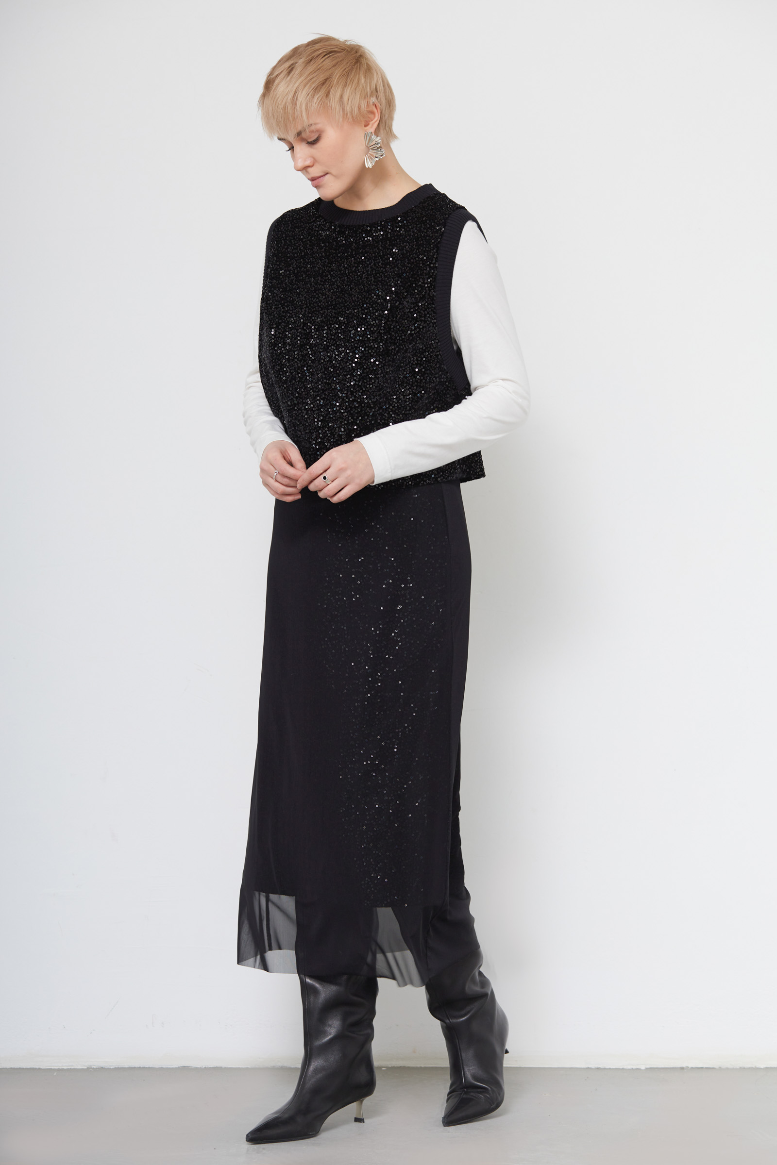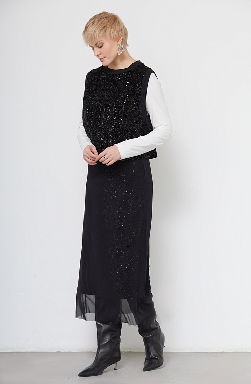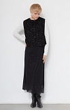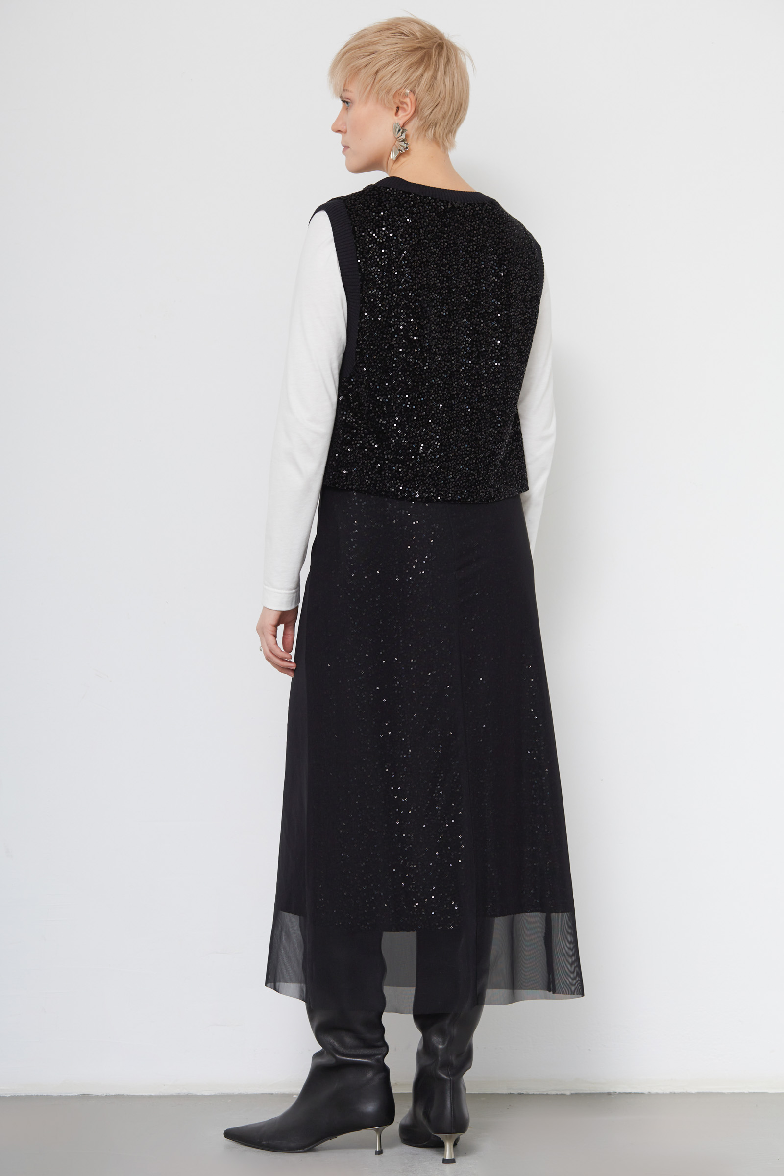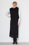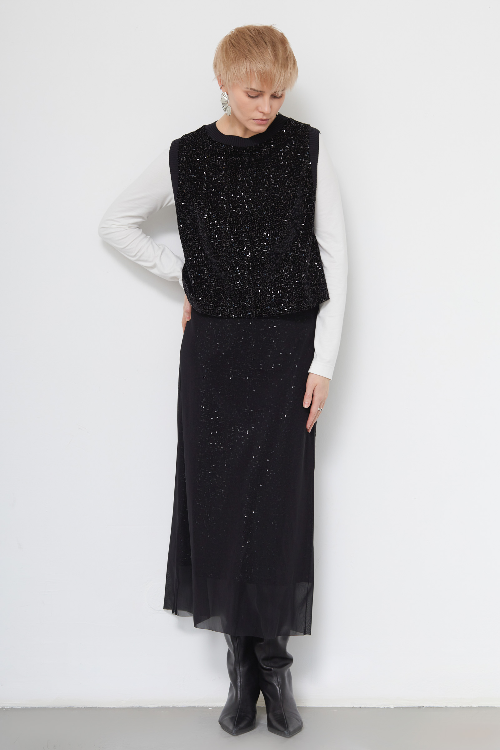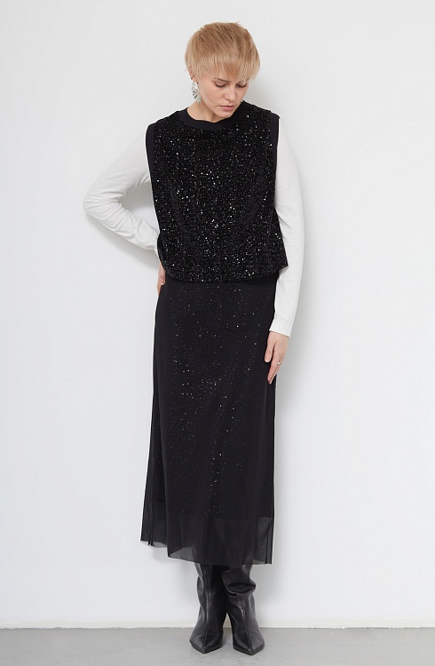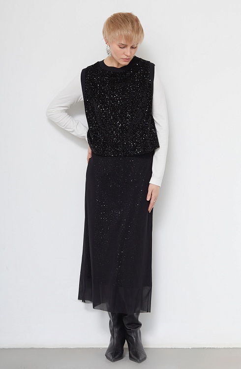 Двуслойная юбка миди из бархата с пайетками и сеткой сверху.