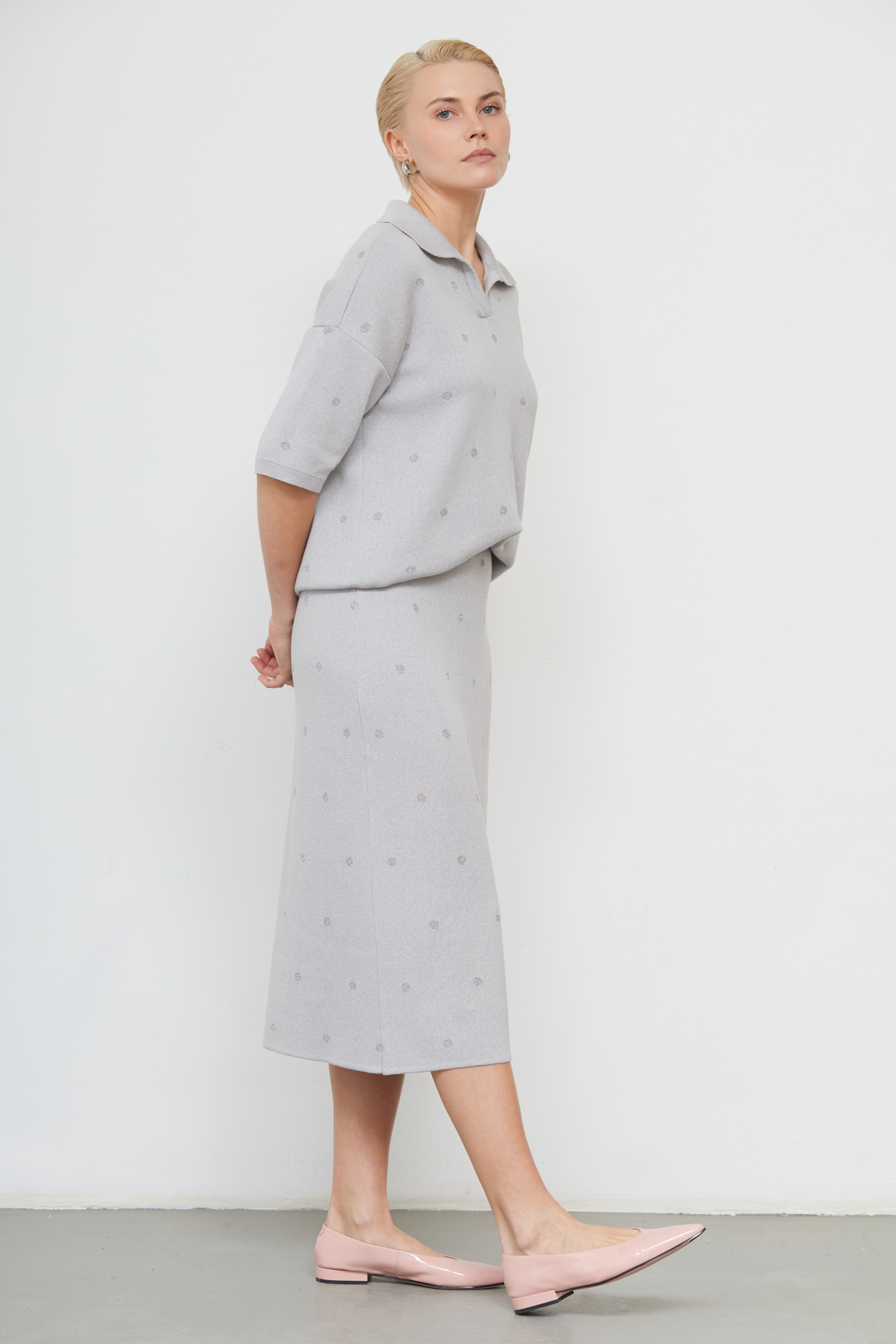 Юбка миди из мягкого вязаного трикотажа в горошек из люрекса.