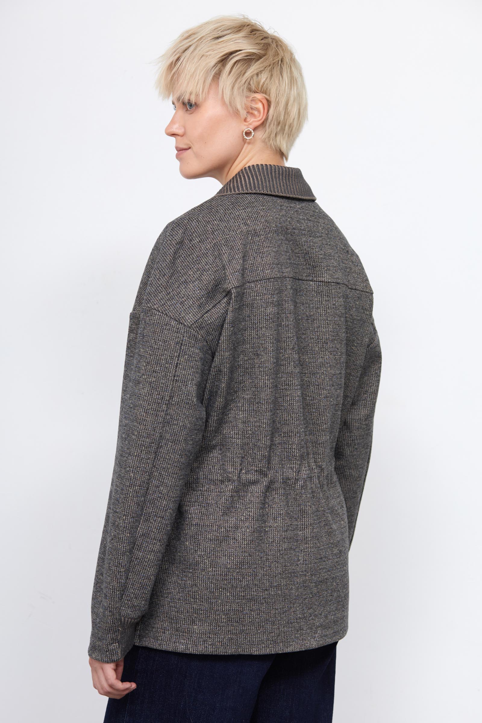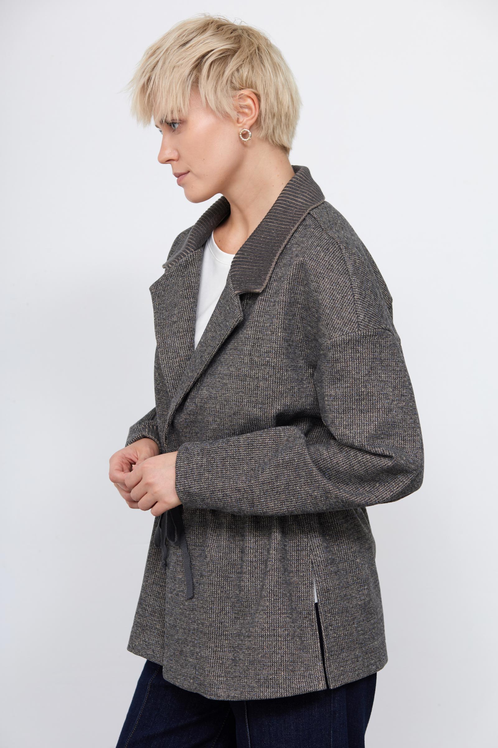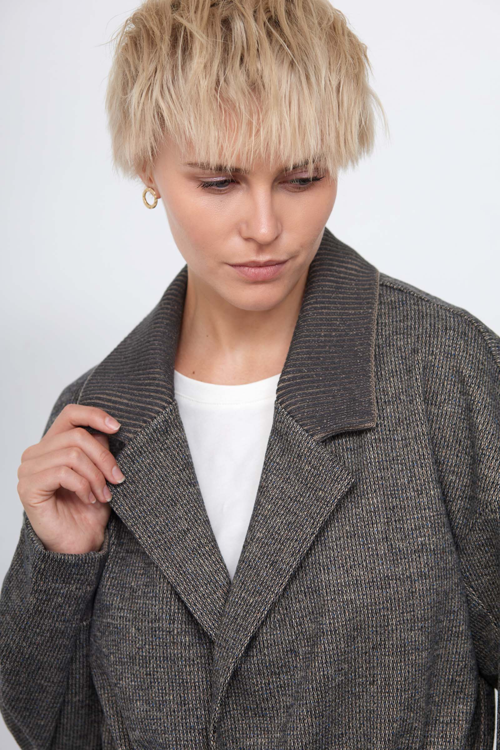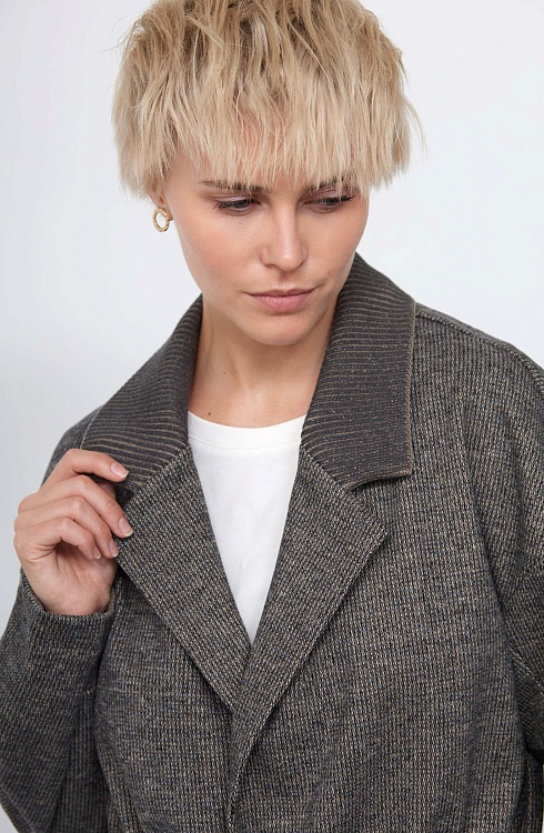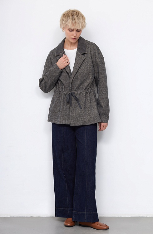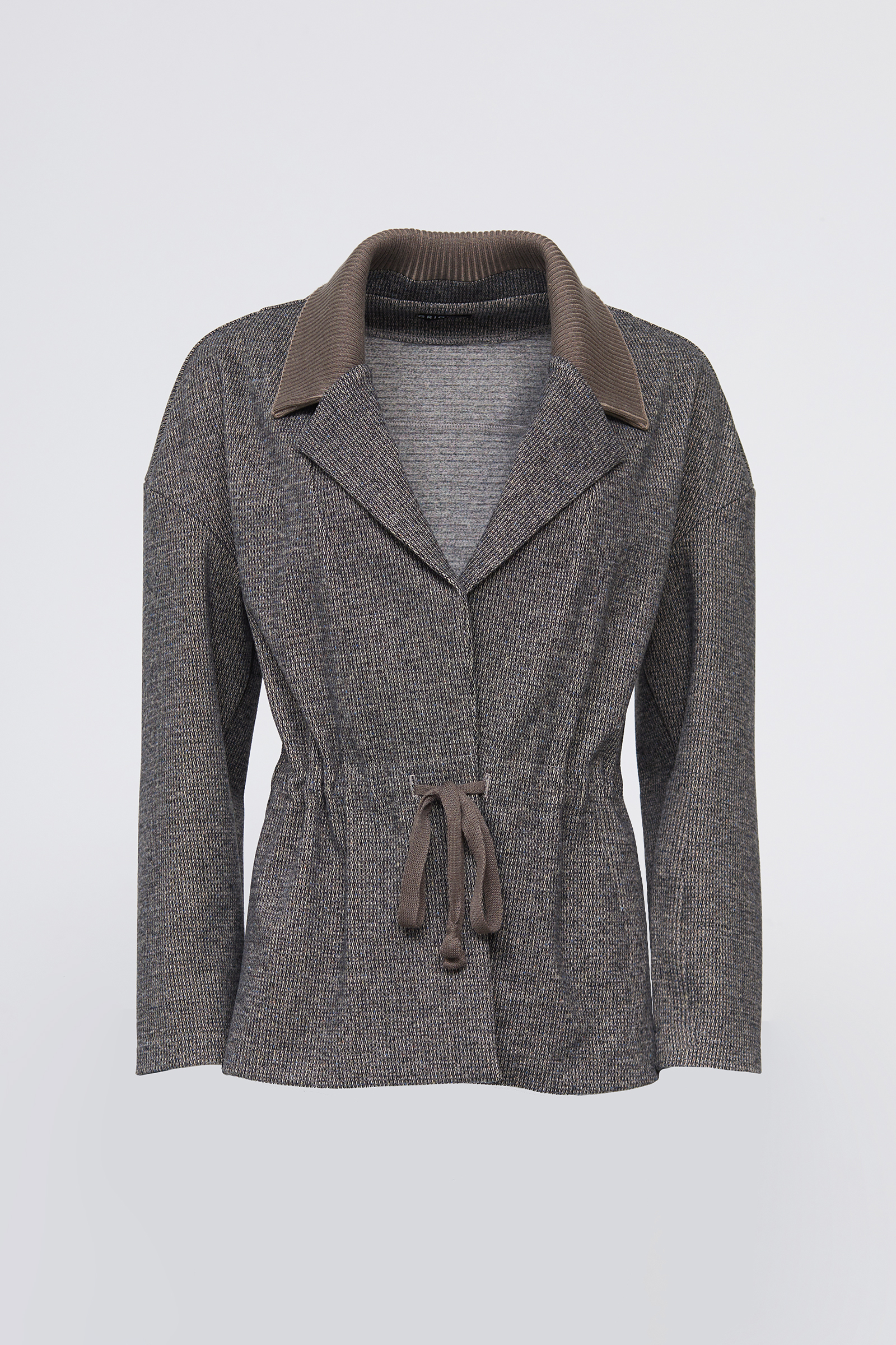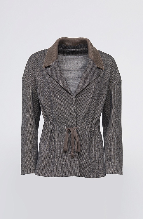 Жакет из мягкого фланелевого трикотажа с воротником из рибаны и кулиской на талии.