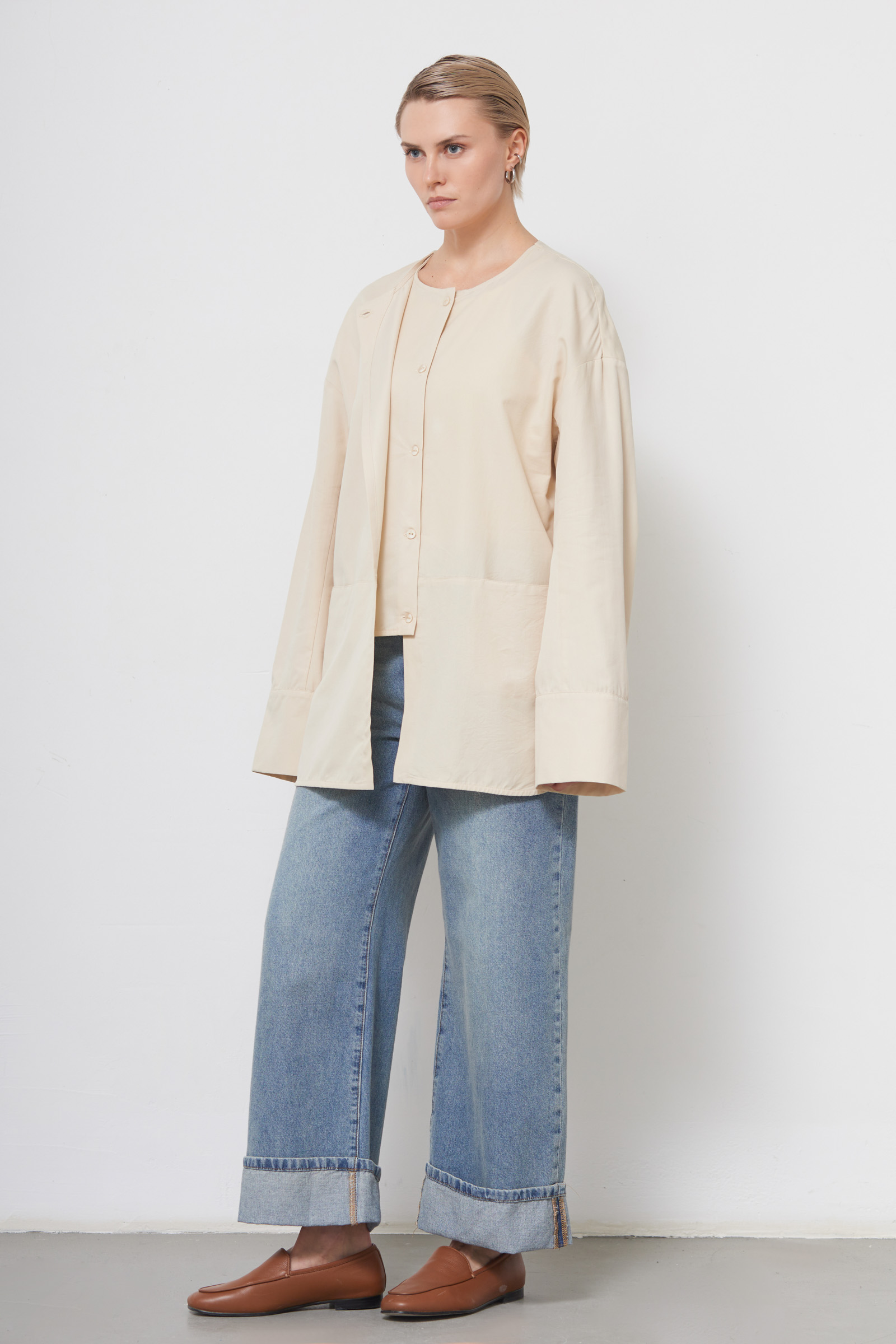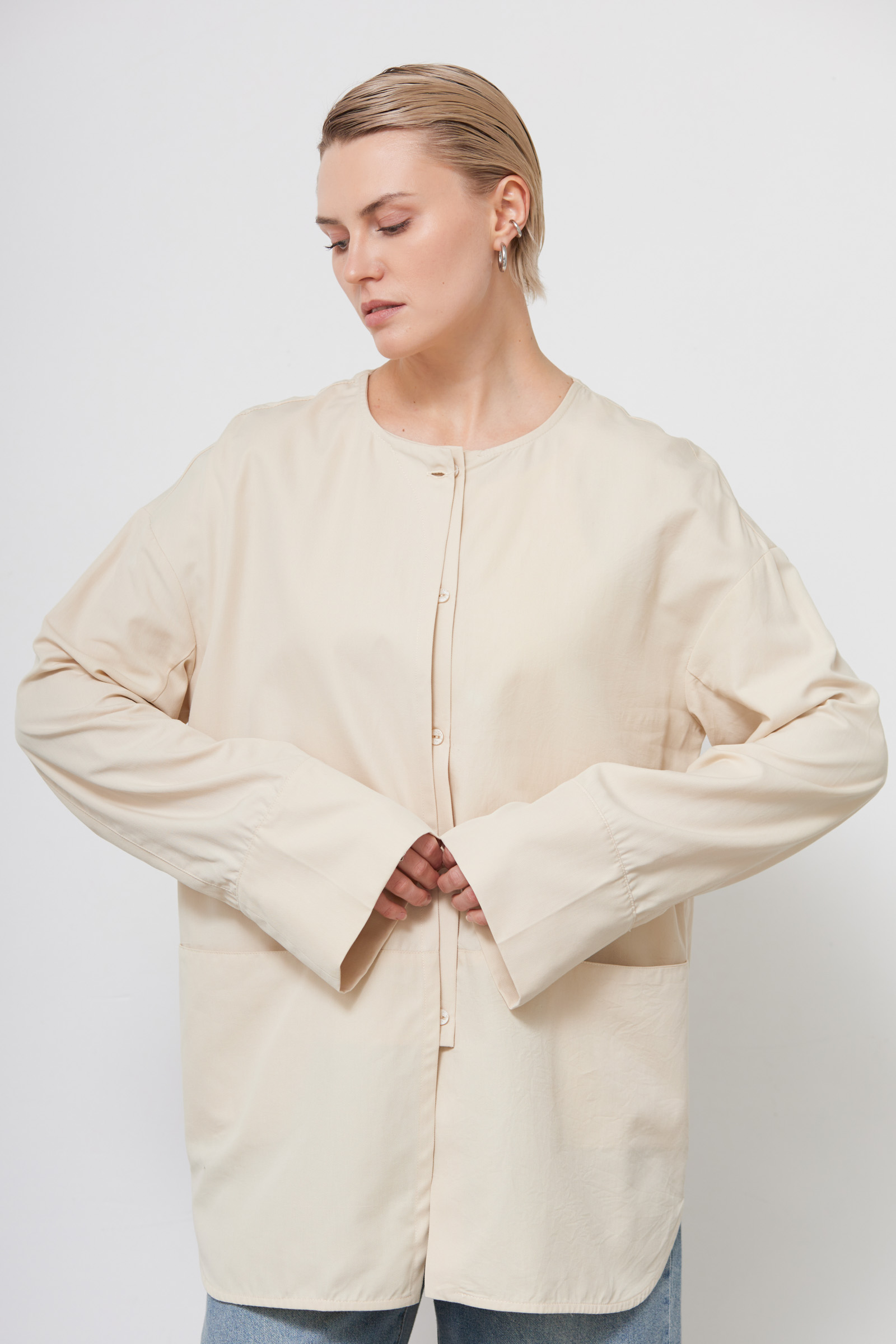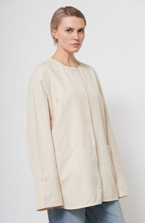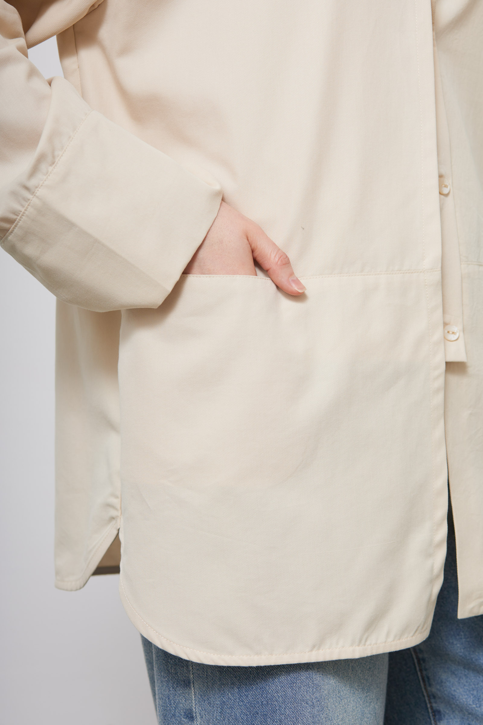 Комбинированная рубашка oversize с отлетной полочкой и карманами.