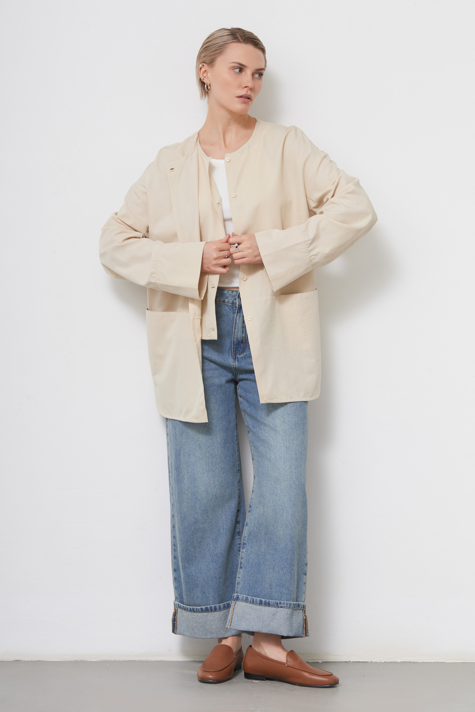 Комбинированная рубашка оверсайз с отлетной полочкой и карманами.