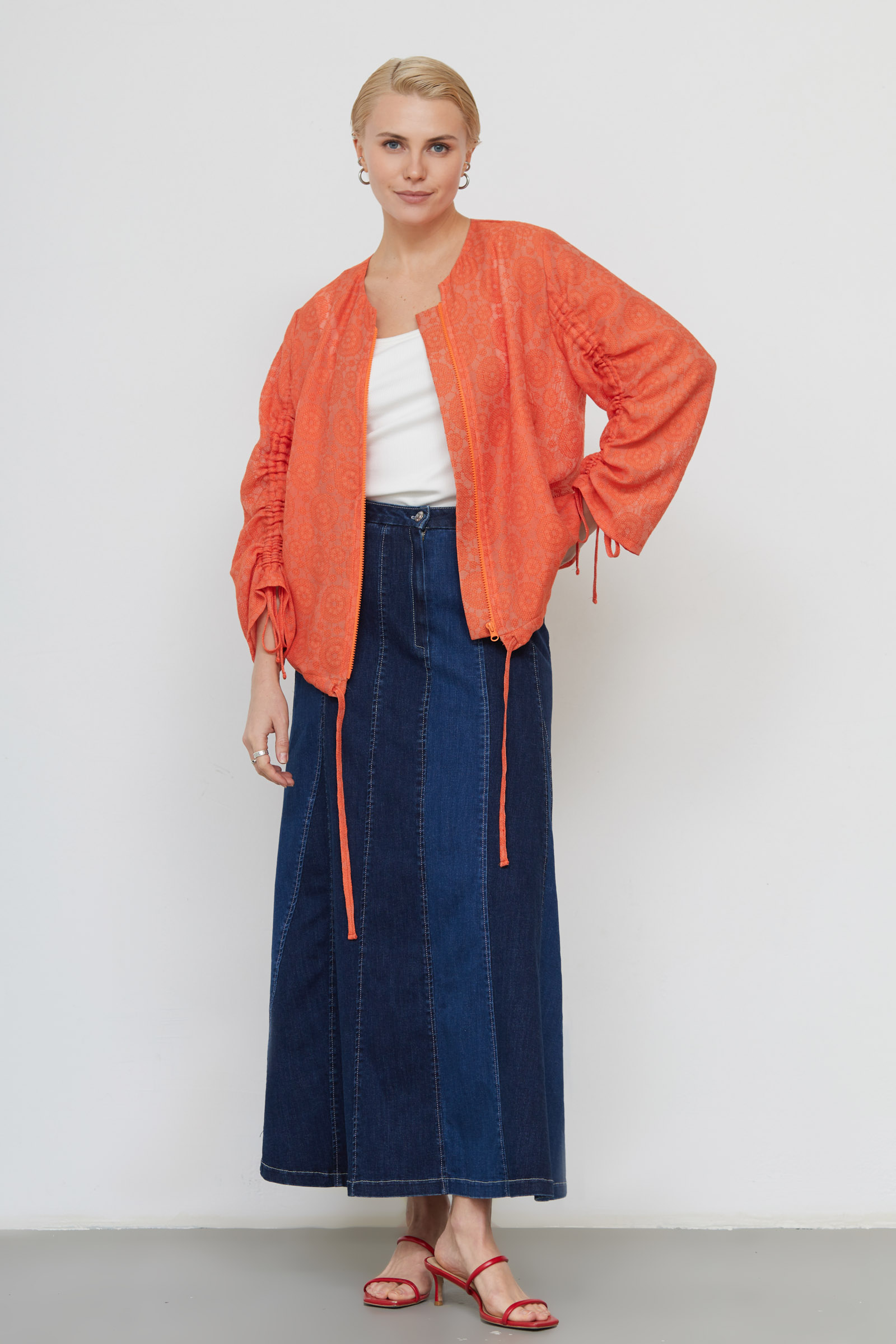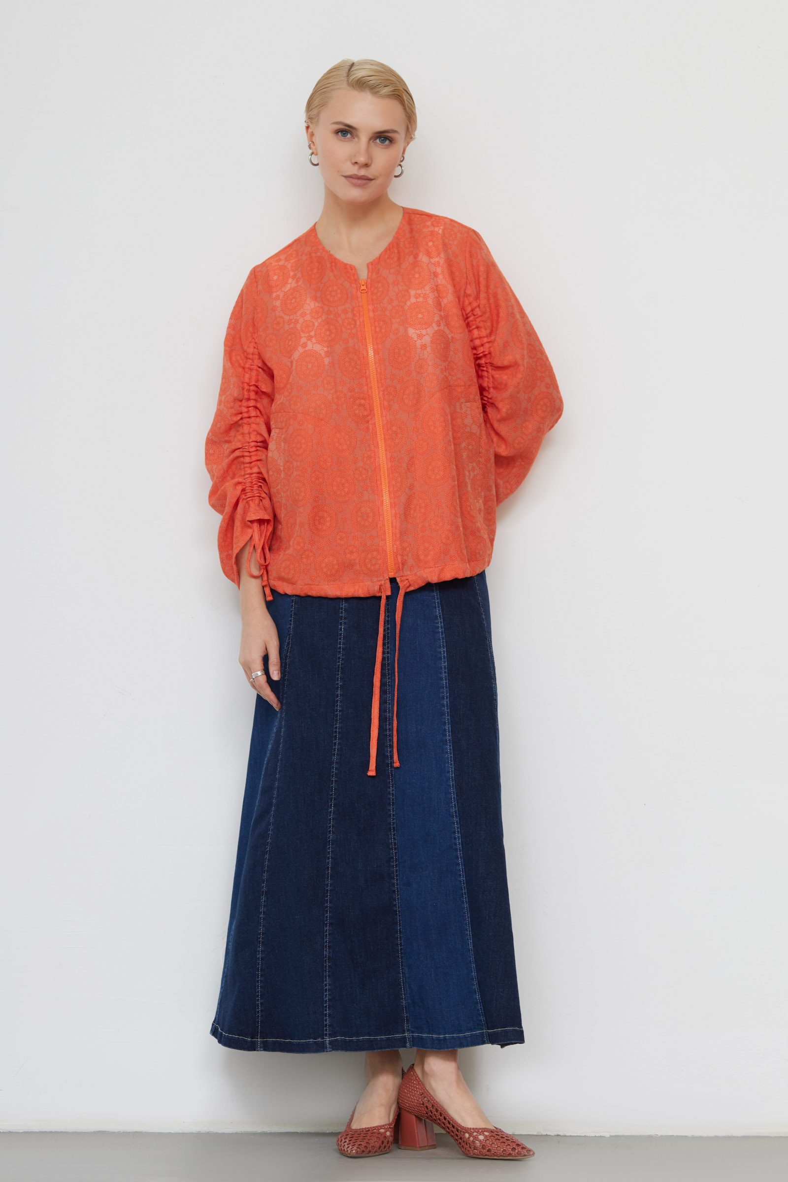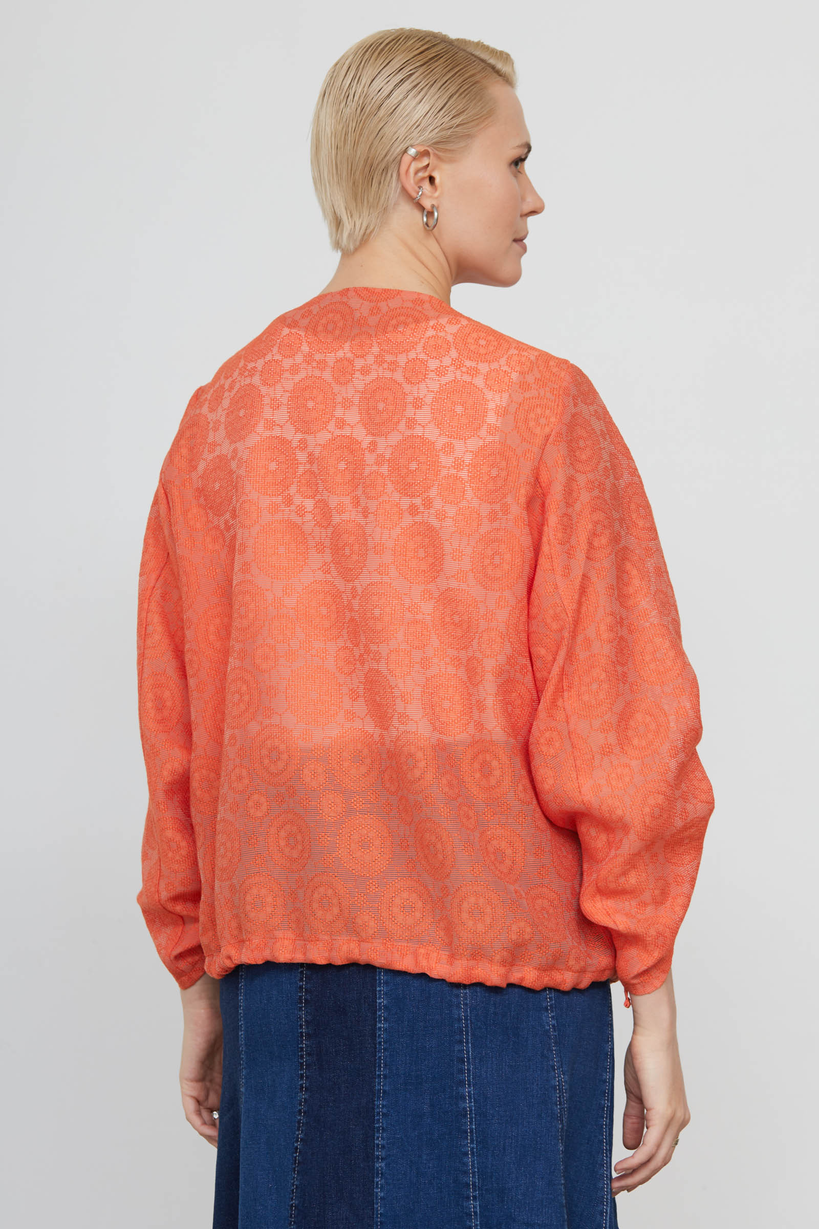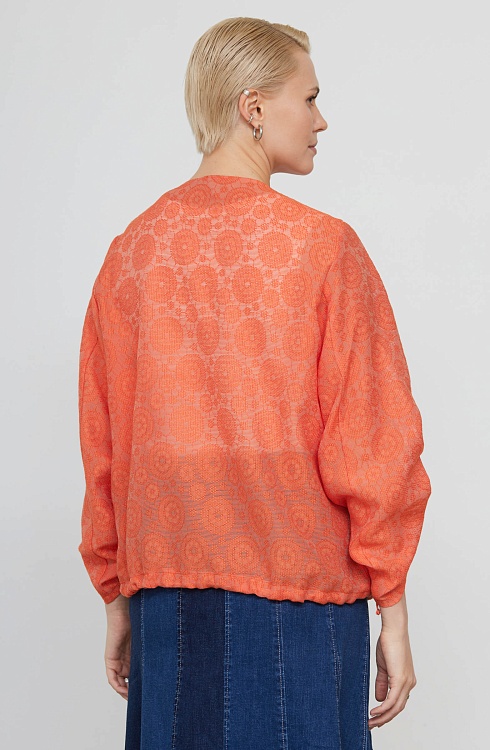 Жакет оверсайз из ажурной ткани со сборкой на рукавах.