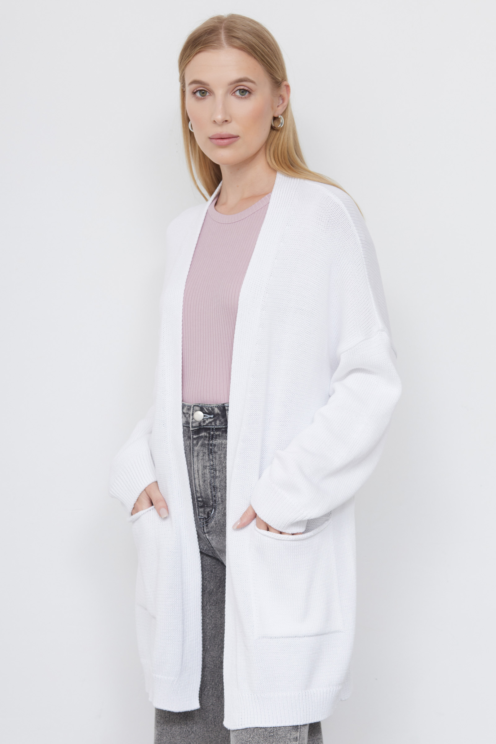 Удлиненный кардиган из мягкого вязаного трикотажа с рисунком на спинке.