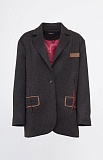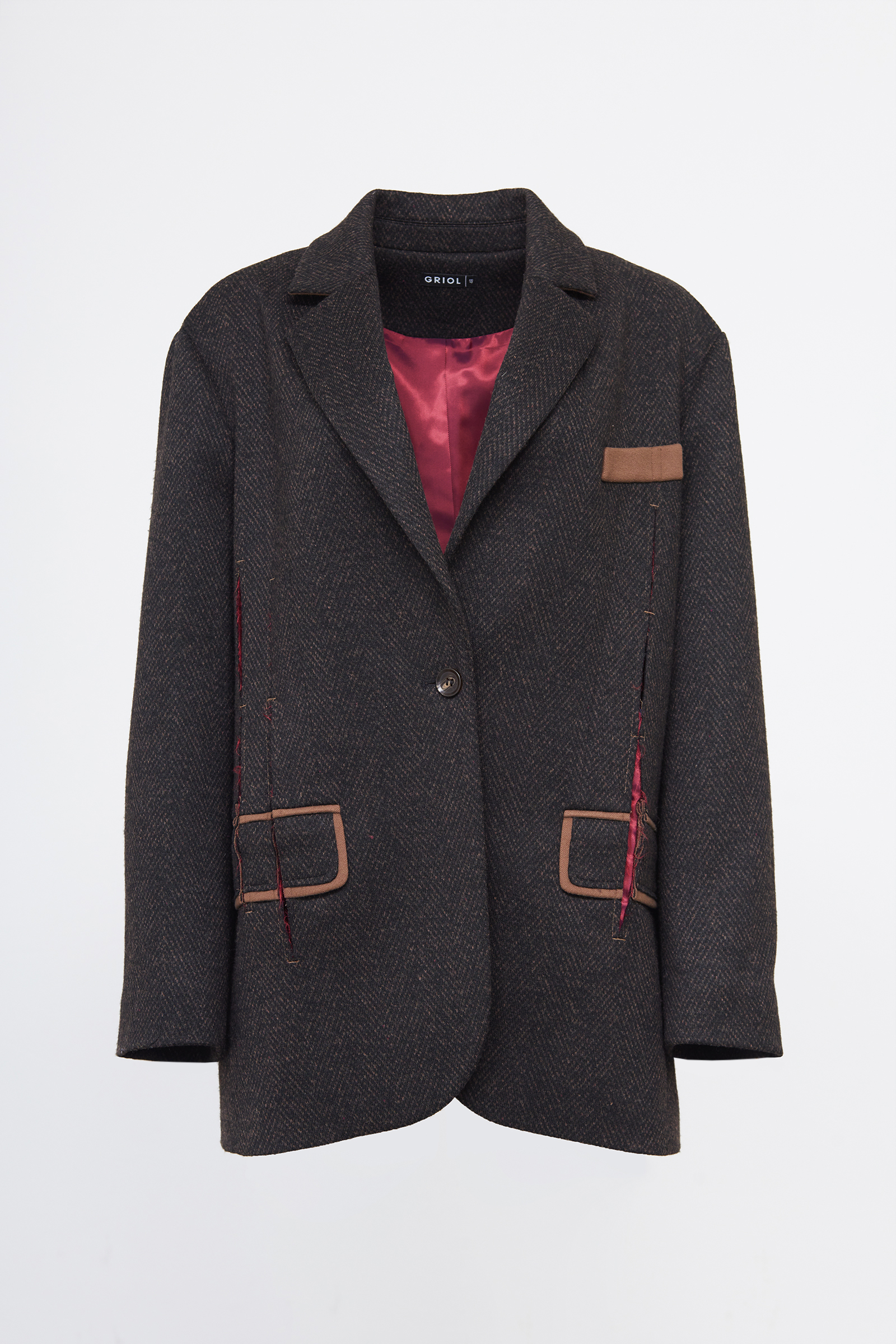 Жакет oversize из меланжевой костюмной ткани в елочку с декоративными разрезами и ложными карманами.