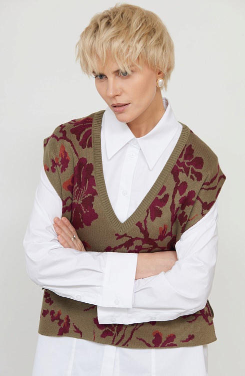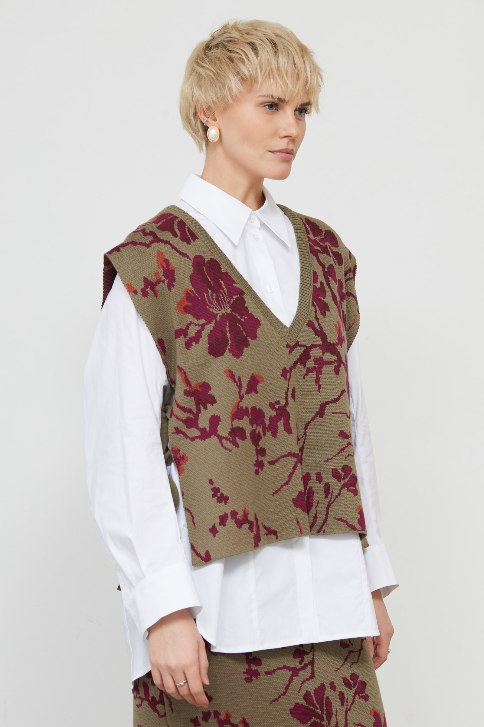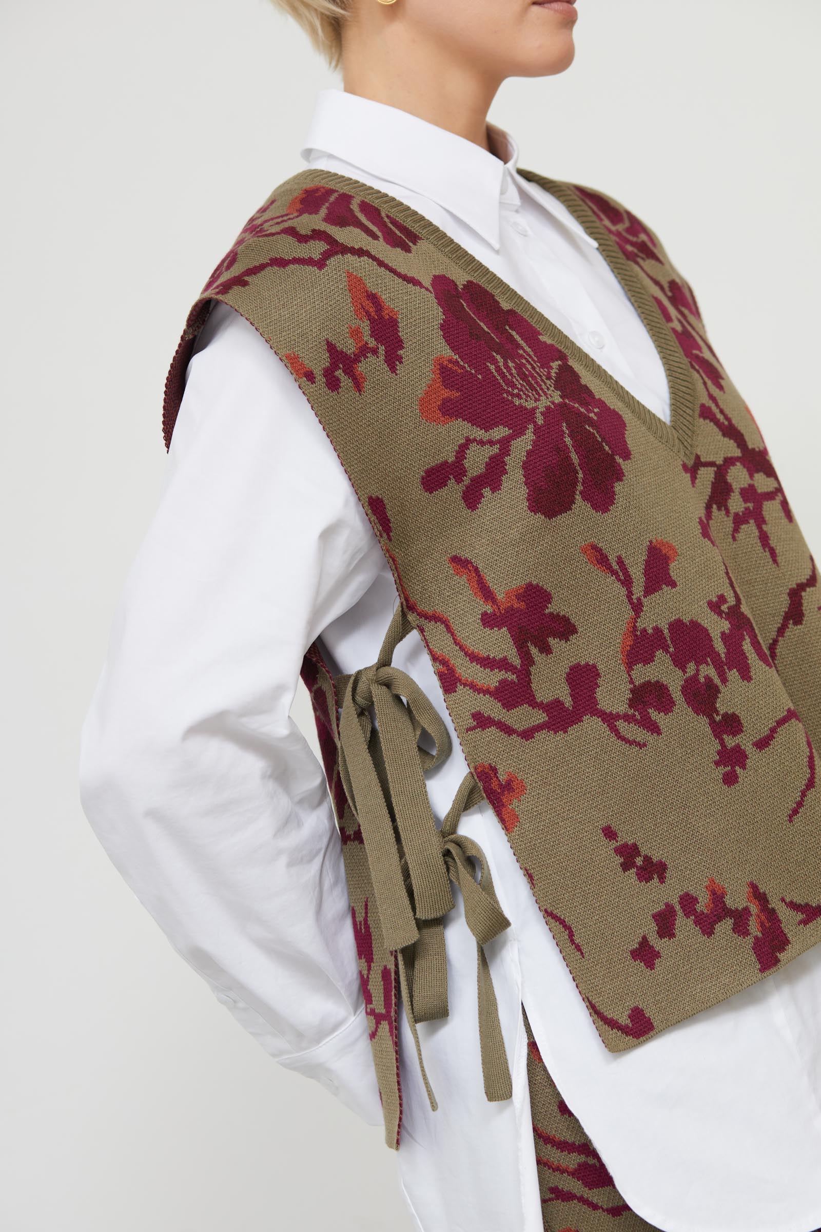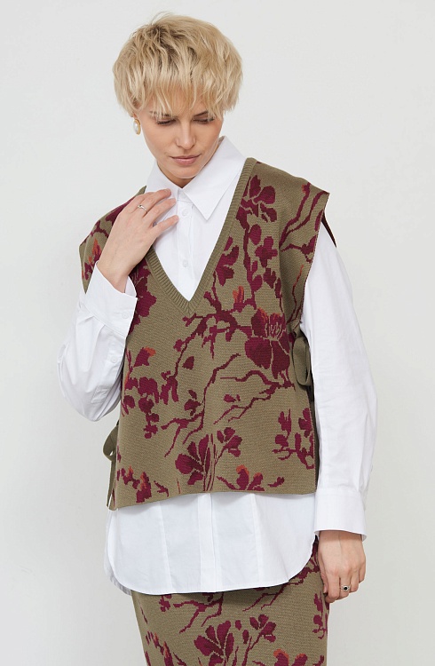 Жилет oversize из мягкого трикотажа жаккардовой вязки с завязками по бокам.