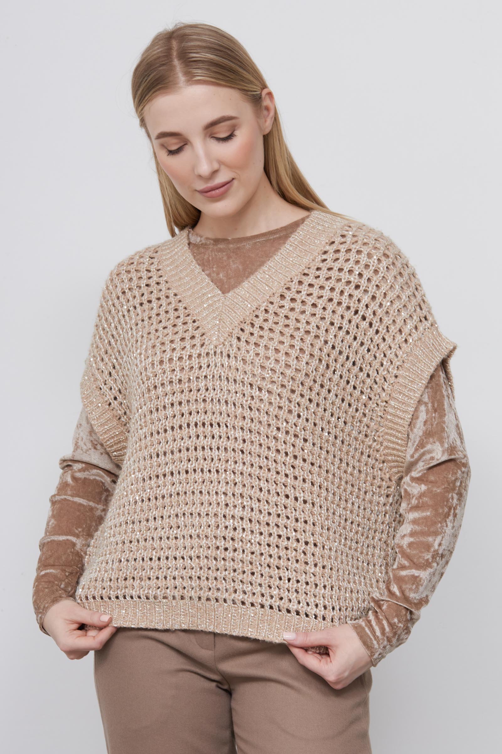 Жилет oversize крупной ажурной вязки с люрексом.