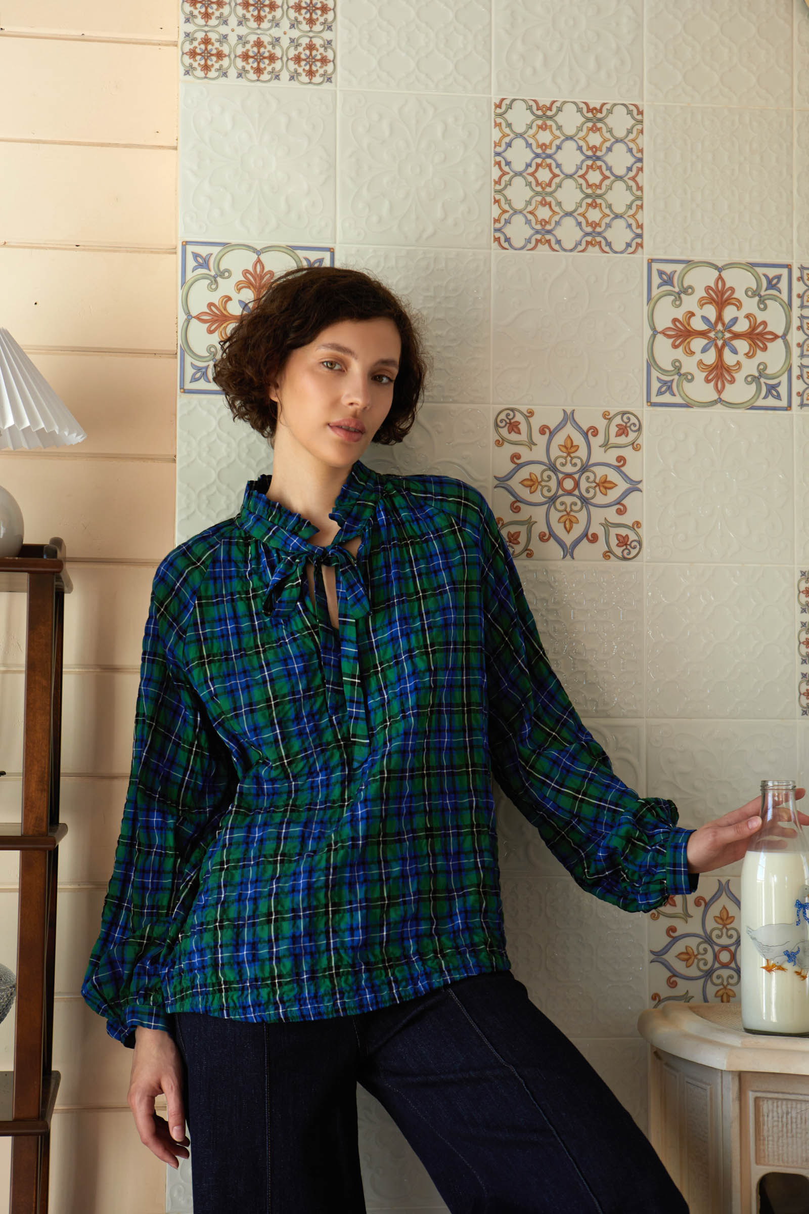 Блуза oversize из жатой вискозы в клетку с воротником аскот.