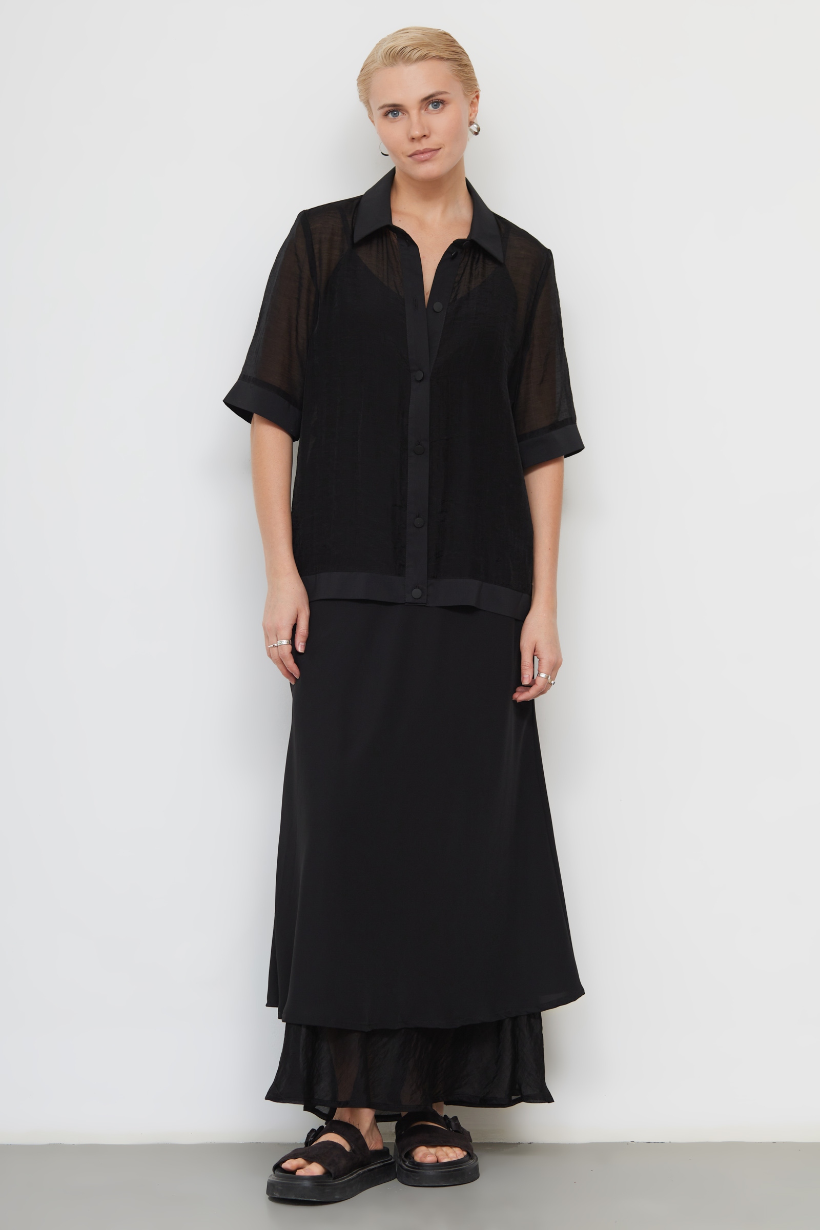 Рубашка oversize из шифона с короткими рукавами.