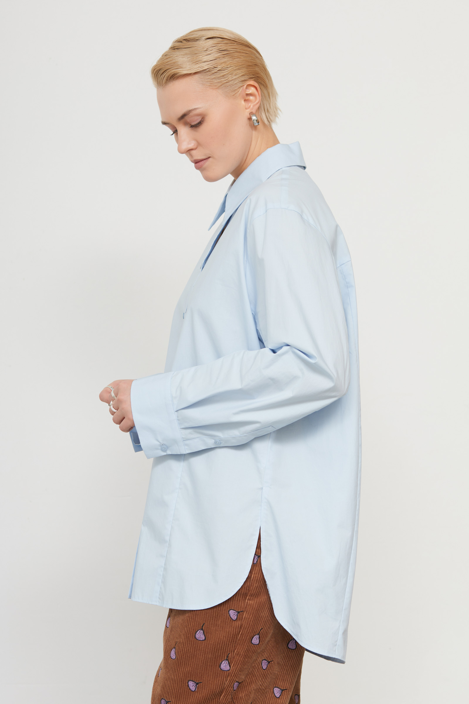 стояче-отложной воротник, рукав с манжетой, закругленный низ с разрезами по бокам