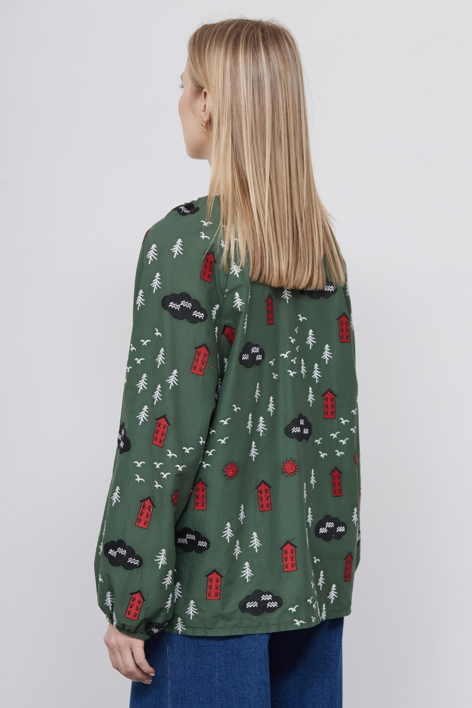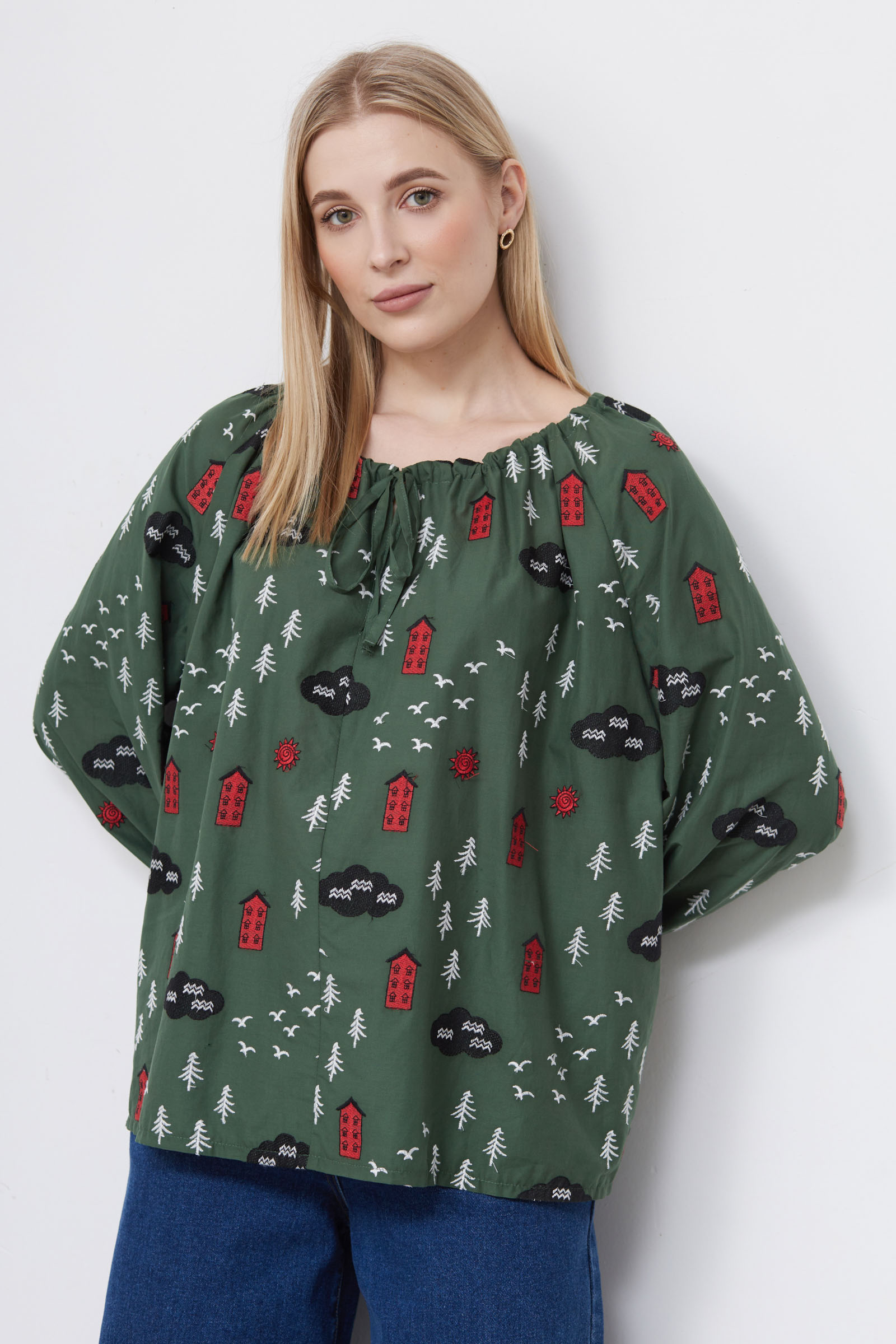 Блузка oversize из хлопка с вышивкой и сборкой на горловине.