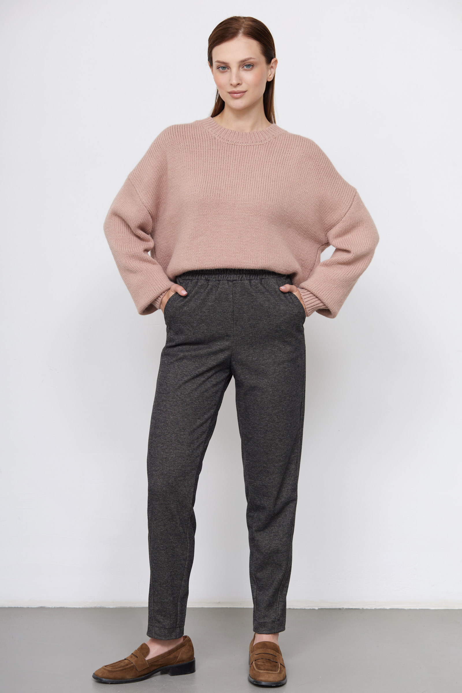 Брюки-бананы из мягкой поливискозы с шерстью на эластичном поясе с кулиской.