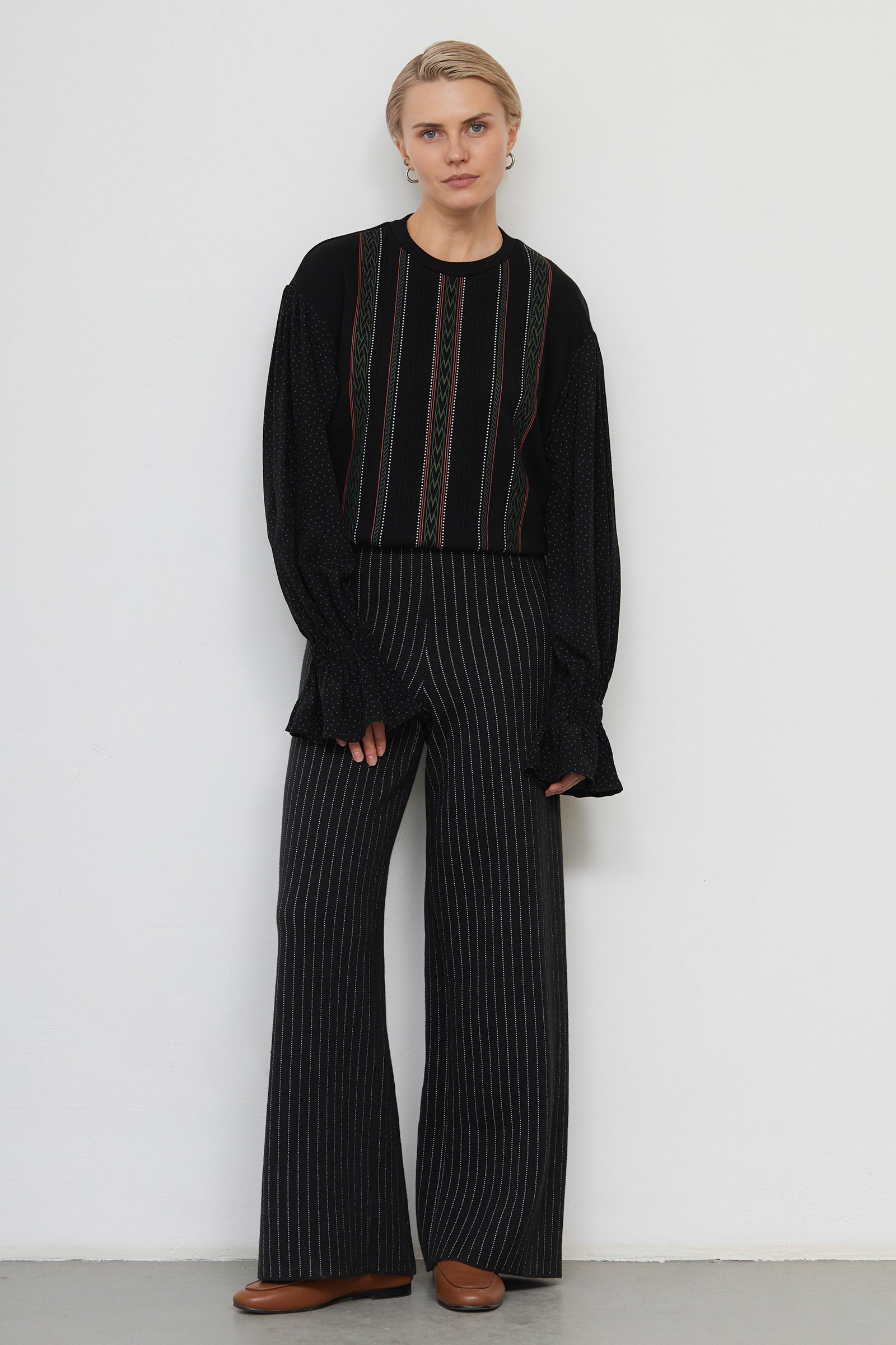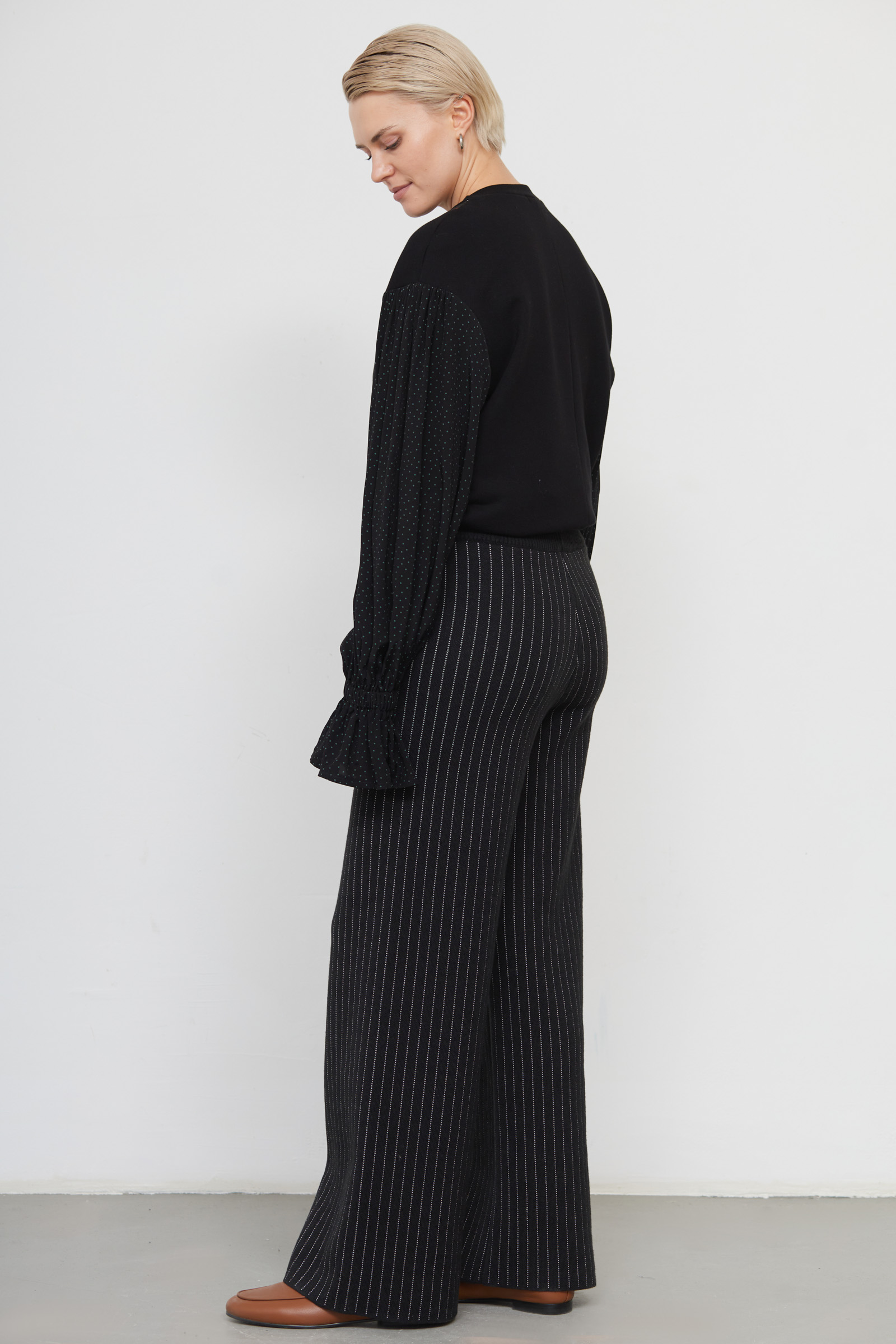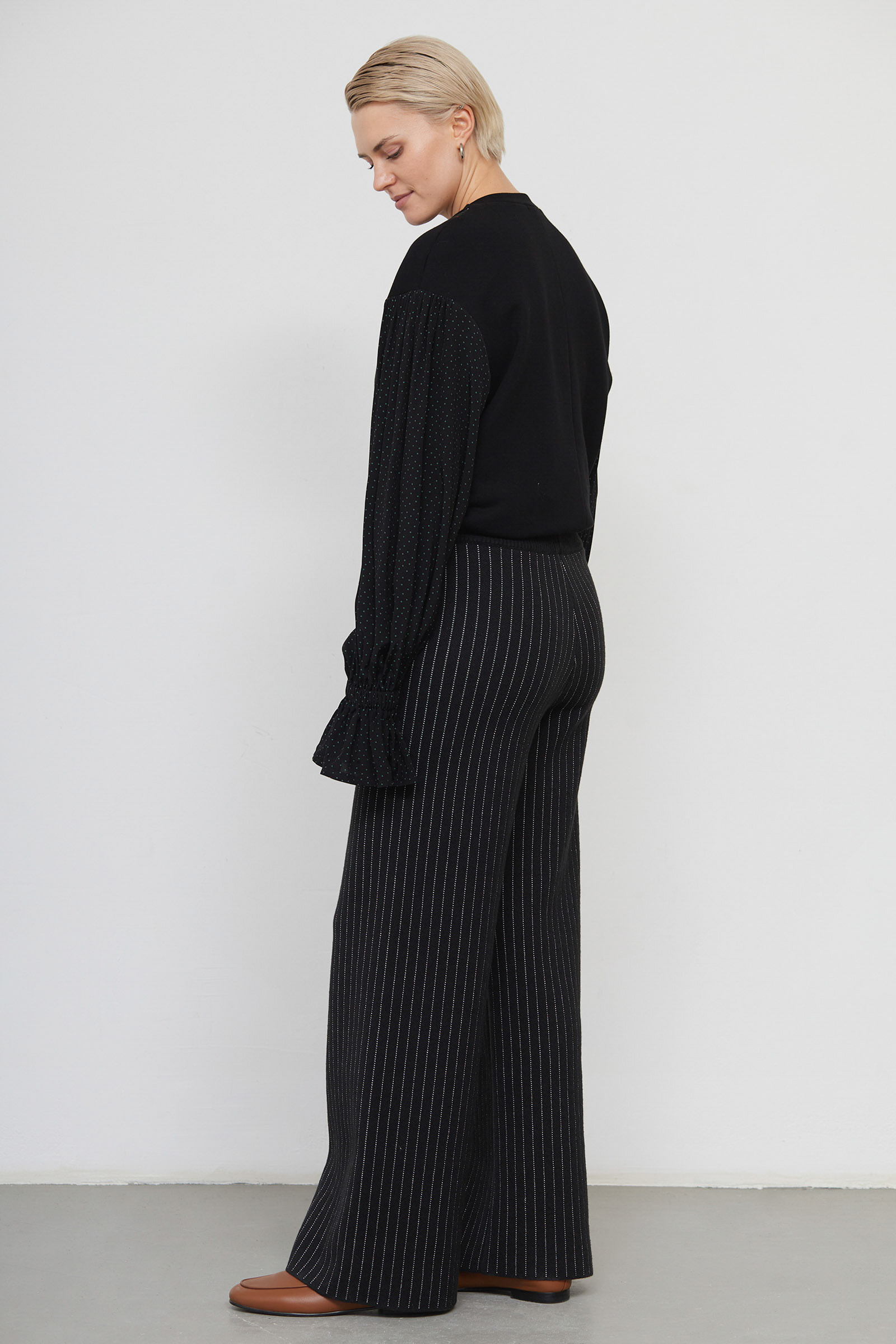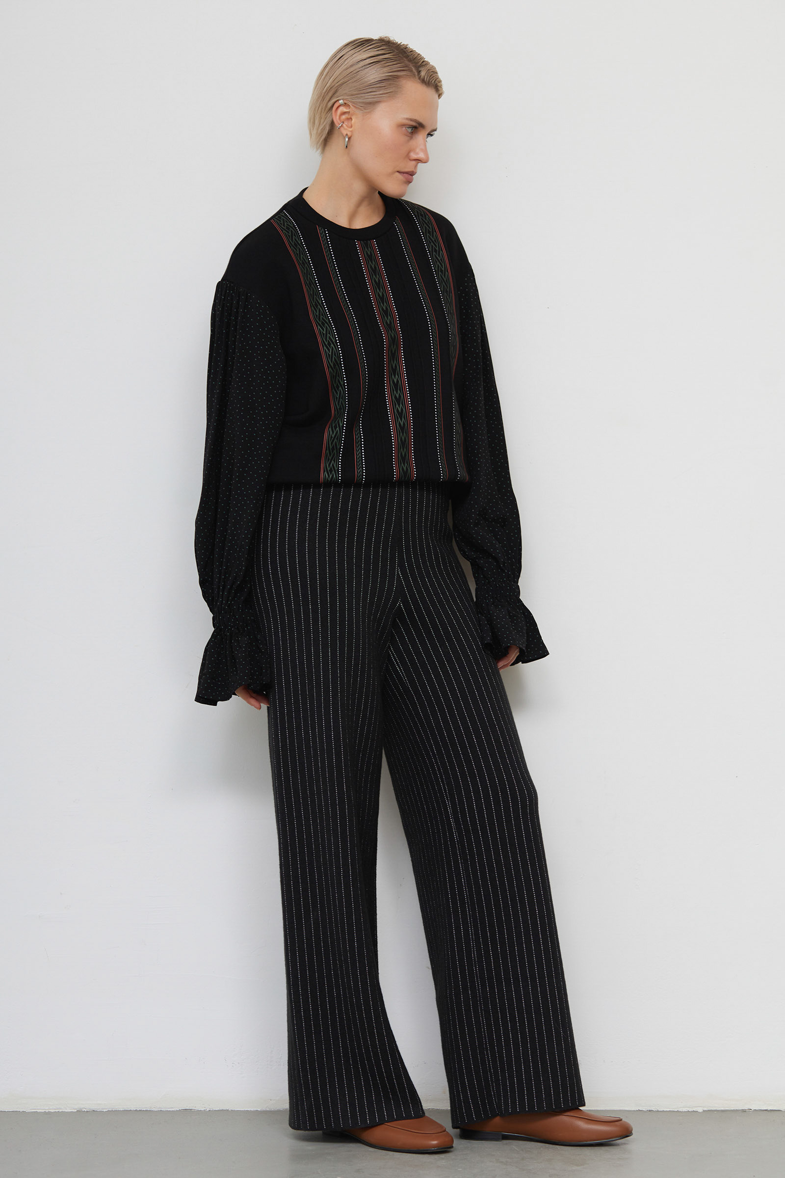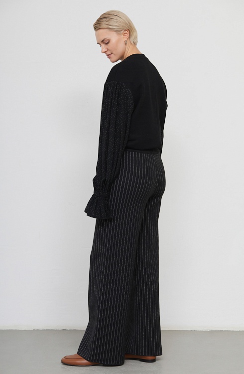 Широкие вязаные брюки в полоску на эластичном поясе.