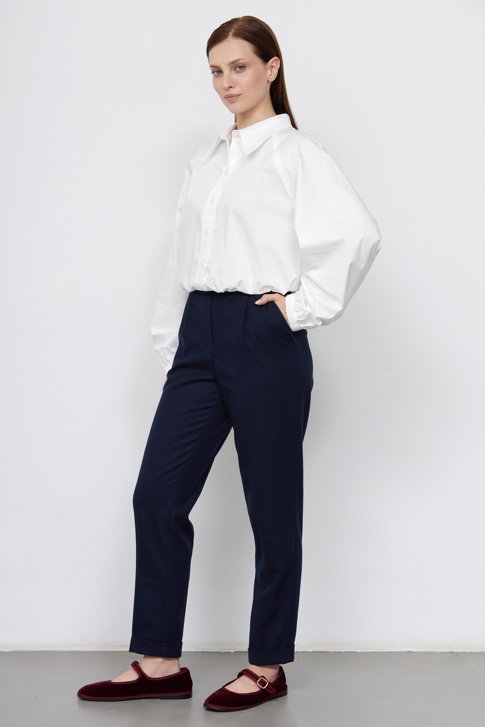 Зауженные брюки из мягкой фланелевой ткани на эластичном поясе.